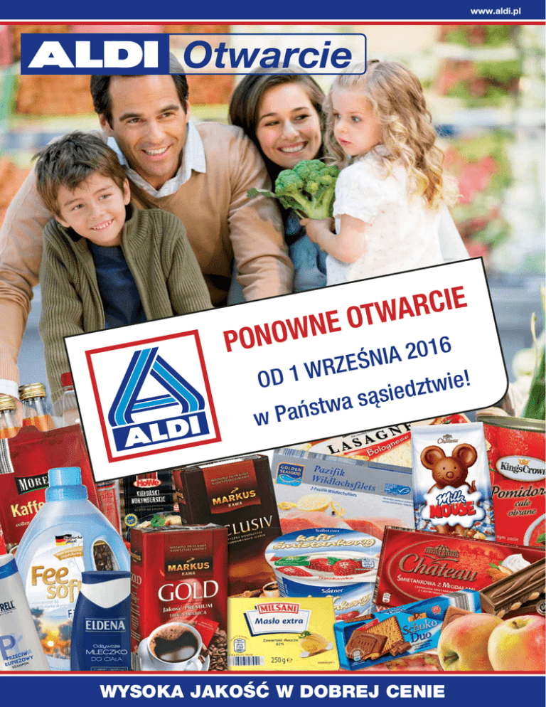 Otwarcie E I C R A W T O E N W O N PO IA 2016 N Ś E Z R e! OD 1 W i w t z d ie s ą s a tw s ń a P w WYSOKA JAKOŚĆ W DOBREJ CENIE Zastrzega się prawo do pomyłek i błędów w druku. SERDECZNIE WITAMY W Naszym celem jest… …aby konsumenci mogli kupować podstawowe artykuły spożywcze: • blisko domu • zawsze świeże • zawsze wysokiej jakości • zawsze w korzystnej cenie NA PAŃSTWA STOLE! Najwyższa jakość w najlepszej cenie. Kupujemy… …w tak dużych ilościach, że decydujemy o jakości produktów, gwarantujemy ich świeżość i kupujemy korzystniej, niż ci, którzy kupują mniej. Gwarantujemy… …wysoką jakość. Jest ona potwierdzana przez ciągłe, niezależne kontrole artykułów spożywczych. Öko-Test to niemiecki magazyn konsumencki wyróżniający produkty szczególnie wartościowe dla zdrowia i przyjazne dla środowiska. (sehr gut = bardzo dobry; gut = dobry) DLG to niezależna organizacja niemieckiego przemysłu rolniczego i przetwórczego, testująca jakość produktów spożywczych. Eksperci – naukowcy i praktycy – przyznają wyróżnionym produktom medale w kolorach: złotym, srebrnym i brązowym. 2 WYSOKA JAKOŚĆ W DOBREJ CENIE y MalinŻowA OFERTA ŚWIE Pomidor malinowy klasa I; kraj pochodzenia Polska Owoce & Warzywa I OWOCE WARZYWA U GAŁ Z ROE CZEGO DNIC CHŁ kg 3,45 Banany kg klasa I; kraj pochodzenia Ekwador/ Kostaryka/ Kolumbia 3,35 tylko najwyższej jakości Myte Świeże warzywa i owoce dostarczane są codziennie do naszych sklepów i podlegają surowej kontroli jakości. • Nasi dostawcy są starannie wybierani i muszą posiadać certyfikat GLOBAL G.A.P.-Standard*. • Specyfikacje produktów wydawane przez ALDI opierają się na kryteriach bardziej wymagających, niż jest to przewidziane prawem – szczególny nacisk kładzie ALDI na ścisłą kontrolę pod kątem ew. pozostałości pestycydów. Ziemniaki WYSOKA JAKOŚĆ W DOBREJ CENIE Absolutna świeżość i jakość oraz optymalny stosunek jakości do ceny – to motto ALDI, na którym zawsze możesz polegać. 0,69 *GLOBAL G.A.P.-Standard • Regularne analizy i badania wykonywane przez niezależne instytuty to gwarancja przestrzegania naszych wysokich standardów jakościowych. • Cały asortyment świeżych warzyw i owoców dostarczanych codziennie do naszych sklepów jest dokładnie kontrolowany przez specjalnie przeszkolonych pracowników. klasa I; kraj pochodzenia Polska kg Zobacz broszurkę Uznana na rynkach międzynarodowych norma dla produktów rolniczych, zobowiązująca do: - wysokiej jakości bezpieczeństwa produkcji - stosowania pestycydów tylko w ograniczonym stopniu - korzystania w rosnącym stopniu z zasobów naturalnych - ograniczenia negatywnego wpływu na środowisko do minimum (ochrona flory i fauny) - działania w sposób świadczący o poczuciu odpowiedzialności za zdrowie i bezpieczeństwo pracowników ZAPRASZAMY NA OTWARCIE NOWEGO MARKETU ALDI 3 Zastrzega się prawo do pomyłek i błędów w druku. Z naszego asortymentu Cieszymy się, że możemy Państwu zaoferować szeroki wybór wyśmienitego pieczywa. Niezależnie od tego, czy wybiorą Państwo nasze przepyszne bułeczki, znakomity chleb, chrupiące bagietki czy delikatne croissanty – gorące pieczywo przygotowywane kilka razy dziennie znajdą Państwo w najbliższym sklepie ALDI. Dzięki temu możemy zagwarantować świeżość naszego pieczywa od rana do wieczora - zgodnie z naszą zasadą: WYSOKA JAKOŚĆ W DOBREJ CENIE Ciabatta Ciastko duńskie z maliną kruche ciastko na bazie ciasta półfrancuskiego; z delikatnym kremem waniliowym w połączeniu z malinami Sztuka 100 g bułeczka pszenna na naturalnym zakwasie z chrupiącą skórką Kajzerka Sztuka 75 g pszenna bułeczka ze złocistą skórką 0,69 Bułka trójkątna wieloziarnista smaczna bułka wieloziarnista o chrupiącej skórce; siemię lniane, pestki słonecznika oraz odrobina słodu znakomicie dopełniają smak Sztuka 95 g 0,89 (100 g = 0,94) (100 g = 0,92) Sztuka 65 g 0,34 (100 g = 0,52) 1,79 Croissant maślany tradycyjny rogalik francuski; zawartość masła 24% Półbagietka pszenna wyśmienita z masłem, konfiturami lub ze słonymi dodatkami Cena za 100 g 0,99 Sztuka 51 g 0,99 (100 g = 1,94) Chleb staropolski chleb pszenno-żytni na naturalnym zakwasie z chrupiącą skórką 4 Sztuka 400 g 2,99 (kg = 7,48) Bułka z ziarnem dyni chrupiąca bułka z dużą zawartością ziarna dyni WYSOKA JAKOŚĆ W DOBREJ CENIE Sztuka 80 g 0,89 (100 g = 1,11) +SVEßGIɧ[MI^· ITMIG^][S Chleb wieloziarnisty Bułka zwykła chrupiąca bułeczka z mąki pszennej Sztuka 65 g chleb pszenno-żytni na naturalnym zakwasie z dużą zawartością ziaren 0,55 Sztuka 750 g 4,99 (kg = 6,65) Sztuka 175 g Bagietka czosnkowa 2,39 chrupiąca, pszenna bagietka z dużą zawartością masła czosnkowego (100 g = 1,37) (100 g = 0,85) Pasztecik z kapustą i pieczarkami z ziołową posypką Sztuka 90 g 1,29 (100 g = 1,43) Chleb razowy chleb mieszany na naturalnym zakwasie z pełnego ziarna Bagietka wiejska chrupiąca bagietka z mąki pszennej Sztuka 300 g Sztuka 500 g (kg = 6,63) (kg = 5,98) 1,99 ZAPRASZAMY NA OTWARCIE NOWEGO MARKETU ALDI 2,99 5 Zastrzega się prawo do pomyłek i błędów w druku. Z naszego asortymentu Niemiecka jakość CHATEAU® Czekolada z orzechami wykwintna czekolada w 4 smakach do wyboru: deserowa z orzechami laskowymi, śmietankowa z migdałami, bakaliowa lub pełnomleczna z rumem, rodzynkami i migdałami Opak. 200 g 7,49 (100 g = 3,75) Niemiecka jakość CHATEAU® Czekolada śmietankowa CHATEAU® Niemiecka jakość wykwintna czekolada w trzech smakach do wyboru: kawowośmietankowa, deserowa lub alpejska śmietankowa Mleczne myszki cukierki czekoladowe w kształcie myszek; z nadzieniem mlecznym lub karmelowym; czekolada pełnomleczna 41% Czekolada orzechowa Opak. 200 g 6,49 czekolada pełnomleczna; z całymi orzechami; Opak. 100 g zawartość orzechów laskowych 27% Niemiecka jakość (100 g = 3,25) 3,99 Opak. 130 g Niemiecka jakość 4,95 Wyk