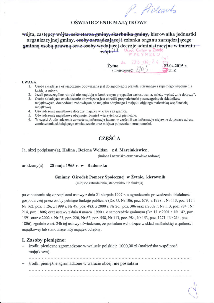 osoba składająca oświadczenie obowiązanajest okrcślić prłyna]eżnośćposzczególnych składników