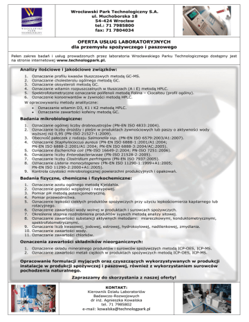 Wrocławski Park Technologiczny S.A. ul. Muchoborska 18 54-424 Wrocław tel.: 71 7985800 fax: 71 7804034 OFERTA USŁUG LABORATORYJNYCH dla przemysłu spożywczego i paszowego Pełen zakres badań i usług prowadzonych przez laboratoria Wrocławskiego Parku Technologicznego dostępny jest na stronie internetowej www.technologpark.pl. Analizy ilościowe i jakościowe związków: 1. 2. 3. 4. 5. 6. Oznaczanie profilu kwasów tłuszczowych metodą GC-MS. Oznaczanie cholesterolu ogólnego metodą GC. Oznaczanie oksysteroli metodą GC. Oznaczanie witamin rozpuszczalnych w tłuszczach (A i E) metodą HPLC. Spektrofotometryczne oznaczanie polifenoli metodą Folina – Ciocalteu (profil ogólny). Oznaczenie konserwantów w żywności metodą HPLC. W opracowywaniu metody analityczne: Oznaczanie witamin D3, K1 i K2 metodą HPLC. Oznaczanie zawartości kofeiny metodą GC. Badania mikrobiologiczne: 1. Oznaczanie ogólnej liczby drobnoustrojów (PN-EN ISO 4833:2004). 2. Oznaczanie liczby drożdży i pleśni w produktach żywnościowych lub paszy o aktywności wody wyższej niż 0,95 (PN-ISO 21527-1:2009). 3. Obecność pałeczek z rodzaju Salmonella ssp. (PN-EN ISO 6579:2003/A1:2007). 4. Oznaczanie Staphylococcus aureus (PN-EN ISO 6888-1:2001/A1:2004; PN-EN ISO 6888-2:2001/A1:2004; PN-EN ISO 6888-3:2004/AC:2005). 5. Oznaczanie Escherichia coli (PN-ISO 16649-2:2004; PN-ISO 7251:2006). 6. Oznaczanie liczby Enterobacteriaceae (PN-ISO 21528-2:2005). 7. Oznaczanie liczby Clostridium perfringens (PN-EN ISO 7937:2005). 8. Oznaczanie Listeria monocytogenes (PN-EN ISO 11290-1:1999+A1:2005; PN-EN ISO 11290-2:2000+A1:2005). 9. Kontrola czystości mikrobiologicznej powierzchni produkcyjnych i opakowań. Badania fizyczne, chemiczne i fizykochemiczne: 1. 2. 3. 4. 5. 6. 7. 8. 9. 10. 11. Oznaczanie azotu ogólnego metodą Kjeldahla. Oznaczenie gęstości względnej i nasypowej. Pomiar pH metodą potencjometryczną. Pomiar przewodnictwa. Oznaczenie lepkości ciekłych produktów spożywczych przy użyciu lepkościomierza kapilarnego lub rotacyjnego. Oznaczenie zawartości wody wolnej w produktach i surowcach spożywczych. Określenie stopnia rozdrobnienia produktów sypkich metodą analizy sitowej. Oznaczanie zawartości substancji aktywnych metodami: miareczkowymi, konduktometrycznymi, spektrofotometrycznymi. Oznaczanie liczb kwasowej, jodowej, estrowej, hydroksylowej, nadtlenkowej, zmydlania. Oznaczanie zawartości wody. Oznaczanie zawartości chlorków. Oznaczenia zawartości składników nieorganicznych: 1. Oznaczenie składu mineralnego produktów i surowców spożywczych metodą ICP-OES, ICP-MS. 2. Oznaczanie zawartości metali ciężkich w produktach spożywczych metodą ICP-OES, ICP-MS. Opracowanie formulacji myjących oraz czyszczących wykorzystywanych w produkcji instalacje w produkcji spożywczej i paszowej, również z wykorzystaniem surowców pochodzenia naturalnego. Zapraszamy do skorzystania z naszej oferty! KONTAKT: Kierownik Działu Laboratoriów Badawczo-Rozwojowych dr inż. Agnieszka Kowalska tel. 71 7985802 e-mail: [email protected]