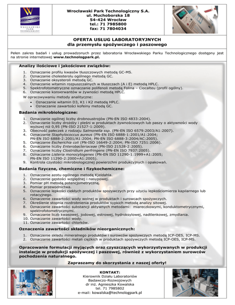 OFERTA USŁUG LABORATORYJNYCH dla przemysłu