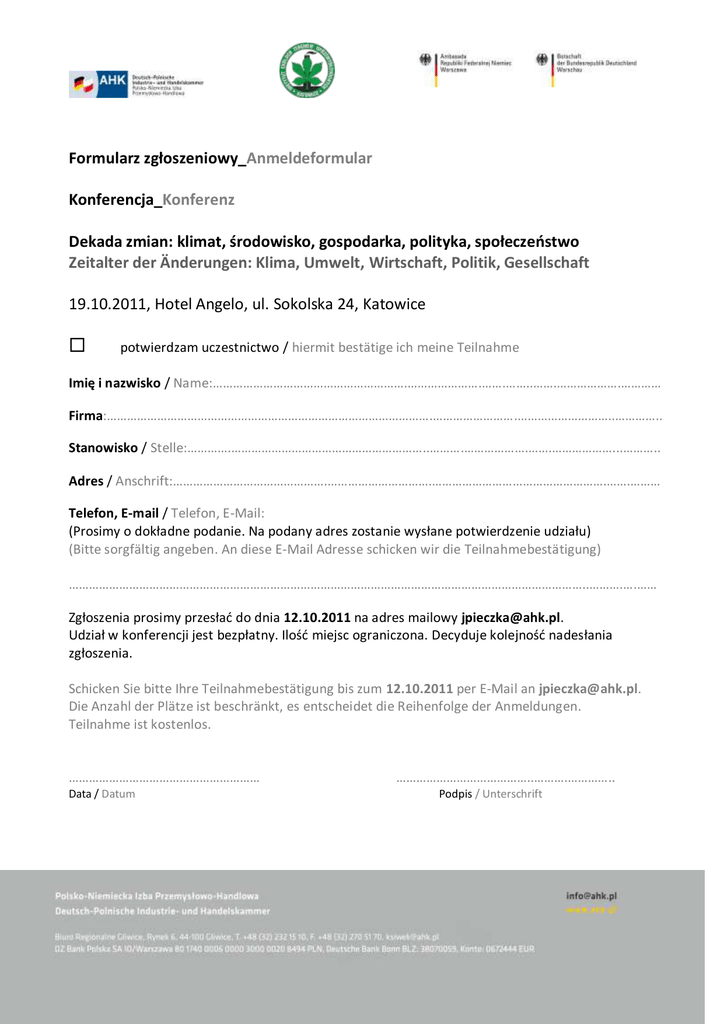 Formularz zgłoszeniowy_Anmeldeformular Konferencja_Konferenz Dekada zmian: klimat, środowisko, gospodarka, polityka, społeczeństwo Zeitalter der Änderungen: Klima, Umwelt, Wirtschaft, Politik, Gesellschaft 19.10.2011, Hotel Angelo, ul. Sokolska 24, Katowice potwierdzam uczestnictwo / hiermit bestätige ich meine Teilnahme Imię i nazwisko / Name:………………………………………………….………………….…….……..…….……………….………… Firma:…………………………………………………………………………………….…………………….………………………..………….. Stanowisko / Stelle:………….…………………………………………………..……….……………….…….………………...……….. Adres / Anschrift:……………………………………….………………………….…………………………………………….…….……… Telefon, E-mail / Telefon, E-Mail: (Prosimy o dokładne podanie. Na podany adres zostanie wysłane potwierdzenie udziału) (Bitte sorgfältig angeben. An diese E-Mail Adresse schicken wir die Teilnahmebestätigung) ………………………………………………………………………………………………………………………………………..……….….…… Zgłoszenia prosimy przesłać do dnia 12.10.2011 na adres mailowy [email protected]. Udział w konferencji jest bezpłatny. Ilość miejsc ograniczona. Decyduje kolejność nadesłania zgłoszenia. Schicken Sie bitte Ihre Teilnahmebestätigung bis zum 12.10.2011 per E-Mail an [email protected]. Die Anzahl der Plätze ist beschränkt, es entscheidet die Reihenfolge der Anmeldungen. Teilnahme ist kostenlos. ………………………………………………… Data / Datum …………………………………..……….………….. Podpis / Unterschrift