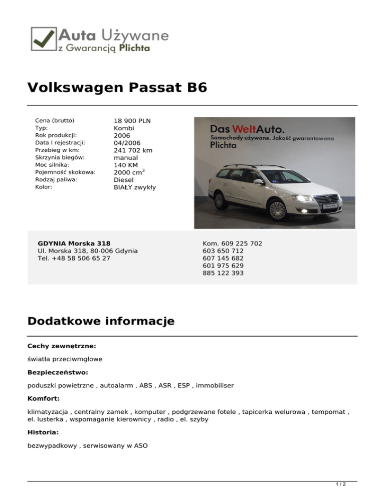 Volkswagen Passat B6 Cena (brutto) Typ: Rok produkcji: Data I rejestracji: Przebieg w km: Skrzynia biegów: Moc silnika: Pojemność skokowa: Rodzaj paliwa: Kolor: 18 900 PLN Kombi 2006 04/2006 241 702 km manual 140 KM 2000 cm3 Diesel BIAŁY zwykły GDYNIA Morska 318 Ul. Morska 318, 80-006 Gdynia Tel. +48 58 506 65 27 Kom. 609 225 702 603 650 712 607 145 682 601 975 629 885 122 393 Dodatkowe informacje Cechy zewnętrzne: światła przeciwmgłowe Bezpieczeństwo: poduszki powietrzne , autoalarm , ABS , ASR , ESP , immobiliser Komfort: klimatyzacja , centralny zamek , komputer , podgrzewane fotele , tapicerka welurowa , tempomat , el. lusterka , wspomaganie kierownicy , radio , el. szyby Historia: bezwypadkowy , serwisowany w ASO 1/2 Gwarancja Szanowni Państwo, Pragniemy Państwa poinformować, iż firma Plichta – Autoryzowany Dealer Škoda Auto prowadzi skup oraz sprzedaż samochodów używanych wszystkich marek, oferując także samochody używane z gwarancją objęte programem „Auta używane z Gwarancją Plichta”. W ramach programu „Auta Używane z Gwarancją Plichta ” każdy Klient otrzymuje atrakcyjny pakiet zniżek pozwalający zoptymalizować koszty eksploatacji samochodu: -50% na serwis klimatyzacji -50% na ustawienie zbieżności -50% na kosmetykę auta -50% na ścieżkę diagnostyczną -25% na wymiany oleju -25% na zakup opon + 5zł na sezon za hotelowanie opon -15% na części i akcesoria Oferujemy również kompleksową obsługę w zakresie finansowania i ubezpieczenia: - kredyty już od 4,99% - leasingi i kredyty bez zaświadczeń - uproszczone procedury – decyzja już od 30 min. - atrakcyjne pakiety AC/OC/NW/ASS wiodących firm ubezpieczeniowych Możliwość pozostawienia dotychczas użytkowanego auta w rozliczeniu – BEZPŁATNA WYCENA!!! Zapraszamy wszystkich Klientów na jazdę próbną wybranym autem. Numer oferty: E049 Informacja nie stanowi oferty w rozumieniu art. 66 KC. Podane dane mają charakter wyłącznie informacyjny. 2/2 Powered by TCPDF (www.tcpdf.org)