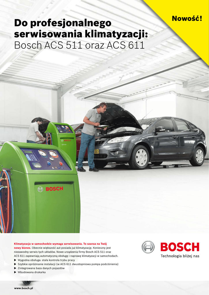Do profesjonalnego serwisowania klimatyzacji: Bosch ACS 511 oraz ACS 611 Klimatyzacja w samochodzie wymaga serwisowania. To szansa na Twój nowy biznes. Obecnie większość aut posiada już klimatyzację. Konieczny jest niezawodny serwis tych układów. Nowe urządzenia firmy Bosch ACS 511 oraz ACS 611 zapewniają automatyczną obsługę i naprawę klimatyzacji w samochodach. u Wygodna obsługa: stała kontrola trybu pracy u Szybkie opróżnianie instalacji (w ACS 611 dwustopniowa pompa podciśnienia) u Zintegrowana baza danych pojazdów u Wbudowana drukarka www.bosch.pl Nowość!