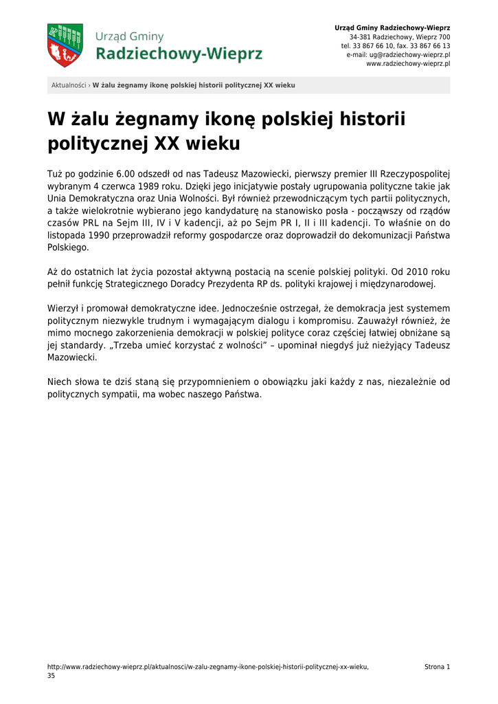 Urząd Gminy Radziechowy-Wieprz 34-381 Radziechowy, Wieprz 700 tel. 33 867 66 10, fax. 33 867 66 13 e-mail: [email protected] www.radziechowy-wieprz.pl Aktualności › W żalu żegnamy ikonę polskiej historii politycznej XX wieku W żalu żegnamy ikonę polskiej historii politycznej XX wieku Tuż po godzinie 6.00 odszedł od nas Tadeusz Mazowiecki, pierwszy premier III Rzeczypospolitej wybranym 4 czerwca 1989 roku. Dzięki jego inicjatywie postały ugrupowania polityczne takie jak Unia Demokratyczna oraz Unia Wolności. Był również przewodniczącym tych partii politycznych, a także wielokrotnie wybierano jego kandydaturę na stanowisko posła - począwszy od rządów czasów PRL na Sejm III, IV i V kadencji, aż po Sejm PR I, II i III kadencji. To właśnie on do listopada 1990 przeprowadził reformy gospodarcze oraz doprowadził do dekomunizacji Państwa Polskiego. Aż do ostatnich lat życia pozostał aktywną postacią na scenie polskiej polityki. Od 2010 roku pełnił funkcję Strategicznego Doradcy Prezydenta RP ds. polityki krajowej i międzynarodowej. Wierzył i promował demokratyczne idee. Jednocześnie ostrzegał, że demokracja jest systemem politycznym niezwykle trudnym i wymagającym dialogu i kompromisu. Zauważył również, że mimo mocnego zakorzenienia demokracji w polskiej polityce coraz częściej łatwiej obniżane są jej standardy. „Trzeba umieć korzystać z wolności” – upominał niegdyś już nieżyjący Tadeusz Mazowiecki. Niech słowa te dziś staną się przypomnieniem o obowiązku jaki każdy z nas, niezależnie od politycznych sympatii, ma wobec naszego Państwa. http://www.radziechowy-wieprz.pl/aktualnosci/w-zalu-zegnamy-ikone-polskiej-historii-politycznej-xx-wieku, 35 Strona 1