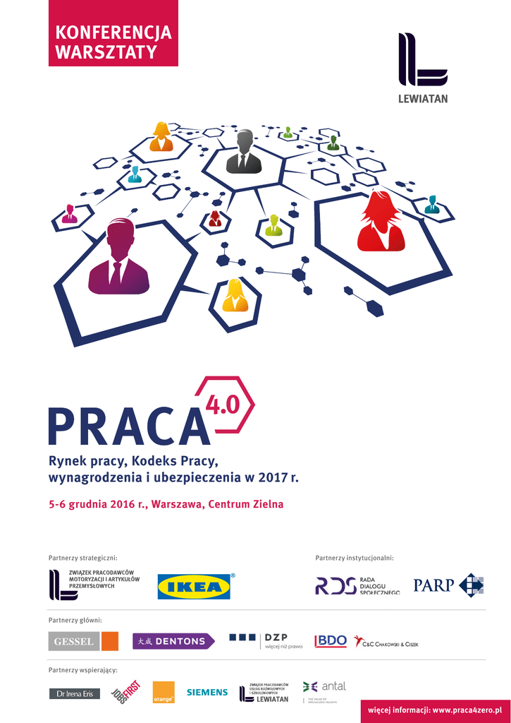 KONFERENCJA WARSZTATY Rynek pracy, Kodeks Pracy, wynagrodzenia i ubezpieczenia w 2017 r. 5-6 grudnia 2016 r., Warszawa, Centrum Zielna Partnerzy strategiczni: Partnerzy instytucjonalni: Partnerzy główni: Partnerzy wspierający: więcej informacji: www.praca4zero.pl KONFERENCJA WARSZTATY Rynek pracy, Kodeks Pracy, wynagrodzenia i ubezpieczenia w 2017 r. 5-6 grudnia 2016 r., Warszawa, Centrum Zielna Praca 4.0 czyli przygotuj się na zmiany na rynku pracy OFERTA SPECJALNA – debaty oraz 12 warsztatów eksperckich (rynek pracy, wynagrodzenia, ochrona danych, prawo pracy) tylko do 18.11.2016 r. ! Zapraszamy na dwudniowe spotkanie ludzi, którzy kształtują rynek pracy w Polsce. W debatach, panelach i warsztatach wezmą udział przedstawiciele ministerstw, ZUS, PIP, Komisji Kodyfikacyjnej, szefowie HR, prawnicy z najlepszych kancelarii, naukowcy itp. Dowiedz się o nadchodzących zmianach, wymień doświadczenia, poznaj znakomitych ekspertów. Działania instytucji rynku pracy oraz kształt prawa pracy przekładają się bezpośrednio na koszty funkcjonowania firm. Pierwszego dnia, podczas paneli i debat porozmawiamy o kierunkach zmian na szeroko pojętym rynku pracy. Zastanowimy się jak stworzyć w Polsce atrakcyjny rynek pracy. Drugiego dnia odbędzie się aż 12 warsztatów ze znakomitymi ekspertami! Wśród tematów znajdą się m.in.: –– programy aktywnej restrukturyzacji zatrudnienia –– ochrona danych osobowych – co trzeba wiedzieć o nowym Rozporządzeniu UE? –– tendencje w kształtowaniu wynagrodzeń –– czas pracy – optymalizacja kosztów i zarządzania personelem –– restrukturyzacja przedsiębiorstw –– delegowanie pracowników –– budowanie różnorodności i kultury przynależności –– czy pracodawca musi promować poprawność polityczną wobec różnorodności w środowisku pracy? Zmiany na rynku pracy galopują. Sam 2016 rok przyniósł nowe zasady zatrudniania na czas określony, stosowania urlopów rodzicielskich czy oskładkowana umów cywilnych. Od 2017 roku pojawi się minimalna stawka godzinowa i prawdopodobnie możliwość zrzeszania w związkach zawodowych osób zatrudnionych na umowach cywilnych i samozatrudnionych oraz nowe zasady pracy tymczasowej. Rozpoczęły się prace nad całkiem nowymi Kodeksami Pracy. Równocześnie na sytuację rynku pracy wpłyną m.in. Strategia Odpowiedzialnego Rozwoju czy globalne trendy, które stawiają HR przed nowymi zadaniami. Mnożą się pytania. Zarówno te przekrojowe, np. na ile SOR odpowie na wyzwania rynku pracy? Jak w Polsce stworzyć miejsce pracy atrakcyjne dla mobilnych fachowców? Ale też bardzo bieżące np. czy regulacje czasu pracy pozostaną elastyczne? Jak uprościć i odbiurokratyzować prawo pracy? Do zobaczenia! Konfederacja Lewiatan Chętnie odpowiemy na Państwa pytania Sylwia Włodarska Departament Konferencji [email protected] tel. 22 55 99 938 Robert Lisicki Ekspert Departamentu Pracy, Dialogu i Spraw Społecznych [email protected] tel. 22 55 99 914 więcej informacji: www.praca4zero.pl KONFERENCJA WARSZTATY Rynek pracy, Kodeks Pracy, wynagrodzenia i ubezpieczenia w 2017 r. 5-6 grudnia 2016 r., Warszawa, Centrum Zielna PROGRAM | Dzień I 12:00 Rejestracja 13.00 – 14.00 Przyszłość rynku pracy w Polsce – rozwój kapitału ludzkiego i rynku pracy w Strategii Odpowiedzialnego Rozwoju. Czego nam potrzeba i jak to osiągnąć? Jak Polska może stać się atrakcyjniejszym rynkiem pracy? Na ile Strategia Odpowiedzialnego Rozwoju odpowiada na współczesne i przyszłe wyzwania rynku pracy? Jaka jest rola Rady Dialogu Społecznego, organizacji pracodawców i związków zawodowych w budowaniu nowoczesnego i atrakcyjnego rynku pracy? Uczestnicy: - Henryka Bochniarz – przewodnicząca Rady Dialogu Społecznego (RDS), prezydent Konfederacji Lewiatan - Stanisław Szwed – sekretarz stanu w Ministerstwie Rodziny, Pracy i Polityki Społecznej - Paweł Chorąży – podsekretarz stanu w Ministerstwie Rozwoju - Bogdan Kubiak – zastępca przewodniczącego KK NSZZ „Solidarność” 14.00 – 15.00 Jakie ma być Prawo pracy dla gospodarki 4.0? Wizja prawa pracy w Komisji Kodyfikacyjnej – debata. Co zmienić w prawie stosunku pracy? Czy regulacje czasu pracy pozostaną elastyczne? Jak uprościć i odbiurokratyzować prawo pracy? Jaka jest nowa wizja zbiorowego prawa pracy? Uczestnicy: - prof. UG dr hab. Marcin Zieleniecki – przewodniczący Komisji Kodyfikacyjnej Prawa Pracy - mec. dr Liwiusz Laska – zastępca przewodniczącego Komisji - prof. UW dr hab. Jacek Męcina – członek Komisji, doradca zarządu Konfederacji Lewiatan 15.15 – 16.15 Jak zbudować w Polsce globalnie atrakcyjny rynek pracy – dyskusja dyrektorów HR. Jak radzić sobie na nowym rynku konkurującym o wykwalifikowanego pracownika? Czy wielokulturowość może pomóc? Jak tworzyć regulacje, które pozwolą działom HR rozwinąć skrzydła? Jaką rolę ma rząd i samorządy we wsparciu rozwoju krajowego i lokalnych rynków pracy? Uczestnicy: - Michał Pióro – dyrektor HR, IKEA Retail - Bożena Stępień – dyrektor personalny, Laboratorium dr Irena Eris - Wiesława Czarnecka-Stańczak – dyrektor ds. zarządzania personelem, Siemens - Joanna Włodarczyk – dyrektor ds. pracowniczych, Orange Polska Baza usług rozwojowych i Sektorowe Rady Kompetencji – szansa dla rynku szkoleniowo-doradczego, szanse dla rozwoju kapitału ludzkiego firm – prezentacja Polskiej Agencji Rozwoju Przedsiębiorczości. Prowadzący: - Beata Świercz i Rafał Kamiński – Polska Agencja Rozwoju Przedsiębiorczości 16.15 – 17.15 17.15 – 17.30 Podsumowanie 18.00 – 20.00 Event networkingowy więcej informacji: www.praca4zero.pl KONFERENCJA WARSZTATY Rynek pracy, Kodeks Pracy, wynagrodzenia i ubezpieczenia w 2017 r. 5-6 grudnia 2016 r., Warszawa, Centrum Zielna PROGRAM | Dzień II – Równoległe warsztaty tematyczne 9.00 – 10:45 RYNEK PRACY WYNAGRODZENIA UBEZPIECZENIA OCHRONA DANYCH PRAWO PRACY Wyzwania dla przed
