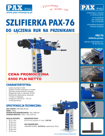 www.pax-maszyny.pl 72-002 Dołuje k. Szczecina ul. Słoneczny Sad 4C SZLIFIERKA PAX-76 tel. 91 435 84 34 kom. 505 812 505 kom. 513 905 405 [email protected] www.pax-maszyny.pl DO ŁĄCZENIA RUR NA PRZENIKANIE PAX-76 Szlifierka pasowa zakres szlifowania rur: Ø 20-76 mm CENA PROMOCYJNA 8500 PLN NETTO CHARAKTERYSTYKA: ź ź ź ź ź ź ź ź Łatwa wymiana rolek Szybki montaż materiału w imadle Wysoka powtarzalność operacji Regulacja kąta w zakresie 35-90° Możliwość gratowania materiału 7 rolek w zestawie Dostępne rolki Ø 20 - 76 mm 2 lata gwarancji SPECYFIKACJA TECHNICZNA: MOC SILNIKA: 3kW 2800 obr/min WAGA: 190 kg WYMIAR PASA BEZKOŃCOWEGO: 100 x 2000 mm WYMIARY MASZYNY: 1450 x 1150 x 650 mm ROLKI W ZESTAWIE: ź Ø 21 mm ź Ø 25 mm ź Ø 32 mm ź Ø 42 mm ź Ø 51 mm ź Ø 60 mm ź Ø 76 mm DODATKOWE ROLKI: Ø 20-76 mm (rozstaw co 1 mm) - 390 PLN PASY BEZKOŃCOWE: 100x2000 P36/P40 - 30 PLN/szt. (opakowanie 10szt.) do cen należy doliczyć podatek VAT www.pax-maszyny.pl 72-002 Dołuje k. Szczecina ul. Słoneczny Sad 4C tel. 91 435 84 34 kom. 505 812 505 kom. 513 905 405 SZLIFIERKA PAX-90 [email protected] www.pax-maszyny.pl DO ŁĄCZENIA RUR NA PRZENIKANIE PAX-90 Szlifierka pasowa zakres szlifowania rur: Ø 17-90 mm SERIA GRD CENA PROMOCYJNA 9500 PLN NETTO CHARAKTERYSTYKA: ź ź ź ź ź ź ź Łatwa wymiana rolek Szybki montaż materiału w imadle Wysoka powtarzalność operacji Regulacja kąta w zakresie 40-90° 10 rolek w zestawie Dostępne rolki Ø 17 - 90 mm 2 lata gwarancji SPECYFIKACJA TECHNICZNA: MOC SILNIKA: 2,2kW 2800 obr/min WAGA: 175 kg ROZMIAR PASA BEZKOŃCOWEGO: 100 x 1250 mm WYMIARY MASZYNY: 600 x 1000 x 1150 mm ROLKI W ZESTAWIE: ź Ø 19 mm ź Ø 21 mm ź Ø 25 mm ź Ø 32 mm ź Ø 38 mm ź Ø 42 mm ź Ø 48 mm ź Ø 51 mm ź Ø 60 mm ź Ø 76 mm DODATKOWE ROLKI: Ø 17-76 mm (rozstaw co 1 mm) - 390 PLN Ø 77-90 mm (rozstaw co 1 mm) - 490 PLN PASY BEZKOŃCOWE: 100x1250 P36/P40 - 20 PLN/szt. (opakowanie 10szt.) do cen należy doliczyć podatek VAT
