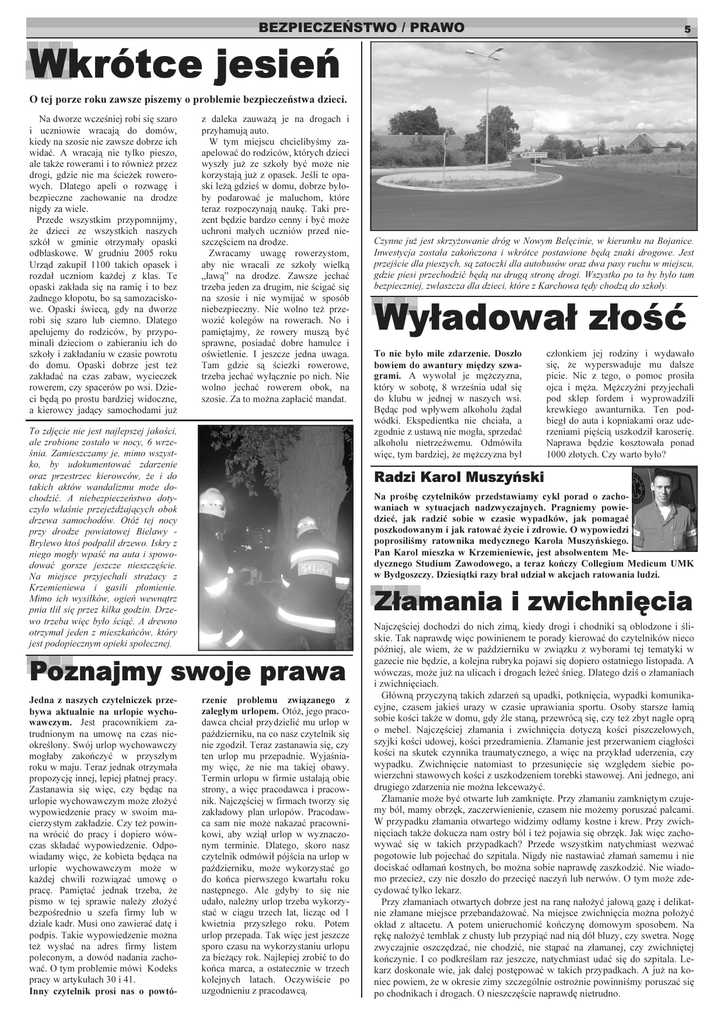 BEZPIECZEŃSTWO / PRAWO Wkrótce jesień 5 O tej porze roku zawsze piszemy o problemie bezpieczeństwa dzieci. Na dworze wcześniej robi się szaro i uczniowie wracają do domów, kiedy na szosie nie zawsze dobrze ich widać. A wracają nie tylko pieszo, ale także rowerami i to również przez drogi, gdzie nie ma ścieżek rowerowych. Dlatego apeli o rozwagę i bezpieczne zachowanie na drodze nigdy za wiele. Przede wszystkim przypomnijmy, że dzieci ze wszystkich naszych szkół w gminie otrzymały opaski odblaskowe. W grudniu 2005 roku Urząd zakupił 1100 takich opasek i rozdał uczniom każdej z klas. Te opaski zakłada się na ramię i to bez żadnego kłopotu, bo są samozaciskowe. Opaski świecą, gdy na dworze robi się szaro lub ciemno. Dlatego apelujemy do rodziców, by przypominali dzieciom o zabieraniu ich do szkoły i zakładaniu w czasie powrotu do domu. Opaski dobrze jest też zakładać na czas zabaw, wycieczek rowerem, czy spacerów po wsi. Dzieci będą po prostu bardziej widoczne, a kierowcy jadący samochodami już z daleka zauważą je na drogach i przyhamują auto. W tym miejscu chcielibyśmy zaapelować do rodziców, których dzieci wyszły już ze szkoły być może nie korzystają już z opasek. Jeśli te opaski leżą gdzieś w domu, dobrze byłoby podarować je maluchom, które teraz rozpoczynają naukę. Taki prezent będzie bardzo cenny i być może uchroni małych uczniów przed nieszczęściem na drodze. Zwracamy uwagę rowerzystom, aby nie wracali ze szkoły wielką „ławą” na drodze. Zawsze jechać trzeba jeden za drugim, nie ścigać się na szosie i nie wymijać w sposób niebezpieczny. Nie wolno też przewozić kolegów na rowerach. No i pamiętajmy, że rowery muszą być sprawne, posiadać dobre hamulce i oświetlenie. I jeszcze jedna uwaga. Tam gdzie są ścieżki rowerowe, trzeba jechać wyłącznie po nich. Nie wolno jechać rowerem obok, na szosie. Za to można zapłacić mandat. To zdjęcie nie jest najlepszej jakości, ale zrobione zostało w nocy, 6 września. Zamieszczamy je, mimo wszystko, by udokumentować zdarzenie oraz przestrzec kierowców, że i do takich aktów wandalizmu może dochodzić. A niebezpieczeństwo dotyczyło właśnie przejeżdżających obok drzewa samochodów. Otóż tej nocy przy drodze powiatowej Bielawy Brylewo ktoś podpalił drzewo. Iskry z niego mogły wpaść na auta i spowodować gorsze jeszcze nieszczęście. Na miejsce przyjechali strażacy z Krzemieniewa i gasili płomienie. Mimo ich wysiłków, ogień wewnątrz pnia tlił się przez kilka godzin. Drzewo trzeba więc było ściąć. A drewno otrzymał jeden z mieszkańców, który jest podopiecznym opieki społecznej. Wyładował złość To nie było miłe zdarzenie. Doszło bowiem do awantury między szwagrami. A wywołał je mężczyzna, który w sobotę, 8 września udał się do klubu w jednej w naszych wsi. Będąc pod wpływem alkoholu żądał wódki. Ekspedientka nie chciała, a zgodnie z ustawą nie mogła, sprzedać alkoholu nietrzeźwemu. Odmówiła więc, tym bardziej, że mężczyzna był Radzi Karol Muszyński członkiem jej rodziny i wydawało się, że wyperswaduje mu dalsze picie. Nic z tego, o pomoc prosiła ojca i męża. Mężczyźni przyjechali pod sklep fordem i wyprowadzili krewkiego awanturnika. Ten podbiegł do auta i kopniakami oraz uderzeniami pięścią uszkodził karoserię. Naprawa będzie kosztowała ponad 1000 złotych. Czy warto było? Na prośbę czytelników przedstawiamy cykl porad o zachowaniach w sytuacjach nadzwyczajnych. Pragniemy powiedzieć, jak radzić sobie w czasie wypadków, jak pomagać poszkodowanym i jak ratować życie i zdrowie. O wypowiedzi poprosiliśmy ratownika medycznego Karola Muszyńskiego. Pan Karol mieszka w Krzemieniewie, jest absolwentem Medycznego Studium Zawodowego, a teraz kończy Collegium Medicum UMK w Bydgoszczy. Dziesiątki razy brał udział w akcjach ratowania ludzi. Złamania i zwichnięcia Poznajmy swoje prawa Jedna z naszych czytelniczek przebywa aktualnie na urlopie wychowawczym. Jest pracownikiem zatrudnionym na umowę na czas nieokreślony. Swój urlop wychowawczy mogłaby zakończyć w przyszłym roku w maju. Teraz jednak otrzymała propozycję innej, lepiej płatnej pracy. Zastanawia się więc, czy będąc na urlopie wychowawczym może złożyć wypowiedzenie pracy w swoim macierzystym zakładzie. Czy też powinna wrócić do pracy i dopiero wówczas składać wypowiedzenie. Odpowiadamy więc, że kobieta będąca na urlopie wychowawczym może w każdej chwili rozwiązać umowę o pracę. Pamiętać jednak trzeba, że pismo w tej sprawie należy złożyć bezpośrednio u szefa firmy lub w dziale kadr. Musi ono zawierać datę i podpis. Takie wypowiedzenie można też wysłać na adres firmy listem poleconym, a dowód nadania zachować. O tym problemie mówi Kodeks pracy w artykułach 30 i 41. Inny czytelnik prosi nas o powtó- Czynne już jest skrzyżowanie dróg w Nowym Belęcinie, w kierunku na Bojanice. Inwestycja została zakończona i wkrótce postawione będą znaki drogowe. Jest przejście dla pieszych, są zatoczki dla autobusów oraz dwa pasy ruchu w miejscu, gdzie piesi przechodzić będą na drugą stronę drogi. Wszystko po to by było tam bezpieczniej, zwłaszcza dla dzieci, które z Karchowa tędy chodzą do szkoły. rzenie problemu związanego z zaległym urlopem. Otóż, jego pracodawca chciał przydzielić mu urlop w październiku, na co nasz czytelnik się nie zgodził. Teraz zastanawia się, czy ten urlop mu przepadnie. Wyjaśniamy więc, że nie ma takiej obawy. Termin urlopu w firmie ustalają obie strony, a więc pracodawca i pracownik. Najczęściej w firmach tworzy się zakładowy plan urlopów. Pracodawca sam nie może nakazać pracownikowi, aby wziął urlop w wyznaczonym terminie. Dlatego, skoro nasz czytelnik odmówił pójścia na urlop w październiku, może wykorzystać go do końca pierwszego kwartału roku następnego. Ale gdyby to się nie ud