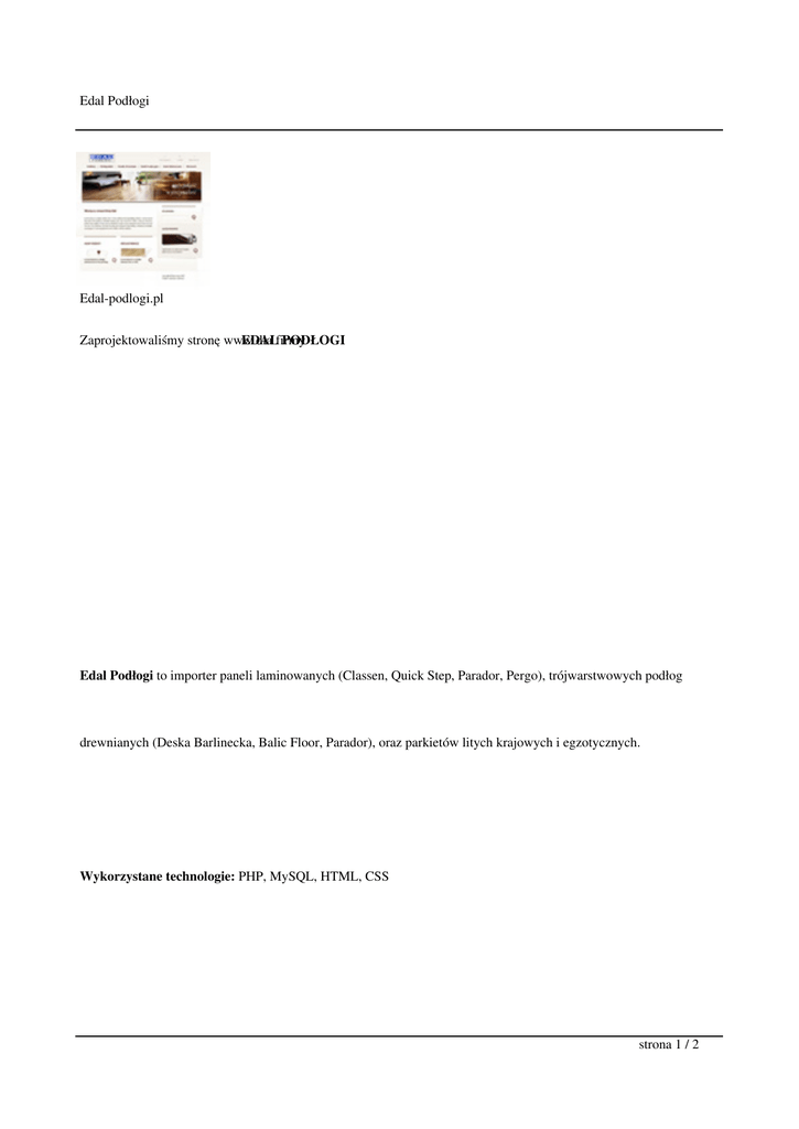 Edal Podłogi Edal-podlogi.pl Zaprojektowaliśmy stronę www EDAL dla firmy PODŁOGI Edal Podłogi to importer paneli laminowanych (Classen, Quick Step, Parador, Pergo), trójwarstwowych podłog drewnianych (Deska Barlinecka, Balic Floor, Parador), oraz parkietów litych krajowych i egzotycznych. Wykorzystane technologie: PHP, MySQL, HTML, CSS strona 1 / 2 Edal Podłogi Status: online Złóż zamównie » strona 2 / 2