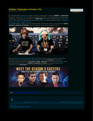 MrBitter i Rotterdam odchodzą z ESL Data publikacji : 28.03.2012 Ocena: 5/5 (1) Jak poinformowało wczoraj ESL, dwóch czołowych europejskich casterów MrBitter i Rotterdam opuszczają szeregi ESL TV. Nie podano wprawdzie powodów, ale zapowiedziano możliwą dalszą współprace na okazjonalnych eventach. Duet BitterdaM komentował wszystkie imprezy z serii IEM w 2011 i 2012 roku oraz tygodniowe turnieje online Go4SC2, a także prowadził audycje "Rotterdam University" i "Grass is Always Greener". ESL zapowiedziało, że ogłosi nowych casterów wkrótce. Nieoficjalnie mówi się, że może być to Apollo, Semmler, Kaelaris lub Khaldor, który nie wiadomo czy nie wróci niebawem z Korei. Dziś rano North American Star League (NASL) poinformowało o 3 nowych casterach, którzy będą prowadzić program i komentować gry. Rozgrywki NASL ruszają 11 kwietnia, wśród graczy zobaczymy także jednego Polaka, Grzegorza "MaNe" Komincza. Komentatorami o których mowa jak można było się domyślić są: MrBitter, Rotterdam i Frodan (komentował ostatnie MLG). Oznacza to iż para BitterdaM opuści Europę i przeprowadzi się za ocean. Tagi: ESL, komentatorzy, Rotterdam, NASL, MrBitter, Frodan Uprasza się osoby kopiujące w całości newsy z naszej witryny na swoje strony lub fora o wstawianie widocznych klikalnych linków, bezpośrednio do pobranego tekstu. W przypadku braku widocznego linku, skopiowanie tekstu uważa się za kradzież własności intelektualnej. Dziękujemy: Administratorzy serwisu. Autor: Fanek Data publikacji : 28.03.2012 Data modyfikacji : 28.03.2012 Liczba wyświetleń tekstu: 2304 Komentarz (2) dodaj komentarz poprawcie imię i nick many bo błędy są :)~luk1230 2012/03/28 14:48 Jak dla mnie zmiany jak najbardziej na korzyść, BitterdaM może podniesie trochę NASL bp do tej pory nieciekawie się ogląda ten turniej. No i z chęcią bym oglądał Go4sc2 castowane przez Apollo , Kaelarisa i Khaldora.~LOGO 2012/03/29 01:39 dodaj komentarz 08.10.2015 Kampania "Szepty o zagładzie" dostępna za darmo (0 komentarzy) 27.09.2015 Kolejni bohaterowie w trybie Sprzymierzonych Dowódców (0 komentarzy) 22.09.2015 Cyfrowe gadżety za udział w BlizzCon 2015 (0 komentarzy) 15.07.2015 Legacy of the Void dostępne w przedsprzedaży! (0 komentarzy) 17.06.2015 Informacje z E3 - prolog kampanii Legacy of the Void (0 komentarzy) 30.05.2015 WCS Europe - sobota (30 maja) 18.00 grupa G - MaNa! (0 komentarzy) 07.05.2015 DreamHack Open France 2015 - już 8 maja - MaNa! (0 komentarzy) 03.05.2015 Na wesoło: postacie E-sportu 50 (0 komentarzy) 03.05.2015 IEM Katowice 2015 - jeszcze raz! (0 komentarzy) 03.05.2015 KeSPA Cup 2015 Season 1 - live! (0 komentarzy) 26.04.2015 Proleague - Top5 gier miesiąca (0 komentarzy) 26.04.2015 CJ Entus wygrywa 2 runde Proleague! (0 komentarzy) 18.04.2015 Wersja beta Legacy of the Void – aktualizacja 2.5.1 (0 komentarzy) 18.04.2015 WCS finals 2015 - galeria (0 komentarzy) 18.04.2015 Omówienie zmian w balansie Legacy of the Void (0 komentarzy) 11.04.2015 WCS Europe kwalifikacje z Polakami - dziś (sobota) 18.00 (0 komentarzy) 11.04.2015 Aktualizacja balansu Heart of the Swarm – 9 kwietnia (0 komentarzy) 11.04.2015 GSL Season1 2015 - galeria (0 komentarzy) 11.04.2015 Zbanowane konta w StarCraft II (0 komentarzy) 04.04.2015 Red Bull Battle Grounds powraca jesienią 2015 (0 komentarzy) (zobacz wszystkie)