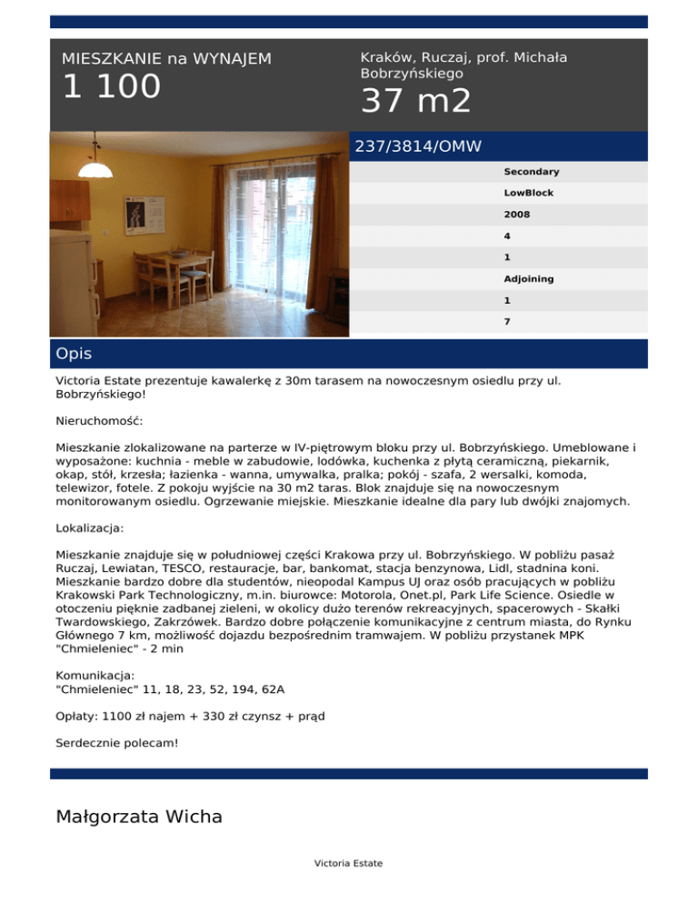 Kraków, Ruczaj, prof. Michała Bobrzyńskiego MIESZKANIE na WYNAJEM 1 100 37 m2 237/3814/OMW Secondary LowBlock 2008 4 1 Adjoining 1 7 Opis Victoria Estate prezentuje kawalerkę z 30m tarasem na nowoczesnym osiedlu przy ul. Bobrzyńskiego! Nieruchomość: Mieszkanie zlokalizowane na parterze w IV-piętrowym bloku przy ul. Bobrzyńskiego. Umeblowane i wyposażone: kuchnia - meble w zabudowie, lodówka, kuchenka z płytą ceramiczną, piekarnik, okap, stół, krzesła; łazienka - wanna, umywalka, pralka; pokój - szafa, 2 wersalki, komoda, telewizor, fotele. Z pokoju wyjście na 30 m2 taras. Blok znajduje się na nowoczesnym monitorowanym osiedlu. Ogrzewanie miejskie. Mieszkanie idealne dla pary lub dwójki znajomych. Lokalizacja: Mieszkanie znajduje się w południowej części Krakowa przy ul. Bobrzyńskiego. W pobliżu pasaż Ruczaj, Lewiatan, TESCO, restauracje, bar, bankomat, stacja benzynowa, Lidl, stadnina koni. Mieszkanie bardzo dobre dla studentów, nieopodal Kampus UJ oraz osób pracujących w pobliżu Krakowski Park Technologiczny, m.in. biurowce: Motorola, Onet.pl, Park Life Science. Osiedle w otoczeniu pięknie zadbanej zieleni, w okolicy dużo terenów rekreacyjnych, spacerowych - Skałki Twardowskiego, Zakrzówek. Bardzo dobre połączenie komunikacyjne z centrum miasta, do Rynku Głównego 7 km, możliwość dojazdu bezpośrednim tramwajem. W pobliżu przystanek MPK "Chmieleniec" - 2 min Komunikacja: "Chmieleniec" 11, 18, 23, 52, 194, 62A Opłaty: 1100 zł najem + 330 zł czynsz + prąd Serdecznie polecam! Małgorzata Wicha Victoria Estate tel. +48 511 560 721 email: [email protected] Victoria Estate Powered by TCPDF (www.tcpdf.org)