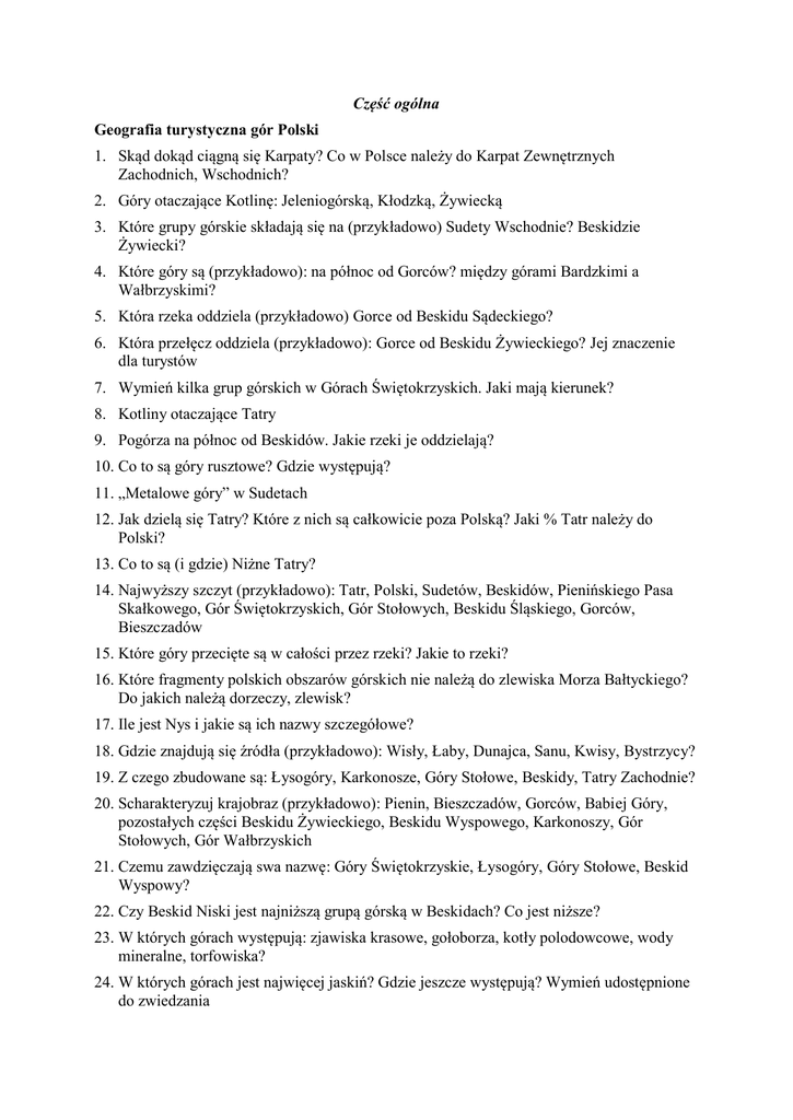 Część ogólna Geografia turystyczna gór Polski 1. Skąd dokąd ciągną się Karpaty? Co w Polsce należy do Karpat Zewnętrznych Zachodnich, Wschodnich? 2. Góry otaczające Kotlinę: Jeleniogórską, Kłodzką, Żywiecką 3. Które grupy górskie składają się na (przykładowo) Sudety Wschodnie? Beskidzie Żywiecki? 4. Które góry są (przykładowo): na północ od Gorców? między górami Bardzkimi a Wałbrzyskimi? 5. Która rzeka oddziela (przykładowo) Gorce od Beskidu Sądeckiego? 6. Która przełęcz oddziela (przykładowo): Gorce od Beskidu Żywieckiego? Jej znaczenie dla turystów 7. Wymień kilka grup górskich w Górach Świętokrzyskich. Jaki mają kierunek? 8. Kotliny otaczające Tatry 9. Pogórza na północ od Beskidów. Jakie rzeki je oddzielają? 10. Co to są góry rusztowe? Gdzie występują? 11. „Metalowe góry” w Sudetach 12. Jak dzielą się Tatry? Które z nich są całkowicie poza Polską? Jaki % Tatr należy do Polski? 13. Co to są (i gdzie) Niżne Tatry? 14. Najwyższy szczyt (przykładowo): Tatr, Polski, Sudetów, Beskidów, Pienińskiego Pasa Skałkowego, Gór Świętokrzyskich, Gór Stołowych, Beskidu Śląskiego, Gorców, Bieszczadów 15. Które góry przecięte są w całości przez rzeki? Jakie to rzeki? 16. Które fragmenty polskich obszarów górskich nie należą do zlewiska Morza Bałtyckiego? Do jakich należą dorzeczy, zlewisk? 17. Ile jest Nys i jakie są ich nazwy szczegółowe? 18. Gdzie znajdują się źródła (przykładowo): Wisły, Łaby, Dunajca, Sanu, Kwisy, Bystrzycy? 19. Z czego zbudowane są: Łysogóry, Karkonosze, Góry Stołowe, Beskidy, Tatry Zachodnie? 20. Scharakteryzuj krajobraz (przykładowo): Pienin, Bieszczadów, Gorców, Babiej Góry, pozostałych części Beskidu Żywieckiego, Beskidu Wyspowego, Karkonoszy, Gór Stołowych, Gór Wałbrzyskich 21. Czemu zawdzięczają swa nazwę: Góry Świętokrzyskie, Łysogóry, Góry Stołowe, Beskid Wyspowy? 22. Czy Beskid Niski jest najniższą grupą górską w Beskidach? Co jest niższe? 23. W których górach występują: zjawiska krasowe, gołoborza, kotły polodowcowe, wody mineralne, torfowiska? 24. W których górach jest najwięcej jaskiń? Gdzie jeszcze występują? Wymień udostępnione do zwiedzania 25. W których górach występuje piętro kosodrzewiny? 26. Gdzie są: Pielgrzymy, Prządki, Skalne Grzyby, Błędne Skały, Skamieniałe Miasto? 27. Gdzie są wąwozy: Kraków, Sobczański, Homole? 28. Największe wodospady w: Tatrach, Sudetach, Beskidach 29. W których górach występują: lawiny, wiatr halny? 30. Uzdrowiska w (przykładowo): Kotlinie Kłodzkiej, Pieninach, Beskidzie Sądeckim 31. Gdzie jest (przykładowo): Szczawno, Szczawnica, Szczawa, Polanica, Krynica, Iwonicz, Świeradów? 32. Nad jaką rzeką leży (przykładowo): Jelenia Góra, Ustroń, Żywiec, Wadowice, Nowy Sącz, Krosno? 33. Największe miasto w: Sudetach, Górach Świętokrzyskich, u stóp: Beskidów, Gorców 34. Miasta w Polsce najbliżej Bieszczadów 35. W których górach zachowało się najwięcej zamków lub ich atrakcyjnych turystycznie ruin? Wymień niektóre. Wymień najciekawsze zamki w innych górach i na pogórzach. 36. Miasta obfitujące w zabytki w: Sudetach, Beskidach, na pogórzach 37. W których rejonach górskich jest najwięcej drewnianych kościołów? Przykłady, zwł. najcenniejsze 38. Gdzie są drewniane cerkwie (góry, pogórze) – gdzie najwięcej? 39. Które miasta na skraju gór nazywane są: „polskim Carcassone”, „Małym Krakowem”? 40. Kalwarie na obszarach górskich (Co to jest? Gdzie są? Kiedy odbywają się tam największe uroczystości?) 41. Skanseny na obszarach górskich 42. Kto to są: Bojkowie, Łemkowie? Gdzie zamieszkiwali, gdzie zamieszkują teraz? 43. Gdzie można zobaczyć stroje góralskie (poza muzeami, noszone)? 44. Gdzie jest: dąb Bartek, Świątynia Wang, kaplica czaszek, skansen naftowy, ośrodek koronkarstwa? 45. Co ciekawego jest w: Krzeszowie, DębniePodhalańskim, Chochołowie, Posadzie Rybotyckiej, Wąchocku, Walimiu, Samsonowie, Sielpi, Zakopanem, na górze Żar w Beskidzie Małym? na Łysej Górze w Łysogórach? 46. Przynależność państwowa Sudetów na przestrzeni dziejów 47. Kto to był: harnaś, harnik, hawiarz? 48. Jakie pozostałości twierdzy Przemyśl można oglądać? Gdzie? (ogólnie). Gdzie jeszcze są twierdze? 49. Kiedy były i gdzie: operacje: gorlicka, dukielska, akcja „Wisła”? Ich skutki i ślady w terenie 50. W których górach była aktywna działalność partyzancka? 51. Miejsca związane z: Marią Konopnicką, Stefanem Żeromskim, Henrykiem Sienkiewiczem, Kornelem Makuszyńskim, Janem Kasprowiczem, Karolem Szymanowskim (w tym muzea im poświęcone) 52. Miejsca związane ze świętymi i błogosławionymi (jako miejsca urodzenia, zamieszkiwania lub pochówku) 53. Co to są i gdzie odbywają się Dymarki Świętokrzyskie? 54. Pozostałości dawnych przemysłów i muzea z nimi związane 55. W których górach eksploatuje się: granity, marmury, piaskowce? Gdzie są wody termalne? Gdzie jeszcze niedawno wydobywano węgiel – jaki? 56. Gdzie w rejonach górskich lub podgórskich są: rafinerie, huty szkła, cementownie, fabryki pojazdów? 57. Zapory na rzekach górskich. Elektrownia szczytowo-pompowa ze zbiornikiem na szczycie 58. Kolejki linowe (wiszące kabinowe, gondolowe, linowo-terenowe) i ważniejsze, czynne latem, wyciągi krzesełkowe 59. W których górach są najlepiej rozwinięte sieci schronisk? 60. Schroniska na szczytach. Najwyżej położone schroniska: w Tatrach, w polskich górach. 61. Gdzie jest (przykładowo) i z czego jest znany ten szczyt: Szrenica, Szyndzielnia, Skrzyczne, Wielka Czantoria, Wielka Racza, Wielka Rawka, Stożek Wielki, Luboń Wielki, Lubań, Lubomir, Lackowa, Leskowiec, Pilsko, Śnieżnik, Śnieżnika, Sokolica? Co to są i gdzie Sokoliki? 62. W których górach jest najgęściejsza, w których najrzadsza sieć szlaków? 63. Przez jakie góry przechodzi główny szla