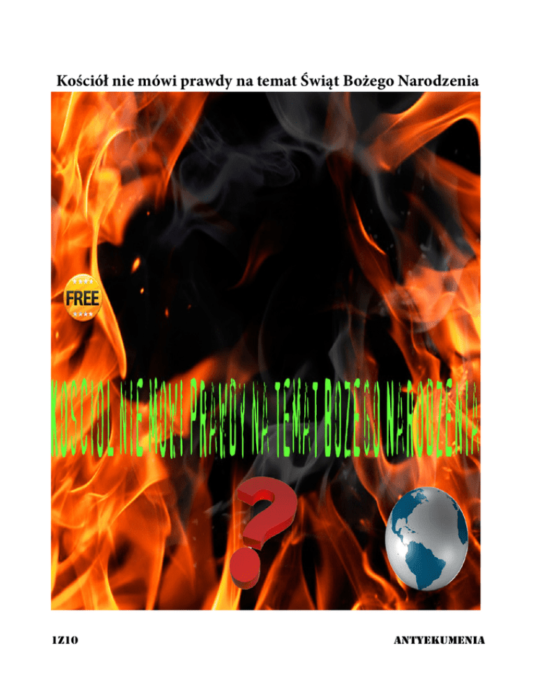 Kościół nie mówi prawdy na temat Świąt Bożego Narodzenia 1z10 AntyEkumenia „Oj, Maluśki, Maluśki, Maluśki Pan Jezus nieduży, usiadł se na przypiecku, przypiecku, fajecke se kurzy. ”Jerzy Połomski1 „Czy coś cie boli, pieluchy mosz zlone? Abo mosz w brzuszku coś nałonaczone? Lili, lililaj...”PIYKNO PANIYNKA2 „Lulejże Jezusku na sianko w żłobie, Boś przeca Ponboczek i tyż blank cz łowiek. Lulejże Jezusku a potym drzimej, Mosz sucho pielucha, toż śpij a trzimej.”LULEJŻE JEZUSKU3 Kościół Protestancki musi oddzielić się od fałszywych tradycji nagromadzonych przez wieki! Wystarczy sięgnąć po historie. Czy jako Protestanta nie zastanawiało cie, dlaczego kościół Zielonoświątkowy czy Charyzmatyczny świętuje te same święto co katolicyzm? Jak możliwe, ze cały świat, który na codzien odrzuca Jezusa ze swojego życia, świętuje te święta? Ok 350 r. Papież Juliusz I ogłosił świętowanie tzw Świąt Bożego Narodzenia w dniu 25 Grudnia. Jego poprzednik, Sylwester I (zmarły 31 Grudnia 335 r.) Na jego cześć, w ten dzień wprowadzono święto zwane do dzisiaj Sylwester. 4 Po śmierci Sylwestra spisano sfałszowany dokument zwany- Donacja Konstantyna, który opisuje o fikcyjnej relacji Sylwestra I z Konstantynem I. W ten sposób katolicyzm otrzymał fikcyjne przywileje- supremacje nad każdym kościołem na ziemi, insygnia królewskie i miasto Rzym oraz to co stało się tzw papieskimi stanami .5 Katolicka encyklopedia New Advent podaje, ze nazwa Christmas (Święta Bożego 1 https://www.youtube.com/watch?v=2VMqVXFGAuU 2 http://www.dziennikzachodni.pl/artykul/1073712,spiywnik-kolyndowy-przido-sie-rychtig-na-swiynta-slonskiekolyndy-spiywej-i-ty,id,t.html 3 http://www.dziennikzachodni.pl/artykul/1073712,spiywnik-kolyndowy-przido-sie-rychtig-na-swiynta-slonskiekolyndy-spiywej-i-ty,2,id,t,sa.html 4 http://en.wikipedia.org/wiki/Pope_Sylvester_I 5 http://en.wikipedia.org/wiki/Donation_of_Constantine 2z10 AntyEkumenia Narodzenia), pochodzi od słowa msza (za) Chrystusa. 6 I pierwszy raz miało być użyte w 1038 r.! Wcześni katolicy jak Ireneusz z Lyonu (zm. 202 AD) i Tertulian (zm. po 225 AD) ominęli to 'święto' spośród listy ich 'świąt'.(Jak mogliby pominąć tak 'ważne i wielkie Święto 'Chrześcijańskie''?) Origen (zm. 254 AD) naśmiewał się, ze w Piśmie, grzesznicy świętują narodzenie ich bogów. Arnobiusz (zm. Ok 330 AD) śmieje się z koncepcji narodzin pogańskich bogów. „Święta Bożego Narodzenia nie należą do najwcześniejszych świąt 'kościoła'” Katolicka Encyklopedia New Advent Przez ok 4 wieki od przyjścia Pana Jezusa, nigdy nie znali ani nie świętowali tego 'święta'. Co ciekawe znowu ta encyklopedia podaje, ze daty były ustalane następująco: • 20 Maja • Napisany w 243 roku De paschæ computus7 umieszcza datę urodzenia na 28 Marca. • Kalendarz Filocalusa z 354 r podaje, ze 25 Grudzień był to dzień Natalis Invicti. 8 Pamiętajmy, ze tzw Sobór nicejski I został zwołany w 325 r! A czym był ten Natailis Invicti9? To Rzymski bożek słońca, zwany Sol Invictus. Konstantyn I, w 315 roku miał wybita monetę z jego wizerunkiem jako bożka słońca. 10 Jest tam napis SOLI INVICTO COMITI co oznaczać może : liczy się tylko Sol Invictus lub ku czci niepokonanego Słońca, sługa. 11 Z głowy Konstantyna bija promienie słońca. 12 (oto prawdziwe źródło tzw aureoli ,która obserwujesz na katolickich malowidłach)Na innej monecie, jest koronowany przez bożka słońca. Jest wielkie prawdopodobieństwo, ze Konstantyn pozostał czcicielem 6 http://www.newadvent.org/cathen/03724b.htm 7 http://www.documentacatholicaomnia.eu/02m/02000258,_Cyprianus_Carthaginensis,_De_Pascha_Computus,_MLT.pdf 8 http://en.wikipedia.org/wiki/Chronography_of_354 9 http://en.wikipedia.org/wiki/Sol_Invictus 10 http://www.forumancientcoins.com/numiswiki/view.asp?key=soli%20invicto%20comiti 11 http://www.forumancientcoins.com/numiswiki/view.asp?key=COMITI 12 http://upload.wikimedia.org/wikipedia/commons/1/1f/Follis-Constantine-lyons_RIC_VI_309.jpg 3z10 AntyEkumenia tego bożka i 'nigdy nie został pokropiony' do fałszywego katolicyzmu! Źródło- forumancientcoins.com Niektórzy Protestanci obchodzą tez 'Adwent'. Katolicka encyklopedia podaje, ze najwcześniejsza kolęda pochodzi z 13 wieku! „To nie może być ustalona z jakimkolwiek stopniem pewności, kiedy obchody Adwentu po raz pierwszy wprowadzono do 'Kościoła.' ”Katolicka Encyklopedia New Advent.13 Czemu wiec świętują? Kościół Zielonoświątkowy Emaus- Zielona Góra:14 Kościół Zielonoświątkowy w Żyrardowie:15 13 http://www.newadvent.org/cathen/01165a.htm 14 http://emaus.zgora.pl/ 15 http://www.zielonoswiatkowcy.com/ 4z10 AntyEkumenia Kościół Zielonoświątkowy w Krotoszynie16 Kościół Zielonoświątkowy w Słupsku17 16 http://krotoszyn-charisma.pl/zyczenia-z-okazji-pamiatki-narodzenia-panskiego-3/ 17 http://kz.slupsk.pl/index.html 5z10 AntyEkumenia Biskup KZ- Marek Kamiński:18 Przyczyna świętowania tego święta może leżeć w wielu kwestiach: • Praktyczność- czyli dobry czas na rozdanie paczek... • Ponieważ mój pastor tak robił...kropka...koniec rozmowy. • Ponieważ nikt by nie przyszedł do kościoła, gdyby od tego roku nie byłaby świętowane to 'święto'. • To najmilszy czas w roku...śnieżek, choineczka, a ...szczególnie te przysmaki na 'wigilijnym stole'- karpik, ciasto...aż ślina cieknie na sama myśl... • Chcesz mnie pozbawić prezentów i kasy? Spadaj.... • Tyle lat kłamstwo było powielane, ze sama myśl porzucenia pogańskich świat powoduje bóle brzucha i dziwne zachowanie...Na zachodzie skarżyli nauczyciela, 18 http://kz.pl/2014/12/boze-narodzenie-2014/#more-5761 6z10 AntyEkumenia bo powiedział dzieciom, ze nie ma Mikołaja...To samo u nas...Grzech przyzwyczajeń... • A co złego...w? Pogaństwie? • 'To Jehowi tak głoszą' ! Kulty mylą się w podstawach i wiodą ludzi do piekła, ale ...