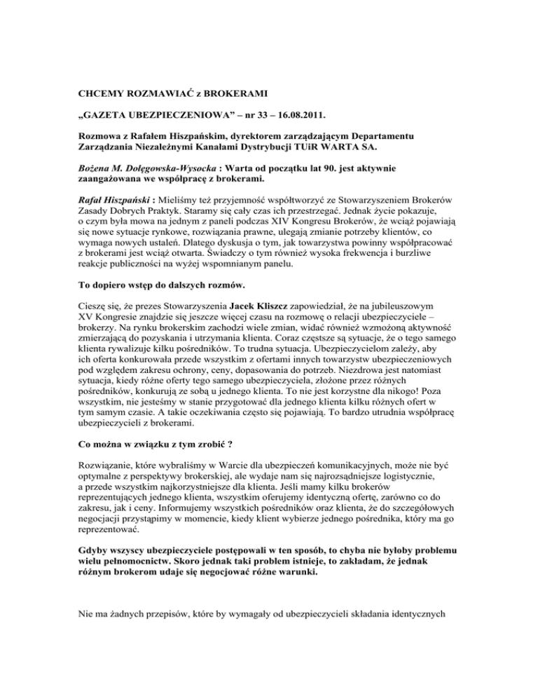 &+&(0<52=0$:,$û]%52.(5$0, Ä*$=(7$8%(=3,(&=(1,2:$´±QU± 5R]PRZD]5DIDáHP+LV]SDĔVNLPG\UHNWRUHP]DU]ąG]DMąF\P'HSDUWDPHQWX =DU]ąG]DQLD1LH]DOHĪQ\PL.DQDáDPL'\VWU\EXFML78L5:$57$6$ %RĪHQD0'RáĊJRZVND:\VRFND:DUWDRGSRF]ąWNXODWMHVWDNW\ZQLH ]DDQJDĪRZDQDZHZVSyáSUDFĊ]EURNHUDPL 5DIDá+LV]SDĔVNL0LHOLĞP\WHĪSU]\MHPQRĞüZVSyáWZRU]\ü]H6WRZDU]\V]HQLHP%URNHUyZ =DVDG\'REU\FK3UDNW\N6WDUDP\VLĊFDá\F]DVLFKSU]HVWU]HJDü-HGQDNĪ\FLHSRND]XMH RF]\PE\áDPRZDQDMHGQ\P]SDQHOLSRGF]DV;,9.RQJUHVX%URNHUyZĪHZFLąĪSRMDZLDMą VLĊQRZHV\WXDFMHU\QNRZHUR]ZLą]DQLDSUDZQHXOHJDMą]PLDQLHSRWU]HE\NOLHQWyZFR Z\PDJDQRZ\FKXVWDOHĔ'ODWHJRG\VNXVMDRW\PMDNWRZDU]\VWZDSRZLQQ\ZVSyáSUDFRZDü ]EURNHUDPLMHVWZFLąĪRWZDUWDĝZLDGF]\RW\PUyZQLHĪZ\VRNDIUHNZHQFMDLEXU]OLZH UHDNFMHSXEOLF]QRĞFLQDZ\ĪHMZVSRPQLDQ\PSDQHOX 7RGRSLHURZVWĊSGRGDOV]\FKUR]PyZ &LHV]ĊVLĊĪHSUH]HV6WRZDU]\V]HQLD-DFHN.OLV]F]]DSRZLHG]LDáĪHQDMXELOHXV]RZ\P ;9.RQJUHVLH]QDMG]LHVLĊMHV]F]HZLĊFHMF]DVXQDUR]PRZĊRUHODFMLXEH]SLHF]\FLHOH± EURNHU]\1DU\QNXEURNHUVNLP]DFKRG]LZLHOH]PLDQZLGDüUyZQLHĪZ]PRĪRQąDNW\ZQRĞü ]PLHU]DMąFąGRSR]\VNDQLDLXWU]\PDQLDNOLHQWD&RUD]F]ĊVWV]HVąV\WXDFMHĪHRWHJRVDPHJR NOLHQWDU\ZDOL]XMHNLONXSRĞUHGQLNyZ7RWUXGQDV\WXDFMD8EH]SLHF]\FLHORP]DOHĪ\DE\ LFKRIHUWDNRQNXURZDáDSU]HGHZV]\VWNLP]RIHUWDPLLQQ\FKWRZDU]\VWZXEH]SLHF]HQLRZ\FK SRGZ]JOĊGHP]DNUHVXRFKURQ\FHQ\GRSDVRZDQLDGRSRWU]HE1LH]GURZDMHVWQDWRPLDVW V\WXDFMDNLHG\UyĪQHRIHUW\WHJRVDPHJRXEH]SLHF]\FLHOD]áRĪRQHSU]H]UyĪQ\FK SRĞUHGQLNyZNRQNXUXMą]HVREąXMHGQHJRNOLHQWD7RQLHMHVWNRU]\VWQHGODQLNRJR3R]D ZV]\VWNLPQLHMHVWHĞP\ZVWDQLHSU]\JRWRZDüGODMHGQHJRNOLHQWDNLONXUyĪQ\FKRIHUWZ W\PVDP\PF]DVLH$WDNLHRF]HNLZDQLDF]ĊVWRVLĊSRMDZLDMą7REDUG]RXWUXGQLDZVSyáSUDFĊ XEH]SLHF]\FLHOL]EURNHUDPL &RPRĪQDZ]ZLą]NX]W\P]URELü" 5R]ZLą]DQLHNWyUHZ\EUDOLĞP\Z:DUFLHGODXEH]SLHF]HĔNRPXQLNDF\MQ\FKPRĪHQLHE\ü RSW\PDOQH]SHUVSHNW\Z\EURNHUVNLHMDOHZ\GDMHQDPVLĊQDMUR]VąGQLHMV]HORJLVW\F]QLH DSU]HGHZV]\VWNLPQDMNRU]\VWQLHMV]HGODNOLHQWD-HĞOLPDP\NLONXEURNHUyZ UHSUH]HQWXMąF\FKMHGQHJRNOLHQWDZV]\VWNLPRIHUXMHP\LGHQW\F]QąRIHUWĊ]DUyZQRFRGR ]DNUHVXMDNLFHQ\,QIRUPXMHP\ZV]\VWNLFKSRĞUHGQLNyZRUD]NOLHQWDĪHGRV]F]HJyáRZ\FK QHJRFMDFMLSU]\VWąSLP\ZPRPHQFLHNLHG\NOLHQWZ\ELHU]HMHGQHJRSRĞUHGQLNDNWyU\PDJR UHSUH]HQWRZDü *G\E\ZV]\VF\XEH]SLHF]\FLHOHSRVWĊSRZDOLZWHQVSRVyEWRFK\EDQLHE\áRE\SUREOHPX ZLHOXSHáQRPRFQLFWZ6NRURMHGQDNWDNLSUREOHPLVWQLHMHWR]DNáDGDPĪHMHGQDN UyĪQ\PEURNHURPXGDMHVLĊQHJRFMRZDüUyĪQHZDUXQNL 1LHPDĪDGQ\FKSU]HSLVyZNWyUHE\Z\PDJDá\RGXEH]SLHF]\FLHOLVNáDGDQLDLGHQW\F]Q\FK RIHUWMHGQHPXNOLHQWRZL7RMHVWQDV]HUR]ZLą]DQLHNWyUHX]QDOLĞP\]DQDMOHSV]HZWDNLHM V\WXDFML=GDU]DVLĊMHGQDNĪHMHĞOLRWU]\PDP\]DS\WDQLD]GHF\GRZDQLHUyĪQLąFHVLĊ ]DNUHVHPWRSU]\JRWRZXMHP\RGUĊEQHSURJUDP\-HĞOLQDSU]\NáDGMHGHQSRĞUHGQLN]áRĪ\ ]DS\WDQLHRV]HURNLZV]HFKVWURQQ\SURJUDPDLQQ\R]GHF\GRZDQLHPLQLPDOLVW\F]Q\WR ZWHG\SUDZGRSRGREQLHSU]\JRWXMHP\GZLHRIHUW\1LHPDP\WXMHGQDNGRF]\QLHQLD] GZRPDFHQDPL]DWRVDPR.ROHMQHSUREOHPDW\F]QH]DJDGQLHQLHWRF]\XEH]SLHF]\FLHO SRZLQLHQSUHIHURZDüNRQNUHWQHJRSRĞUHGQLNDF]\WHĪQLH1LHNWyUH]DNáDG\ZROąSRĞUHGQLND EURNHUDOXEDJHQWDNWyU\GRW\FKF]DVREVáXJLZDáGDQHJRNOLHQWD $OHSU]HFLHĪNOLHQWUyZQLHĪSRZLQLHQPLHüSUDZRGR]PLDQ\MHĞOL]MDNLHJRĞSRZRGXQLH MHVW]DGRZRORQ\]HZVSyáSUDF\]GRW\FKF]DVRZ\PSRĞUHGQLNLHP :DUWDMDNMXĪPyZLáHPZSU]\SDGNXXEH]SLHF]HĔNRPXQLNDF\MQ\FKSU]\JRWRZXMHMHGQą RIHUWĊGODGDQHJRNOLHQWDQDZHWMHĞOLUHSUH]HQWXMHJRNLONXSRĞUHGQLNyZ :VSRPQLDá3DQR]PLDQDFKQDU\QNXEURNHUVNLPNWyUH]DFKRG]ąZRVWDWQLFKODWDFK :ODWDFKMHGQHEL]QHV\REVáXJLZDOLEURNHU]\LQQHDJHQFL1DMF]ĊĞFLHME\á\WR ]XSHáQLHLQQHSRGPLRW\7HUD]FRUD]ZLĊFHMGXĪ\FKDJHQWyZPyZLĊSU]HGHZV]\VWNLPR PXOWLDJHQWDFKREVáXJXMHUyZQLHĪGXĪ\FKNOLHQWyZNRUSRUDF\MQ\FKNLHG\ĞSU]\SLVDQ\FK EURNHURP0DP\WHĪFRUD]ZLĊNV]ąOLF]EĊEURNHUyZNWyU\P]GDU]DVLĊREVáXJLZDüNOLHQWyZ LQG\ZLGXDOQ\FK±RVRE\IL]\F]QHLPDá\FKSU]HGVLĊELRUFyZ$WRE\áGRQLHGDZQDWUDG\F\MQ\ U\QHNDJHQF\MQ\:ZLHOXSDĔVWZDFKQLHPDUyĪQLF\PLĊG]\PXOWLDJHQWHPDEURNHUHP8 QDVMHVWLQDF]HM6ąWR]XSHáQLHLQQHSRGPLRW\MHGQDNEL]QHVRZRFRUD]EDUG]LHMVLĊGRVLHELH ]EOLĪDMą 5R]ZLą]DQLDSUDZQH]DZV]HVąZW\OH]DDNWXDOQ\PLWUHQGDPLU\QNRZ\PL1RZH VSRVRE\G]LDáDQLDZ\SUDFRZ\ZDQHVąSU]H]NRQNUHWQHGHF\]MHEL]QHVRZHNWyUH:DUWD LLQQLJUDF]HSRGHMPXMąNDĪGHJRGQLD 0\EDUG]RVLĊVWDUDP\ĪHE\QDV]HGHF\]MHE\á\WUDQVSDUHQWQHL]UR]XPLDáHGODQDV]\FK SDUWQHUyZ3RWZLHUG]DMąWRQDJURG\IDLUSOD\NWyU\PLZ\UyĪQLDMąQDVEURNHU]\&RQLH ]QDF]\ĪHQLHSRWU]HEDQDPIRUyZGRG\VNXVML]EURNHUDPL7DNLPIRUXPVą.RQJUHV\ %URNHUyZDOHPDPQDG]LHMĊĪHEĊGąQLPUyZQLHĪáDP\Ä*D]HW\8EH]SLHF]HQLRZHM´ -DNLHMHV]F]H]PLDQ\]DREVHUZRZDá3DQZRVWDWQLFKODWDFKQDU\QNXEURNHUVNLP" )LUPRPEURNHUVNLPMHVWFRUD]WUXGQLHMGRNRQ\ZDüRUJDQLF]Q\FKZ]URVWyZ/LF]QLHMV]HVWDMą VLĊIX]MHLSU]HMĊFLD3U]\NáDGHPPRĪHE\üFKRFLDĪE\SRáąF]HQLHVSyáHN$RQ3ROVNDL3URJUHV 7RFK\EDQDMZLĊNV]HWHJRW\SXZ\GDU]HQLHNWyUHRGUD]X]DRZRFRZDáRSLHUZV]\PPLHMVFHP ZUDQNLQJXEURNHUVNLPGODILUP\$RQSRGZ]JOĊGHPSU]\SLVX%DUG]RLQWHUHVXMąF\MHVW UyZQLHĪSURMHNW6LHFL3DUWQHUVNLHM:LOOLVRNWyU\PSLVDOLĞFLHZF]HUZFX&]HJRĞWDNLHJR MHV]F]HZ3ROVFHQLHE\áR 0\ĞOL3DQĪHWRPDV]DQVHSRZRG]HQLD" 7REDUG]RFLHNDZ\SURMHNW1LHPDP\MHV]F]HZ3ROVFHSUDNW\F]Q\FKGRĞZLDGF]HĔNWyUH SR]ZROLá\E\SU]HZLG]LHüMDNWDV\WXDFMDSRWRF]\VLĊGDOHM 'REU\SURMHNWGREU\PSURMHNWHPDOHEDUG]RZLHOH]DOHĪ\RGMDNRĞFLLPSOHPHQWDFML6DPD NRQFHSFMD]DSUH]HQWRZDQDSU]H]SUH]HVD-DFND&LFKHJRL3LRWUD:V]RáDRGSRZLHG]LDOQHJR ]DSURMHNWZ\GDMHPLVLĊRELHFXMąFD .ROHMQDQRZRĞüZ3ROVFHWRFRYHUKROGHU]\/OR\G¶VD 7REĊG]LHU]HF]\ZLĞFLHNROHMQHZ\]ZDQLHGODEUDQĪ\WDNĪHSRGZ]JOĊGHPSUDZQ\P :LHOHVLĊG]LHMH]DUyZQRZĞUyGXEH]SLHF]\FLHOLMDNLEURNHUyZ 5R]ZyMEL]QHVXMHVWEDUG]RZLGRF]Q\'REU\PSU]\NáDGHPMHVWWXEDQFDVVXUDQFH0LDáHP SU]\MHPQRĞüZGUDĪDüG]LDáDQLDEDQFDVVXUDQFH:DUW\SR]D*UXSąRUD]ZVSyáRUJDQL]RZDü ]*GDĔVNą$NDGHPLą%DQNRZąSLHUZV]HGZD.RQJUHV\%DQFDVVXUDQFH3U]HGODW\QLNWQLH SU]\SXV]F]DáĪHEDQNLPRJąE\üWDNV]HURNLPNDQDáHPG\VWU\EXFMLXEH]SLHF]HĔ ZV]F]HJyOQRĞFLQDĪ\FLH .ROHMQąZDĪQąLQQRZDFMąQDU\QNXVąSURJUDP\DIILQLW\F]\OLVSU]HGDĪXEH]SLHF]HĔ LQG\ZLGXDOQ\FKGODNOLHQWDPDVRZHJR0DP\WXSHZQHSRGRELHĔVWZD]XEH]SLHF]HQLDPL JUXSRZ\PLQDĪ\FLH7RSRND]XMHĪHQDU\QNXMHVWFRUD]ZLĊNV]DSRWU]HEDGREUHJ
