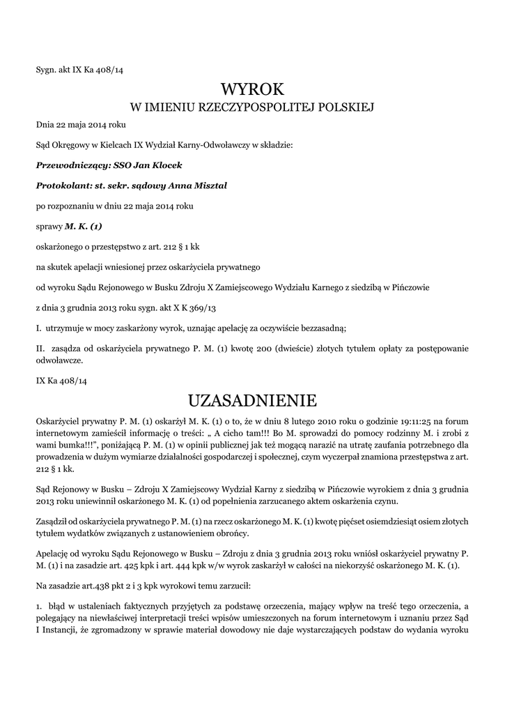 Sygn. akt IX Ka 408/14 WYROK W IMIENIU RZECZYPOSPOLITEJ POLSKIEJ Dnia 22 maja 2014 roku Sąd Okręgowy w Kielcach IX Wydział Karny-Odwoławczy w składzie: Przewodniczący: SSO Jan Klocek Protokolant: st. sekr. sądowy Anna Misztal po rozpoznaniu w dniu 22 maja 2014 roku sprawy M. K. (1) oskarżonego o przestępstwo z art. 212 § 1 kk na skutek apelacji wniesionej przez oskarżyciela prywatnego od wyroku Sądu Rejonowego w Busku Zdroju X Zamiejscowego Wydziału Karnego z siedzibą w Pińczowie z dnia 3 grudnia 2013 roku sygn. akt X K 369/13 I. utrzymuje w mocy zaskarżony wyrok, uznając apelację za oczywiście bezzasadną; II. zasądza od oskarżyciela prywatnego P. M. (1) kwotę 200 (dwieście) złotych tytułem opłaty za postępowanie odwoławcze. IX Ka 408/14 UZASADNIENIE Oskarżyciel prywatny P. M. (1) oskarżył M. K. (1) o to, że w dniu 8 lutego 2010 roku o godzinie 19:11:25 na forum internetowym zamieścił informację o treści: „ A cicho tam!!! Bo M. sprowadzi do pomocy rodzinny M. i zrobi z wami bumka!!!”, poniżającą P. M. (1) w opinii publicznej jak też mogącą narazić na utratę zaufania potrzebnego dla prowadzenia w dużym wymiarze działalności gospodarczej i społecznej, czym wyczerpał znamiona przestępstwa z art. 212 § 1 kk. Sąd Rejonowy w Busku – Zdroju X Zamiejscowy Wydział Karny z siedzibą w Pińczowie wyrokiem z dnia 3 grudnia 2013 roku uniewinnił oskarżonego M. K. (1) od popełnienia zarzucanego aktem oskarżenia czynu. Zasądził od oskarżyciela prywatnego P. M. (1) na rzecz oskarżonego M. K. (1) kwotę pięćset osiemdziesiąt osiem złotych tytułem wydatków związanych z ustanowieniem obrońcy. Apelację od wyroku Sądu Rejonowego w Busku – Zdroju z dnia 3 grudnia 2013 roku wniósł oskarżyciel prywatny P. M. (1) i na zasadzie art. 425 kpk i art. 444 kpk w/w wyrok zaskarżył w całości na niekorzyść oskarżonego M. K. (1). Na zasadzie art.438 pkt 2 i 3 kpk wyrokowi temu zarzucił: 1. błąd w ustaleniach faktycznych przyjętych za podstawę orzeczenia, mający wpływ na treść tego orzeczenia, a polegający na niewłaściwej interpretacji treści wpisów umieszczonych na forum internetowym i uznaniu przez Sąd I Instancji, że zgromadzony w sprawie materiał dowodowy nie daje wystarczających podstaw do wydania wyroku skazującego, pomimo że oskarżony w swoich wyjaśnieniach przyznał się, że wpisów na forum internetowym dokonał, a przyznanie to nie budzi wątpliwości; 2. mogącą mieć wpływ na rozstrzygnięcie obrazę przepisów postępowania, a to: a) polegającą na dowolnej a nie swobodnej interpretacji materiału dowodowego w sposób, który jedynie potwierdzałby, że oskarżony nie ponosi winy w przedmiotowej sprawie, b) poczynienie przez Sąd I Instancji ustaleń faktycznych w niniejszej sprawie na podstawie zbyt daleko idących, a korzystnych dla oskarżonego domniemań, co w konsekwencji doprowadziło do wydania wyroku uniewinniającego. Na zasadzie art. 456 kpk oskarżyciel prywatny P. M. (1) wniósł o uchylenie wyroku Sądu I Instancji i przekazanie sprawy do ponownego rozpoznania Sądowi Rejonowemu w Busku – Zdroju. Sąd Okręgowy zważył: Apelacja oskarżyciela prywatnego P. M. (1) nie zasługiwała na uwzględnienie. Wbrew jej zarzutom Sąd I Instancji zebrał i przeprowadził wszystkie istotne dowody niezbędne dla prawidłowego rozstrzygnięcia sprawy. Poddał je wzajemnej, gruntownej ocenie, którą przedstawił w spełniającym ustawowe wymogi uzasadnieniu, przez co mogła nastąpić pełna kontrola instancyjna zapadłego orzeczenia, która wypadała pozytywnie. Zdaniem skarżącego błąd w ustaleniach faktycznych miał być wynikiem niewłaściwej oceny zebranych w sprawie dowodów. Z takim zarzutem nie sposób się zgodzić. Sąd Rejonowy kierując się treścią art. 410 kpk oparł rozstrzygnięcie na całokształcie okoliczności ujawnionych w toku rozprawy głównej. Wskazał jakim dowodom i z jakich przyczyn dał wiarę a którym dowodom przymiotu wiarygodności odmówił. Zasadniczo w sprawie zaistniały jedynie trzy podstawowe dowody, a to wyjaśnienia oskarżonego, zeznania oskarżyciela posiłkowego i wydruk z forum internetowego. W tym kontekście P. M. (1) subiektywnie odbierał wpis na forum jako poniżający jego osobę i wywodził, że skoro oskarżony przyznał się do autorstwa wpisu to jego wina jest oczywista. Natomiast oskarżony argumentował, że w żadnej mierze nie miał zamiaru poniżyć P. M. (1). Słusznie zatem Sąd rozpoznający sprawę w I Instancji sięgnął po obiektywną ocenę znaczenia wpisu. W tym zakresie przeprowadził szeroki wywód prawidłowo uznając, że wpis umieszczony przez oskarżonego, w sensie obiektywnym, nie może być uznany za wyczerpujący znamiona przestępstwa. Zasadnie w tym celu zastosowano bardzo prostą i skuteczną regułę interpretacyjną wpisu przez pryzmat jego treści z treścią innych wpisów pojawiających się na forum. To porównanie skutkowało uznaniem, że przeciętny odbiorca zapisanych na forum treści z pewnością nie wskazałby na wpis oskarżonego jako mogący poniżać oskarżyciela prywatnego. W uzasadnieniu apelacji sam oskarżyciel zdaje się mieć podobny pogląd skoro operuje pojęciami wpisy, a nie wpis uczyniony przez oskarżonego, dla uwypuklenia niekorzystnych konsekwencji dla jego firmy, wywołanych tymi właśnie wpisami. Nadto oskarżyciel czyni zarzut Sądowi , że tenże Sąd nie określił, które to inne wpisy mogły być uznane za obraźliwe wskazując przy tym, że takie postąpienie Sądu jest niedopuszczalne. Także i w tym względzie oskarżyciel nie ma racji, bowiem Sąd miał skoncentrować się wyłącznie na inkryminowanym wpisie oraz jego znaczeniu i ustalić czy ten wpis ma charakter pomawiający, a nie roztrząsać nie związane ze sprawą zagadnienia. Nadto oskarżyciel w uzasadnieniu apelacji, nie koncentrując się na zasadniczej kwestii, w istocie polemizuje z ustaleniami Sądu doty