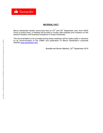 MATERIAL FACT Banco Santander, S.A. - Domicilio Social: Paseo de Pereda, 9-12. 39004 SANTANDER - R. M. de Santander, Hoja 286, Folio 64, Libro 5º de Sociedades, Inscripción 1ª. C.I.F. A-39000013 Banco Santander hereby announces that on 23rd and 24th September next, from 08:00 hours (London time), a meeting will be held in London with analysts and investors on the present situation and business prospects of Grupo Santander. The documentation to be provided during these meetings will be made public in advance by its communication to the CNMV and publication on Banco Santander’s corporate website www.santander.com. Boadilla del Monte (Madrid), 22nd September 2015