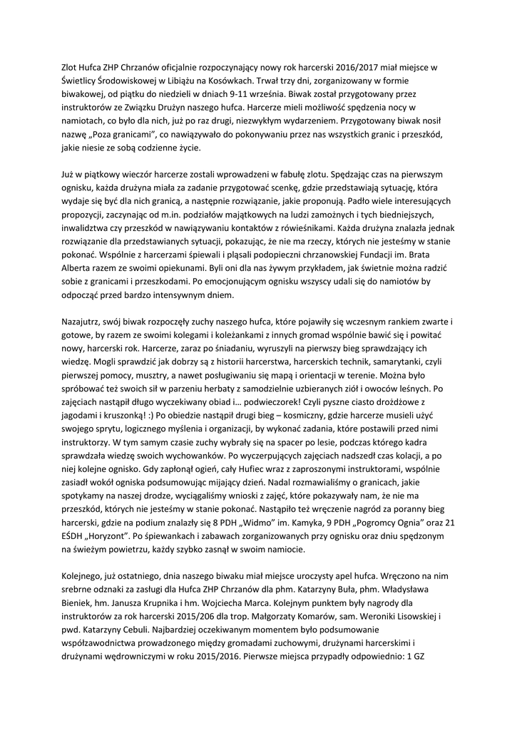 Zlot Hufca ZHP Chrzanów oficjalnie rozpoczynający nowy rok harcerski 2016/2017 miał miejsce w Świetlicy Środowiskowej w Libiążu na Kosówkach. Trwał trzy dni, zorganizowany w formie biwakowej, od piątku do niedzieli w dniach 9-11 września. Biwak został przygotowany przez instruktorów ze Związku Drużyn naszego hufca. Harcerze mieli możliwość spędzenia nocy w namiotach, co było dla nich, już po raz drugi, niezwykłym wydarzeniem. Przygotowany biwak nosił nazwę „Poza granicami”, co nawiązywało do pokonywaniu przez nas wszystkich granic i przeszkód, jakie niesie ze sobą codzienne życie. Już w piątkowy wieczór harcerze zostali wprowadzeni w fabułę zlotu. Spędzając czas na pierwszym ognisku, każda drużyna miała za zadanie przygotować scenkę, gdzie przedstawiają sytuację, która wydaje się być dla nich granicą, a następnie rozwiązanie, jakie proponują. Padło wiele interesujących propozycji, zaczynając od m.in. podziałów majątkowych na ludzi zamożnych i tych biedniejszych, inwalidztwa czy przeszkód w nawiązywaniu kontaktów z rówieśnikami. Każda drużyna znalazła jednak rozwiązanie dla przedstawianych sytuacji, pokazując, że nie ma rzeczy, których nie jesteśmy w stanie pokonać. Wspólnie z harcerzami śpiewali i pląsali podopieczni chrzanowskiej Fundacji im. Brata Alberta razem ze swoimi opiekunami. Byli oni dla nas żywym przykładem, jak świetnie można radzić sobie z granicami i przeszkodami. Po emocjonującym ognisku wszyscy udali się do namiotów by odpocząć przed bardzo intensywnym dniem. Nazajutrz, swój biwak rozpoczęły zuchy naszego hufca, które pojawiły się wczesnym rankiem zwarte i gotowe, by razem ze swoimi kolegami i koleżankami z innych gromad wspólnie bawić się i powitać nowy, harcerski rok. Harcerze, zaraz po śniadaniu, wyruszyli na pierwszy bieg sprawdzający ich wiedzę. Mogli sprawdzić jak dobrzy są z historii harcerstwa, harcerskich technik, samarytanki, czyli pierwszej pomocy, musztry, a nawet posługiwaniu się mapą i orientacji w terenie. Można było spróbować też swoich sił w parzeniu herbaty z samodzielnie uzbieranych ziół i owoców leśnych. Po zajęciach nastąpił długo wyczekiwany obiad i… podwieczorek! Czyli pyszne ciasto drożdżowe z jagodami i kruszonką! :) Po obiedzie nastąpił drugi bieg – kosmiczny, gdzie harcerze musieli użyć swojego sprytu, logicznego myślenia i organizacji, by wykonać zadania, które postawili przed nimi instruktorzy. W tym samym czasie zuchy wybrały się na spacer po lesie, podczas którego kadra sprawdzała wiedzę swoich wychowanków. Po wyczerpujących zajęciach nadszedł czas kolacji, a po niej kolejne ognisko. Gdy zapłonął ogień, cały Hufiec wraz z zaproszonymi instruktorami, wspólnie zasiadł wokół ogniska podsumowując mijający dzień. Nadal rozmawialiśmy o granicach, jakie spotykamy na naszej drodze, wyciągaliśmy wnioski z zajęć, które pokazywały nam, że nie ma przeszkód, których nie jesteśmy w stanie pokonać. Nastąpiło też wręczenie nagród za poranny bieg harcerski, gdzie na podium znalazły się 8 PDH „Widmo” im. Kamyka, 9 PDH „Pogromcy Ognia” oraz 21 EŚDH „Horyzont”. Po śpiewankach i zabawach zorganizowanych przy ognisku oraz dniu spędzonym na świeżym powietrzu, każdy szybko zasnął w swoim namiocie. Kolejnego, już ostatniego, dnia naszego biwaku miał miejsce uroczysty apel hufca. Wręczono na nim srebrne odznaki za zasługi dla Hufca ZHP Chrzanów dla phm. Katarzyny Buła, phm. Władysława Bieniek, hm. Janusza Krupnika i hm. Wojciecha Marca. Kolejnym punktem były nagrody dla instruktorów za rok harcerski 2015/206 dla trop. Małgorzaty Komarów, sam. Weroniki Lisowskiej i pwd. Katarzyny Cebuli. Najbardziej oczekiwanym momentem było podsumowanie współzawodnictwa prowadzonego między gromadami zuchowymi, drużynami harcerskimi i drużynami wędrowniczymi w roku 2015/2016. Pierwsze miejsca przypadły odpowiednio: 1 GZ „Zdobywcy Nibylanii”, 4 ŚDH „Płomienie” i 23 DW „Paradoks”. Podsumowano także konkurs plastyczny na plakat antyużywkowy. Do Hufca napłynęło wiele barwnych plakatów, bardzo ciężko było wyłonić podium. Z tego miejsca chcemy podziękować Gminnej Komisji Rozwiązywania Problemów Alkoholowych za ufundowanie nagród. Po apelu nie pozostało nam nic innego, jak spakować swoje rzeczy i powiedzieć sobie „Do zobaczenia znów”! Dziękujemy Libiąskiemu Centrum Kultury za nieodpłatne udostępnienie terenu i pomieszczeń na czas biwaku oraz wszystkim, którzy przyczynili się do zorganizowania Zlotu Hufca ZHP Chrzanów. Pozostajemy z harcerskim pozdrowieniem – CZUWAJ! sam. Kinga Bryśkiewicz