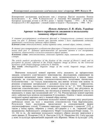 Компаративні дослідження слов’янських мов і літератур. 2009. Випуск 10 Компаративні дослідження слов’янських мов і літератур: Пам’яті академіка Леоніда Булаховського. – К., 1999; 5. Пашковський Л. Академік М.С.Державін і радянськоболгарські культурні зв’язки в 20-30-х роках // Архіви України. – 1971. – № 4. Пор.: Кондрашов Н.А. Н.С.Державин – ученый-славист и педагог // Русская речь. – 1988. – № 1. Непоп-Айдачич Л. В. (Київ, Україна) Аромат та його сприйняття людиною в польському мовному образі квітки У статті розглядаються особливості фіксації в Універсальному словнику польської мови (за ред. С. Дубаша) уявлень про аромат квітів і його сприйняття людиною, закріплених у польському мовному образі квітки. Ключові слова: етнолінгвістика, мовна картина світу, мовний образ, квітка, словник. В статье рассматриваются особенности фиксации в Универсальном словаре польского языка (под ред. С. Дубиша) представлений об аромате цветов и его восприятии человеком, закрепленных в польском языковом образе цветка. Ключевые слова: этнолингвистика, языковая картина мира, языковой образ, цветок, словарь. The article analysis peculiarities of the fixation of the concept of flower’s smell and its perception by person, reflected in the Polish linguistic image of flower, by the Universal dictionary of the Polish language (edited by S. Dubish). Key words: ethnolinguistics, linguistic image of the world, linguistic image, flower, dictionary. Вивчення польської мовної картини світу належить до пріоритетних завдань сучасного слов’янського мовознавства. Дослідження, спрямовані на досягнення визначеної таким чином мети, позиціонуються в межах таких напрямів, як етнолінгвістика, етнопсихолінгвістика, когнітивна лінгвістика. Етнолінгвістика – це “галузь мовознавства, яка вивчає зв’язки між мовою та різними сторонами матеріальної і духовної культури етносу – міфологією, релігією, звичаями, мистецтвом, етнопсихологією та ін.” [1, 164]. Основним поняттям етнолінгвістики є поняття мовної картини світу, яке розуміють як “втілення комплексу відношень, що містяться в мовному оформленні тексту та виникають зі знань про позамовний світ” [7, 72]. Реконструкція мовної картини світу здійснюється шляхом відтворення її складових. Однією з таких складових польської мовної картини світу є мовний образ квітки. Масштабний проект з вивчення польської мовної картини світу реалізують люблінські вчені на чолі з видатним етнолінгвістом Єжи Бартмінським. Результати їхніх досліджень представлені в сконденсованій формі лексикографічних статей “Словника народних стереотипів і символів” [15], а також у низці праць, зібраних у томах, об’єднаних у т. зв. “червоній серії” видавництва Люблінського університету Марії Склодовської-Кюрі [напр., 11; 12; 16] та ін.. До вивчення польського мовного образу рослин зверталися у своїх працях Д. Пєкарчик [14], К. Пастусяк [13], Н. Панасенко [6]. Світу рослин у мові та культурі присвячений окремий том збірника “Мова та культура” [10]. 120 МОВОЗНАВСТВО Деякі теоретичні питання вивчення мовного образу квітів розглядали Є. Бартмінський та С. Нєбжеговська [8, 269-275; 9, 211-224]. У наших попередніх працях реконструйовано польський мовний образ гвоздики, конвалії, незабудки, герані, братків, дзвоників [2-5 та ін.]. Це дослідження здійснюється на матеріалі електронної версії Універсального словника польської мови за ред. С. Дубіша [18]. Зазначена праця дозволяє користувачеві здійснювати пошук необхідної лексичної одиниці чи одиниць (