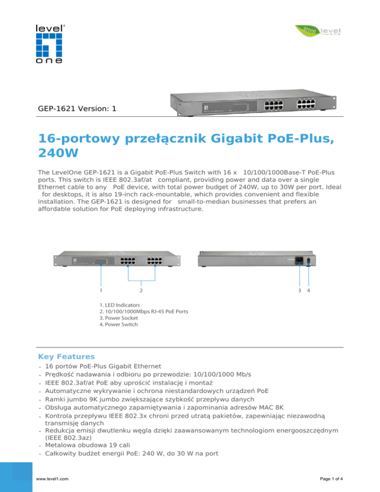GEP-1621 Version: 1 16-portowy przełącznik Gigabit PoE-Plus, 240W The LevelOne GEP-1621 is a Gigabit PoE-Plus Switch with 16 x 10/100/1000Base-T PoE-Plus ports. This switch is IEEE 802.3af/at compliant, providing power and data over a single Ethernet cable to any PoE device, with total power budget of 240W, up to 30W per port. Ideal for desktops, it is also 19-inch rack-mountable, which provides convenient and flexible installation. The GEP-1621 is designed for small-to-median businesses that prefers an affordable solution for PoE deploying infrastructure. Key Features 16 portów PoE-Plus Gigabit Ethernet Prędkość nadawania i odbioru po przewodzie: 10/100/1000 Mb/s IEEE 802.3af/at PoE aby uprościć instalację i montaż Automatyczne wykrywanie i ochrona niestandardowych urządzeń PoE Ramki jumbo 9K jumbo zwiększające szybkość przepływu danych Obsługa automatycznego zapamiętywania i zapominania adresów MAC 8K Kontrola przepływu IEEE 802.3x chroni przed utratą pakietów, zapewniając niezawodną transmisję danych - Redukcja emisji dwutlenku węgla dzięki zaawansowanym technologiom energooszczędnym (IEEE 802.3az) - Metalowa obudowa 19 cali - Całkowity budżet energii PoE: 240 W, do 30 W na port - www.level1.com Page 1 of 4 - Zasilanie wewnętrzne Highlight Opłacalność i zwiększona efektywność Wyposażony w technologię PoE+ która niemalże podwaja moc dostarczaną przez technologię IEE 802.3a. Ponadto zapewnia efektywniejsze wykorzystanie mocy, dobierając odpowiednie wartości do podłączonych urządzeń. Maksymalna moc PoE zostanie dostarczona jedynie gdy urządzenie rzeczywiście jej potrzebuje. Zapewnia w ten sposób duże oszczędności poprzez zmniejszenie rachunków za energię elektryczną, eliminuje również potrzebę stosowania dodatkowych kabli i gniazd. Related Product FCS-5061 Zewnętrzna dzienna/nocna 5 megapiksele kamera sieciowa PoE-Plus Specifications System Specifications Bufor pamięci (KB): 256KB Złącza i okablowanie: -16 x RJ-45 10/100/1000BASE-T PoE-Plus ports Dioda: Power; Link/Active; PoE Metoda transmisji: Store-and-Forward Moc : Power Consumption: < 250W Power Input: 100-240V AC, 50-60 Hz, Internal Power Supply Standardy i protokoły: IEEE 802.3 10-BASE-T, Ethernet IEEE 802.3u 100-BASE-TX, Fast Ethernet IEEE 802.3ab 1000BASE-T, Gigabit Ethernet IEEE 802.3x Flow Control (full-duplex flow control) IEEE 802.3af Power over Ethernet (PoE) IEEE 802.3at Power over Ethernet Plus (PoE+) IEEE 802.3az Energy-Efficient Ethernet Physical Specifications Wymiary (Szerokość x głębokość x wysokość mm): 480 x 200 x 44 mm Waga (g): 2900g Performance Backplane (Gbps): 32Gbps www.level1.com Page 2 of 4 Tablica MAC adresów: 8K Prędkość transmisji danych: 10/100/1000Mbps Packet Forwarding Rate: 1000Mbps port - 1,488,000pps 100Mbps port - 148,000pps 10Mbps port - 14,880pps Ramki Jumbo (K): 9KB Features Generalne: Flow Control: Half Duplex - Backpressure; Full Duplex - Pause frame PoE: Power Budget: Max. 240W Power Output: Up to 30W per port Protection: Circuit protection to prevent power interference between ports Pin Assignment: 1/2(+), 3/6(-) Environment Oszczędność energii: IEEE 802.3az Energy Efficient Ethernet: - Automatically turns power off on RJ-45 port when detecting link down or Idle of client - Cable length detection: Adjusts the signal strength based on the cable length - Reduces the power consumption for cables shorter Temperature (°C): Operating: 0°C ~ 50°C Storage: -40°C ~ 70°C Humidity (Non-condensing): Storage: 5% ~ 90% Operating: 5% ~ 90% Others Zgody i kompatybilności: FCC Part 15 Class A, CE Wdrożenie: 19-inch rack-mountable www.level1.com Page 3 of 4 Diagram Order Information GEP-1621 Package Contents Power Cord Instrukcja szybkiej instalacji ‘QIG’ No responsibility for any errors or omissions. All mentioned brand names are registered trademarks and property of their owners. Copyright © Digital Data Communications GmbH, Germany. All Rights Reserved. www.level1.com Powered by TCPDF (www.tcpdf.org) Page 4 of 4