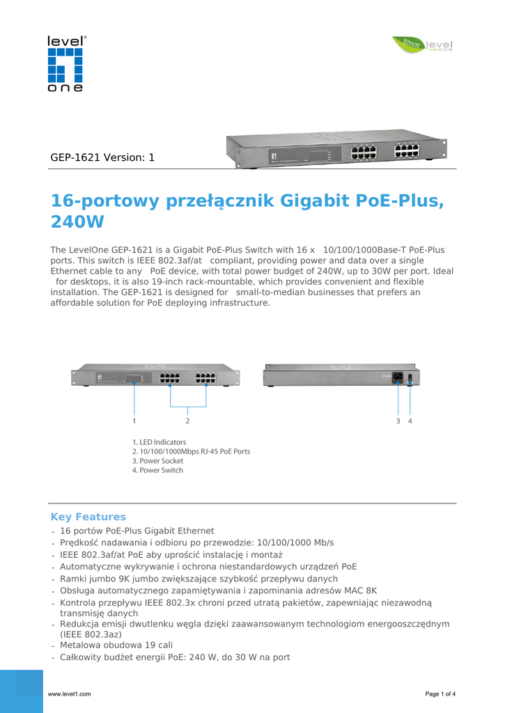 16-portowy przełącznik Gigabit PoE-Plus, 240W