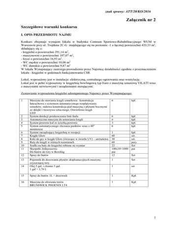 znak sprawy: ATT/20/KO/2016 Załącznik nr 2 Szczegółowe warunki konkursu I. OPIS PRZEDMIOTU NAJMU Konkurs obejmuje wynajem lokalu w budynku Centrum Sportowo-Rehabilitacyjnego WUM w Warszawie przy ul. Trojdena 2C-G znajdującego się na poziomie -1 o łącznej powierzchni 435,33 m2, składający się z: - kręgielni o powierzchni 291,14 m2, - maszynowni o powierzchni 107,07 m2, - foyer o powierzchni 16,93 m2. - WC męskie o powierzchni 10,06 m2 - WC damskie o powierzchni 9,87 m2 W lokalu Wynajmujący zastrzega prowadzenie przez Najemcę działalności zgodnie z przeznaczeniem lokalu - kręgielni w godzinach funkcjonowania CSR. Lokal, wyposażony jest w instalacje: elektryczną, centralnego ogrzewania oraz wentylację. Lokal jest w pełni wyposażony w kręgielnię bowlingową typ Euro z maszyną sznurową VILATI wraz z maszynami serwisowymi i urządzeniami sterującymi. Zestawienie wyposażenia kręgielni udostępnionego Najemcy przez Wynajmującego: Maszyna do stawiania kręgli sznurkowa –konstrukcja łańcuchowa z systemem automatycznego rozplątywania sznurków, stalowa konstrukcja pod maszyną z płytami bocznymi ze sklejki i tworzywa sztucznego, Oświetlenie kręgli LED System detekcji przekroczenia linii faulu Automatyczna maszyna do ustawiania kręgli System powrotu kul ze ścieżką powrotu System automatycznego zliczania punktów wraz z 40" monitorem System zarządzający kręgielnią w recepcji Kręgle Glow Kule do gry w kręgle Glow (świecące w świetle UV) – uretanowa Buty do kręgli w różnych rozmiarach Szafki na buty do kręgielni robione na wymiar Skarpetki Jednorazowe Do butów do Gry w Bowling Spray do butów 6 kpl. 6 6 3 6 kpl. kpl. kpl. kpl. 1 60 30 60 22 100x10=1000 par 12 kpl. szt. szt. pary Szt par Pojemnik do dozowania płynów eksploatacyjnych maszyny czyszczącej tory Olej 5 gal. i cleaner 5 gal. 1 gal = 3,79 L 1 Szt 1 szt 15 Spray do butów 1L + dozownik 1 Kpl. 16 Maszyna do oliwienia torów BRUNSWICK PHOENIX LT4 1 Kpl. 1 2 3 4 5 6 7 8 9 10 11 12 13 14 Szt 1 znak sprawy: ATT/20/KO/2016 Załącznik nr 2 Instalacje AV w kręgielni 1 2 3 4 5 6 7 8 9 10 11 12 20 21 Przyłącze ścienne AV (Audio) Monitor LCD I Komputer zintegrowany z monitorem I Uchwyt ścienny do monitora LCD I Głośnik ścienny II Głośnik niskotonowy I Wzmacniacz audio I Mikrofon bezprzewodowy nagłowny Odtwarzacz MP3/USB/SD/FM Panel sterujący Procesor dźwięku I Szafa rack z wyposażeniem dodatkowym Licencja systemu Digital Signage oraz konfiguracja playera DS. Drukarka do zdjęć PIXMA iP 2700 1 2 2 2 6 1 1 2 1 1 1 1 2 szt. szt. szt. szt. szt. szt. szt. szt. szt. szt. szt. szt. szt. 1 szt. nowa Lokal wymaga poniesienia nakładów na koszt Najemcy: 1. na koszt Najemcy przystosowanie lokalu do prowadzonej działalności w oparciu o złożony przez Najemcę a zatwierdzony przez Wynajmującego projekt: a) uzyskanie wymaganej dokumentacji, uzgodnień wynikających z obowiązujących zasad i przepisów niezbędnych do rozpoczęcia działalności (Sanepid, p-poż, itd.), b) Najemca na własny koszt doposaży kręgielnię w meble dla klientów korzystających z gry (kanapy, stoliki, fotele), c) Najemca na własny koszt i ryzyko zorganizuje w kręgielni punkt sprzedaży napojów i artykułów spożywczych (zimne napoje, napoje alkoholowe o zawartości do 4,5% alkoholu oraz piwo w naczyniach jednorazowych, artykuły spożywcze w opakowaniach). Do Sali kręgielni nie ma możliwości podłączenia instalacji wodnej ani kanalizacji, d) Najemca wyposaży na własny koszt i ryzyko kręgielnię w punkt wypożyczalni obuwia do gry w kręgle, e) Najemca zobowiązuje się do zorganizowania w porozumieniu i za zgodą Wynajmującego, na własny koszt i ryzyko punktu kasowego. II. OPIS WYMAGAŃ STAWIANYCH NAJEMCY LOKALU. 1. Obiekt został oddany do użytkowania w grudniu 2015r., wszelkie elementy znajdujące się obecnie w lokalu podlegają gwarancji budowlanej. Wszelkie ulepszenia lub przebudowa pomieszczeń jest możliwa jedynie po uzyskaniu pisemnej zgody Wynajmującego. 2. Lokal wymaga wyposażenia w sprzęt i meble na koszt Najemcy. Najemca wyposaży kręgielnię zgodnie złożoną w ofercie i sporządzoną na własny koszt koncepcją aranżacji po wcześniejszym zaakceptowaniu aranżacji przez Wynajmującego. 3. Oferent powinien przedstawić wystrój oraz aranżację dostosowaną do infrastruktury budowlanej opartej na projekcie budowlanym obiektu. 4. Najemca zobowiązuje się powstrzymać od działań, które utrudnią lub będą stanowić uciążliwość dla innych działalności prowadzonych w budynku Centrum Sportowo-Rehabilitacyjnego WUM 5. W przypadku stwierdzenia przez Najemcę lub władze administracyjne potrzeby wykonania w lokalu dodatkowych zabezpieczeń i ulepszeń poprawiających bezpieczeństwo i komfort klientom lub uczestnikom organizowanych w kręgielni imprez i dla innych działalności prowadzonych w budynku Centrum Sportowo-Rehabilitacyjnego WUM, wszelkie nakłady związane z dostosowaniem do ww. wymogów leżą po stronie Najemcy. 2 znak sprawy: ATT/20/KO/2016 Załącznik nr 2 6. Oczekiwane godziny otwarcia lokalu minimum od 1100 do 2200 od poniedziałku do niedzieli plus dni świąteczne w których działa obiekt CSR. Szczegółowy harmonogram godzin i dni pracy do uzgodnienia z Administratorem CSR. 7. Oczekiwana współpraca z Warszawskim Uniwersytetem Medycznym w zakresie organizowania i obsłudze imprez okolicznościowych wraz z udostępnieniem lokalu przy wcześniejszym ustaleniu szczegółów z przedstawicielem WUM. Ponadto Najemca powinien przedstawić: 1. oprócz cen komercyjnych w cennik usług powinien uwzględniać propozycję ulg dla studentów i pracowników WUM. 2. Oferent powinien udokumentować minimum 3 letnie doświadczenie w prowadzeniu kręgielni. 3. Najemca musi spełniać wszystkie wymogi do uzyskania niezbędnych zezwoleń i koncesji. III. OGRANICZENIA DOTYCZĄCE PROWADZENIA DZIAŁALNOŚCI: a. wykluczone instalowanie automatów do gier i do gier o niski