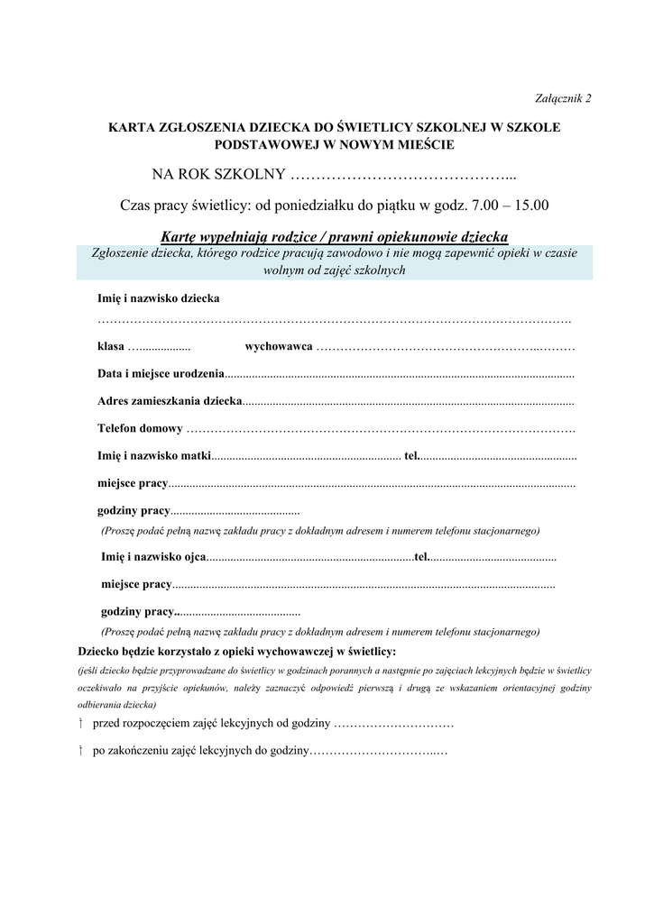 Załącznik 2 KARTA ZGŁOSZENIA DZIECKA DO ŚWIETLICY SZKOLNEJ W SZKOLE PODSTAWOWEJ W NOWYM MIEŚCIE NA ROK SZKOLNY ……………………………………... Czas pracy świetlicy: od poniedziałku do piątku w godz. 7.00 – 15.00 Kartę wypełniają rodzice / prawni opiekunowie dziecka Zgłoszenie dziecka, którego rodzice pracują zawodowo i nie mogą zapewnić opieki w czasie wolnym od zajęć szkolnych Imię i nazwisko dziecka ………………………………………………………………………………………………………. klasa …................. wychowawca ………………………………………………..……… Data i miejsce urodzenia.................................................................................................................... Adres zamieszkania dziecka.............................................................................................................. Telefon domowy ……………………………………………………………………………………. Imię i nazwisko matki............................................................... tel..................................................... miejsce pracy....................................................................................................................................... godziny pracy........................................... (Proszę podać pełną nazwę zakładu pracy z dokładnym adresem i numerem telefonu stacjonarnego) Imię i nazwisko ojca.....................................................................tel........................................... miejsce pracy............................................................................................................................... godziny pracy.......................................... (Proszę podać pełną nazwę zakładu pracy z dokładnym adresem i numerem telefonu stacjonarnego) Dziecko będzie korzystało z opieki wychowawczej w świetlicy: (jeśli dziecko będzie przyprowadzane do świetlicy w godzinach porannych a następnie po zajęciach lekcyjnych będzie w świetlicy oczekiwało na przyjście opiekunów, należy zaznaczyć odpowiedź pierwszą i drugą ze wskazaniem orientacyjnej godziny odbierania dziecka) przed rozpoczęciem zajęć lekcyjnych od godziny ………………………… po zakończeniu zajęć lekcyjnych do godziny…………………………..… Dziecko odbierać będą osobiście rodzice w godzinach pracy świetlicy lub odbierane będzie przez: ( proszę o wypisanie wszystkich osób upoważnionych do odbierania dziecka ze świetlicy wraz ze wskazaniem stopnia pokrewieństwa czy rodzaju znajomości) Imię i nazwisko osoby upoważnionej Rodzaj pokrewieństwa lub znajomości 1. 2. 3. Dziecko korzysta z obiadów na stołówce szkolnej: TAK NIE Dodatkowe informacje o dziecku ( stan zdrowia, alergie, zainteresowania, itp.) …………………………………………………………………………………………………… …………………………………………………………………………………………………… Oświadczam, że przedłożone przeze mnie w niniejszej karcie informacje są zgodne ze stanem faktycznym. …................................. data …............................................................ podpis rodzica/opiekuna prawnego ZOBOWIĄZANIA RODZICÓW/ PRAWNYCH OPIEKUNÓW 1. Systematycznie wysyłać dziecko na świetlicę szkolną 2. O wszelkich zmianach powiadamiać wychowawcę świetlicy. 3. Przekazać dziecku, iż będąc pod opieką wychowawcy świetlicy nie możne samowolnie opuszczać świetlicy. Do sklepiku szkolnego i toalety wychodzi tylko w trakcie przerw międzylekcyjnych za zgodą wychowawcy świetlicy. 4. Za samowolne opuszczenie świetlicy oraz szkody celowo wyrządzone przez dziecko odpowiedzialność ponoszą rodzice/prawni opiekunowie. Mogą oni zostać obciążeni pełną lub częściową odpłatnością za zniszczony lub uszkodzony sprzęt. 5. Rodzic/prawny opiekun zobowiązany jest do punktualnego odbioru dziecka ze świetlicy. Za bezpieczeństwo dziecka, które nie zostało odebrane do czasu zamknięcia świetlicy, odpowiedzialność ponoszą rodzice/prawni opiekunowie. Zapoznałem się z regulaminem i zobowiązuję się przestrzegać jego zapisów. Nowe Miasto, dnia……………………………...... ……................................................... (czytelny podpis rodziców/opiekunów)