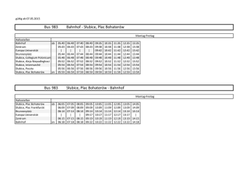 gültig ab 07.05.2015 Bus 983 Bahnhof - Słubice, Plac Bohaterów Montag-Freitag Haltestellen Bahnhof ab Zentrum Europa-Universität Brunnenplatz Słubice, Collegium Polonicum Słubice, Aleja Niepodległosci Słubice, Intermarché Słubice, Poczta Słubice, Plac Bohaterów an 05:40 05:43 | 05:44 05:48 05:52 05:54 05:56 05:59 Bus 983 06:40 06:43 | 06:44 06:48 06:52 06:54 06:56 06:59 07:40 07:43 | 07:44 07:48 07:52 07:54 07:56 07:59 08:40 08:43 | 08:44 08:48 08:52 08:54 08:56 08:59 09:35 09:38 09:42 09:44 09:48 09:52 09:54 09:56 09:59 10:35 10:38 10:42 10:44 10:48 10:52 10:54 10:56 10:59 11:35 11:38 11:42 11:44 11:48 11:52 11:54 11:56 11:59 12:35 12:38 12:42 12:44 12:48 12:52 12:54 12:56 12:59 13:35 13:38 13:42 13:44 13:48 13:52 13:54 13:56 13:59 Słubice, Plac Bohaterów - Bahnhof Montag-Freitag Haltestellen Słubice, Plac Bohaterów Słubice, Plac Frankfurcki Brunnenplatz Europa-Universität Zentrum Bahnhof ab an 06:05 06:09 06:14 | 06:15 06:18 07:05 07:09 07:14 | 07:15 07:18 08:05 08:09 08:14 | 08:15 08:18 09:05 09:09 09:14 09:17 09:19 09:22 10:05 10:09 10:14 10:17 10:19 10:22 11:05 11:09 11:14 11:17 11:19 11:22 12:05 12:09 12:14 12:17 12:19 12:22 13:05 13:09 13:14 13:17 13:19 13:22 14:05 14:09 14:14 | 14:15 14:18