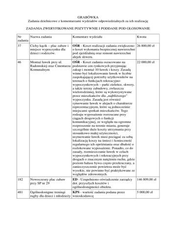 GRABÓWKA Zadania dzielnicowe z komentarzami wydziałów odpowiedzialnych za ich realizację ZADANIA ZWERYFIKOWANE POZYTYWNIE I PODDANE POD GŁOSOWANIE Nr Nazwa zadania zadania Komentarz wydziału Kwota 37 Cichy kącik – plac zabaw i miejsce wypoczynku dla dzieci i rodziców. OŚR - Koszt realizacji zadania zwiększono 26 800,00 zł o koszt wykonania bezpiecznej nawierzchni pod zjeżdżalnią oraz remont nawierzchni alejek skweru. 46 Montaż ławek przy ul. 22 000,00 zł OŚR - Koszt zadania oszacowano na Radomskiej oraz Cmentarzu podstawie cen rynkowych przyjmując zakup i montaż 10 ławek i koszy. Zasadą Komunalnym winno być lokalizowanie ławek w liczbie zaspokajającej potrzeby użytkowników na terenach o funkcjach rekreacyjnowypoczynkowych – parki zieleńce, skwery, a także tereny zabudowy, zwłaszcza wielorodzinnej, które są wykorzystywane przez mieszkańców dla „najbliższego” wypoczynku. Zasadą jest również sytuowanie ławek w alejach o charakterze reprezentacyjnym, które są jednocześnie miejscami spotkań mieszkańców. Tego rodzaju wyposażenie rozrzucane przy ciągach drogowych o funkcji komunikacyjnej, ze względu na ogromne rozproszenie na terenie miasta, generuje szczególnie duże koszty utrzymania przy stosunkowo małej użyteczności, usytuowanie ławek musi pociągać za sobą lokalizację koszy na śmieci i konieczność regularnego ich opróżniania oraz dbałość o rozlokowane wyposażenie. Ponadto, co do zasady, rozmieszczanie ławek w celach wypoczynkowych i rekreacyjnych przy drogach o znacznym natężeniu ruchu, gdzie poziom hałasu bywa często przekraczany, a zanieczyszczenie powietrza może być wysokie, nie powinno być praktykowane ze względów zdrowotnych. 182 Nowoczesny plac zabaw przy SP nr 29 481 Ogólnodostępne treningi KPS - wartość zadania podana przez rugby dla dzieci i młodzieży wnioskodawcę ED - Uzupełniono oświadczenie zarządcy dot. przyszłych kosztów i ogólnodostępności obiektu. 146 809,00 zł 5 000,00 zł ZADANIA ZWERYFIKOWANE NEGATYWNIE Nr Nazwa zadania zadania Komentarz wydziału 78 Przejście dla pieszych przez ul. Św. Rocha przy skrzyżowaniu z ul. Krzemienną MN - Wniosek m.in.: obejmuje nieruchomość oznaczoną w obrębie 428 - Grabówka jako działka nr 862/8, która posiada nieuregulowany stan prawny. W związku z powyższym zadanie nie jest możliwe do zrealizowania - w załączeniu opinia Miejskiego Zarządu Dróg i Transportu w Częstochowie. 241 Budowa chodnika na ul. Gminnej MN - Brak możliwości realizacji zadania. Część terenu wskazanego we wniosku nie należy do Gminy Częstochowa. 382 Dokończenie budowy kościoła przy Sanktuarium Krwi Chrystusa IZ - Zgłoszone zadanie nie mieści się w kategorii zadania własnego gminy. LEGENDA: BGLK - Biuro Gospodarki Lokalowej i Usług Komunalnych ED - Wydział Edukacji IZ - Wydział Inwestycji i Zamówień Publicznych KOSO - Wydz Zarządzania Kryzysowego, Ochrony Ludności i Spraw Obronnych KPS - Wydział Kultury, Promocji i Sportu MN - Wydział Mienia i Nadzoru Właścicielskiego MPUP - Miejska Pracownia Urbanistyczno-Planistyczna MZDiT - Miejski Zarząd Dróg i Transportu NA - Wydział Nadzoru i Administracji OŚR - Wydział Ochrony Środowiska, Rolnictwa i Leśnictwa PS - Wydział Polityki Społecznej