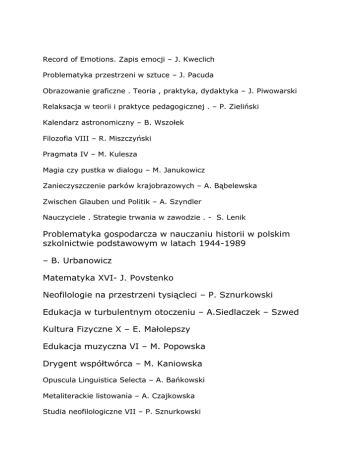 Record of Emotions. Zapis emocji – J. Kweclich Problematyka przestrzeni w sztuce – J. Pacuda Obrazowanie graficzne . Teoria , praktyka, dydaktyka – J. Piwowarski Relaksacja w teorii i praktyce pedagogicznej . – P. Zieliński Kalendarz astronomiczny – B. Wszołek Filozofia VIII – R. Miszczyński Pragmata IV – M. Kulesza Magia czy pustka w dialogu – M. Janukowicz Zanieczyszczenie parków krajobrazowych – A. Bąbelewska Zwischen Glauben und Politik – A. Szyndler Nauczyciele . Strategie trwania w zawodzie . - S. Lenik Problematyka gospodarcza w nauczaniu historii w polskim szkolnictwie podstawowym w latach 1944-1989 – B. Urbanowicz Matematyka XVI- J. Povstenko Neofilologie na przestrzeni tysiącleci – P. Sznurkowski Edukacja w turbulentnym otoczeniu – A.Siedlaczek – Szwed Kultura Fizyczne X – E. Małolepszy Edukacja muzyczna VI – M. Popowska Drygent współtwórca – M. Kaniowska Opuscula Linguistica Selecta – A. Bańkowski Metaliterackie listowania – A. Czajkowska Studia neofilologiczne VII – P. Sznurkowski Edukacja elementarna w czasie nowych wyzwań socjokulturowych - M. Królica Edukacja przedszkolna i wczesnoszkolna w obliczu aktualnych zmian oświatowych – A. Pękala Edukacja techniczna i informatyczna VII – A. Gil Polska wobec zagrożenia ze strony III Rzeczy – H. Ćwięk Pedagogika XX – K. Rędziński Res Politicae IV- H. Ćwięk Język Teatr Literatura V – A . Wypych Gawrońska Forum młodych nauki 6/7 – C. Kozłowski Słownik analizy transakcyjnej – J. Jagieła Edukacja fotograficzna VI –J Piwowarski Edukacja plastyczna V fotografia – J. Piwowarski Wielowymiarowość i perspektywy nauki – praca zbiorowa Filologia Polska XII – E. Hurnik Studencki biuletyn historyczny III – R. Majzner Twórcy polskiej logopedii – A. Siedlaczek Szwed Obiektywna i subiektywna percepcja biedy – I. Wagner Analiza transakcyjna w kilku odsłonach – J. Jagieła Zjawisko nobilitacji II – D. Suska Zjawisko nobilitacji III – D. Suska Język w komunikacji – G. Majkowski Między prawdą a zwątpieniem – H. Srogosz Polnische Germanistik – J. Papiór Administracyjnoprawny status jednostki – M. Stych Tolerancja XVI - A. Rosół Organizacja administracji publicznej – M. Stych Towarzystwa opiekuńcze i wychowawcze na Wileńszczyźnie w okresie międzywojnia – A. Siedlaczyk Szwed Praca socjalna aktywnym instrumentem polityki społecznej - od wolontariatu do zatrudnienia – M. Mirowska Językowe aspekty kultury politycznej Sejmu Wielkiego – M. DawidziakKładoczna Mesjański logos europy – A. Żywiołek Historia architektury i sztuki – E. Małolepszy Na tropach twórczości i czasów minionych . M. Cetwiński Nauczyciele szkół ludowych Śląska Cieszyńskiego w XIX i na początku XX wieku – M. Bogus Dwudziestolecie znane i nieznane – E. Wróbel