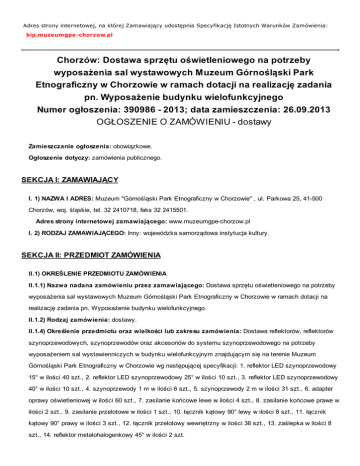Adres strony internetowej, na której Zamawiający udostępnia Specyfikację Istotnych Warunków Zamówienia: bip.muzeumgpe-chorzow.pl Chorzów: Dostawa sprzętu oświetleniowego na potrzeby wyposażenia sal wystawowych Muzeum Górnośląski Park Etnograficzny w Chorzowie w ramach dotacji na realizację zadania pn. Wyposażenie budynku wielofunkcyjnego Numer ogłoszenia: 390986 - 2013; data zamieszczenia: 26.09.2013 OGŁOSZENIE O ZAMÓWIENIU - dostawy Zamieszczanie ogłoszenia: obowiązkowe. Ogłoszenie dotyczy: zamówienia publicznego. SEKCJA I: ZAMAWIAJĄCY I. 1) NAZWA I ADRES: Muzeum "Górnośląski Park Etnograficzny w Chorzowie" , ul. Parkowa 25, 41-500 Chorzów, woj. śląskie, tel. 32 2410718, faks 32 2415501. Adres strony internetowej zamawiającego: www.muzeumgpe-chorzow.pl I. 2) RODZAJ ZAMAWIAJĄCEGO: Inny: wojewódzka samorządowa instytucja kultury. SEKCJA II: PRZEDMIOT ZAMÓWIENIA II.1) OKREŚLENIE PRZEDMIOTU ZAMÓWIENIA II.1.1) Nazwa nadana zamówieniu przez zamawiającego: Dostawa sprzętu oświetleniowego na potrzeby wyposażenia sal wystawowych Muzeum Górnośląski Park Etnograficzny w Chorzowie w ramach dotacji na realizację zadania pn. Wyposażenie budynku wielofunkcyjnego. II.1.2) Rodzaj zamówienia: dostawy. II.1.4) Określenie przedmiotu oraz wielkości lub zakresu zamówienia: Dostawa reflektorów, reflektorów szynoprzewodowych, szynoprzewodów oraz akcesoriów do systemu szynoprzewodowego na potrzeby wyposażeniem sal wystawienniczych w budynku wielofunkcyjnym znajdującym się na terenie Muzeum Górnośląski Park Etnograficzny w Chorzowie wg następującej specyfikacji: 1. reflektor LED szynoprzewodowy 15° w ilości 40 szt., 2. reflektor LED szynoprzewodowy 25° w ilości 10 szt., 3. reflektor LED szynoprzewodowy 40° w ilości 10 szt., 4. szynoprzewody 1 m w ilości 6 szt., 5. szynoprzewody 2 m w ilości 31 szt., 6. adapter oprawy oświetleniowej w ilości 60 szt., 7. zasilanie końcowe lewe w ilości 4 szt., 8. zasilanie końcowe prawe w ilości 2 szt., 9. zasilanie przelotowe w ilości 1 szt., 10. łącznik kątowy 90° lewy w ilości 8 szt., 11. łącznik kątowy 90° prawy w ilości 3 szt., 12. łącznik przelotowy wewnętrzny w ilości 36 szt., 13. zaślepka w ilości 8 szt., 14. reflektor metalohalogenkowy 45° w ilości 2 szt. II.1.6) Wspólny Słownik Zamówień (CPV): 31.00.00.00-6, 31.50.00.00-1, 31.52.41.00-6, 31.52.41.20-2. II.1.7) Czy dopuszcza się złożenie oferty częściowej: nie. II.1.8) Czy dopuszcza się złożenie oferty wariantowej: nie. II.2) CZAS TRWANIA ZAMÓWIENIA LUB TERMIN WYKONANIA: Okres w dniach: 60. SEKCJA III: INFORMACJE O CHARAKTERZE PRAWNYM, EKONOMICZNYM, FINANSOWYM I TECHNICZNYM III.2) ZALICZKI III.4) INFORMACJA O OŚWIADCZENIACH LUB DOKUMENTACH, JAKIE MAJĄ DOSTARCZYĆ WYKONAWCY W CELU POTWIERDZENIA SPEŁNIANIA WARUNKÓW UDZIAŁU W POSTĘPOWANIU ORAZ NIEPODLEGANIA WYKLUCZENIU NA PODSTAWIE ART. 24 UST. 1 USTAWY III.4.1) W zakresie wykazania spełniania przez wykonawcę warunków, o których mowa w art. 22 ust. 1 ustawy, oprócz oświadczenia o spełnianiu warunków udziału w postępowaniu należy przedłożyć: III.4.2) W zakresie potwierdzenia niepodlegania wykluczeniu na podstawie art. 24 ust. 1 ustawy, należy przedłożyć: oświadczenie o braku podstaw do wykluczenia; aktualny odpis z właściwego rejestru lub z centralnej ewidencji i informacji o działalności gospodarczej, jeżeli odrębne przepisy wymagają wpisu do rejestru lub ewidencji, w celu wykazania braku podstaw do wykluczenia w oparciu o art. 24 ust. 1 pkt 2 ustawy, wystawiony nie wcześniej niż 6 miesięcy przed upływem terminu składania wniosków o dopuszczenie do udziału w postępowaniu o udzielenie zamówienia albo składania ofert; III.4.3) Dokumenty podmiotów zagranicznych Jeżeli wykonawca ma siedzibę lub miejsce zamieszkania poza terytorium Rzeczypospolitej Polskiej, przedkłada: III.4.3.1) dokument wystawiony w kraju, w którym ma siedzibę lub miejsce zamieszkania potwierdzający, że: nie otwarto jego likwidacji ani nie ogłoszono upadłości - wystawiony nie wcześniej niż 6 miesięcy przed upływem terminu składania wniosków o dopuszczenie do udziału w postępowaniu o udzielenie zamówienia albo składania ofert; III.4.4) Dokumenty dotyczące przynależności do tej samej grupy kapitałowej lista podmiotów należących do tej samej grupy kapitałowej w rozumieniu ustawy z dnia 16 lutego 2007 r. o ochronie konkurencji i konsumentów albo informacji o tym, że nie należy do grupy kapitałowej; III.5) INFORMACJA O DOKUMENTACH POTWIERDZAJĄCYCH, ŻE OFEROWANE DOSTAWY, USŁUGI LUB ROBOTY BUDOWLANE ODPOWIADAJĄ OKREŚLONYM WYMAGANIOM W zakresie potwierdzenia, że oferowane roboty budowlane, dostawy lub usługi odpowiadają określonym wymaganiom należy przedłożyć: inne dokumenty 1. Karty katalogowe, dokumentacja techniczna lub inne dokumenty potwierdzające parametry techniczne. 2. Karty gwarancyjne potwierdzające warunki gwarancji sprzętu. SEKCJA IV: PROCEDURA IV.1) TRYB UDZIELENIA ZAMÓWIENIA IV.1.1) Tryb udzielenia zamówienia: przetarg nieograniczony. IV.2) KRYTERIA OCENY OFERT IV.2.1) Kryteria oceny ofert: najniższa cena. IV.4) INFORMACJE ADMINISTRACYJNE IV.4.1) Adres strony internetowej, na której jest dostępna specyfikacja istotnych warunków zamówienia: bip.muzeumgpe-chorzow.pl Specyfikację istotnych warunków zamówienia można uzyskać pod adresem: Muzeum Górnośląski Park Etnograficzny w Chorzowie, ul. Parkowa 25, 41-500 Chorzów. IV.4.4) Termin składania wniosków o dopuszczenie do udziału w postępowaniu lub ofert: 04.10.2013 godzina 08:00, miejsce: Muzeum Górnośląski Park Etnograficzny w Chorzowie, ul. Parkowa 25, 41-500 Chorzów - wejście od strony al. Harcerskiej budynek administracyjno-wystawienniczy, I piętro, sekretariat. IV.4.5) Termin związania ofertą: okres w dniach: 30 (od ostatecznego terminu składania ofert). IV.4.17) Czy przewiduje się unieważnienie postępowania o udzielenie zamówi