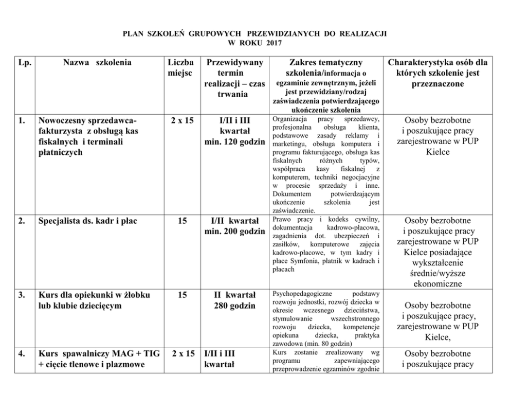 PLAN SZKOLEŃ GRUPOWYCH PRZEWIDZIANYCH DO REALIZACJI W ROKU 2017 Lp. Nazwa szkolenia Liczba miejsc Przewidywany termin realizacji – czas trwania 1. Nowoczesny sprzedawcafakturzysta z obsługą kas fiskalnych i terminali płatniczych 2 x 15 I/II i III kwartał min. 120 godzin 2. Specjalista ds. kadr i płac 15 I/II kwartał min. 200 godzin 3. Kurs dla opiekunki w żłobku lub klubie dziecięcym 15 II kwartał 280 godzin 4. Kurs spawalniczy MAG + TIG + cięcie tlenowe i plazmowe 2 x 15 I/II i III kwartał Zakres tematyczny szkolenia/informacja o egzaminie zewnętrznym, jeżeli jest przewidziany/rodzaj zaświadczenia potwierdzającego ukończenie szkolenia Organizacja pracy sprzedawcy, profesjonalna obsługa klienta, podstawowe zasady reklamy i marketingu, obsługa komputera i programu fakturującego, obsługa kas fiskalnych różnych typów, współpraca kasy fiskalnej z komputerem, techniki negocjacyjne w procesie sprzedaży i inne. Dokumentem potwierdzającym ukończenie szkolenia jest zaświadczenie. Prawo pracy i kodeks cywilny, dokumentacja kadrowo-płacowa, zagadnienia dot. ubezpieczeń i zasiłków, komputerowe zajęcia kadrowo-płacowe, w tym kadry i płace Symfonia, płatnik w kadrach i płacach Psychopedagogiczne podstawy rozwoju jednostki, rozwój dziecka w okresie wczesnego dzieciństwa, stymulowanie wszechstronnego rozwoju dziecka, kompetencje opiekuna dziecka, praktyka zawodowa (min. 80 godzin) Kurs zostanie zrealizowany wg programu zapewniającego przeprowadzenie egzaminów zgodnie Charakterystyka osób dla których szkolenie jest przeznaczone Osoby bezrobotne i poszukujące pracy zarejestrowane w PUP Kielce Osoby bezrobotne i poszukujące pracy zarejestrowane w PUP Kielce posiadające wykształcenie średnie/wyższe ekonomiczne Osoby bezrobotne i poszukujące pracy, zarejestrowane w PUP Kielce, Osoby bezrobotne i poszukujące pracy min. 200 godzin 5. II kwartał ok. 200 godzin Operator koparko-ładowarki kl. III 10 6. Kurs przygotowujący do egzaminu na prawo jazdy kat. C, C+E, wraz z kwalifikacja wstępna przyspieszona 3 x 15 I, II i III kwartał 225 godzin 7. Kurs przygotowujący do egzaminu na prawo jazdy kat. E/C 2 x 10 I/II kwartał z PN-EN 287-1. Po zakończeniu szkolenia jest przewidziany egzamin państwowy. Dokumentem potwierdzającym ukończenie szkolenia jest zaświadczenie, a po zdaniu egzaminu państwowego książeczka spawacza. Zgodnie z programem określonym w Rozporządzeniu Ministra Gospodarki z dnia 20 września 2001r w sprawie bezpieczeństwa i higieny pracy podczas eksploatacji maszyn i urządzeń technicznych do robót ziemnych, budowlanych i drogowych (Dz.U z 2001r, Nr 118, poz. 1263 Po ukończeniu szkolenia przewidziany jest egzamin państwowy. Dokumentem potwierdzającym ukończenie szkolenia jest zaświadczenie, a po zdaniu egzaminu państwowego – książeczka operatora Zgodnie ustawą o kierujących pojazdami. Po ukończeniu szkolenia przewidziany jest egzamin państwowy – teoretyczny i praktyczny. Dokumentem potwierdzającym ukończenie szkolenia jest zaświadczenie, a po zdaniu egzaminów państwowych prawo jazdy kat. C+E Zgodnie z ustawą o kierujących pojazdami. Po ukończeniu szkolenia przewidziany jest egzamin państwowy – teoretyczny i praktyczny. Dokumentem potwierdzającym ukończenie szkolenia jest zaświadczenie, a po zdaniu egzaminów państwowych prawo jazdy kat. E/C zarejestrowane w PUP Osoby bezrobotne i poszukujące pracy zarejestrowane w PUP Kielce Osoby bezrobotne i poszukujące pracy zarejestrowane w PUP Kielce posiadające prawo jazdy kat. B oraz ukończone 21 lat Osoby bezrobotne i poszukujące pracy zarejestrowane w PUP Kielce posiadające prawo jazdy kat. C + kwalifikacja na przewóz rzeczy 8. Magazynier z obsługą komputera, kas fiskalnych i wózków jezdniowych 15 I/II kwartał 9. Przedstawiciel handlowy + prawo jazdy kat. B 2 x 15 II i III kwartał 10 II kwartał min. 160 godzin 10. Kurs bukieciarstwa i florystyki z elementami Podstawy wiedzy teoretycznej w zakresie sprzedaży detalicznej i hurtowej, odstawy towaroznawstwa, organizacja prac magazynowych, wyposażenie magazynów, zapasy magazynowe, dokumentacja obrotów magazynowych, logistyka, odpowiedzialność prawna magazyniera, budowa i typy stosowanych wózków jezdniowych, czynności operatora przy obsłudze wózków, wiadomości z zakresu bhp i ładunkoznawstwa, wiadomości o dozorze technicznym, obsługa i wymiana butli w wózkach napędzanych gazem, zastosowanie komputera w gospodarce magazynowej, praktyczna nauka jazdy i manewrowanie osprzętem wózków, obsługa kas fiskalnych różnych typów i inne. Po zakończeniu szkolenia przewidziany jest egzamin zewnętrzny. Dokumentem potwierdzającym ukończenie szkolenia jest zaświadczenie. I moduł szkolenia to zagadnienia dot. pracy przedstawiciela handlowego, a drugi zgodnie z ustawą o kierujących pojazdami. Po ukończeniu szkolenia przewidziany jest egzamin państwowy – teoretyczny i praktyczny. Dokumentem potwierdzającym ukończenie szkolenia jest zaświadczenie, a po zdaniu egzaminów państwowych prawo jazdy kat. B Osoby bezrobotne i poszukujące pracy zarejestrowane w PUP Kielce Zagadnienia z zakresu materiałoznawstwa, teoria barw i kompozycji, kompozycje w Osoby bezrobotne i poszukujące pracy Osoby bezrobotne i poszukujące pracy zarejestrowane w PUP Kielce technik decoupage 11. Mechanik samochodowy 12. Kurs kucharski z obsługą przyjęć okolicznościowych i elementami carvingu 13. Blacharz - lakiernik samochodowy 10 II kwartał ok. 200 godzin 2 x 10 II i IV kwartał min. 180 godzin 10 II kwartał 450 godzin naczyniach, dekoracje wnętrz, techniki decoupage w teorii i praktyce i inne Bhp w zawodzie, konstrukcja i eksploatacja pojazdów samochodowych, obsługa i naprawa pojazdów sam., konserwacja, regeneracja części pojazdów samochodowych. Zasady racjonalnego żywienia, zasady układania jadłospisów, przyprawy i zioła przyprawowe, sporządzanie potraw z różnych produktów, potrawy ku