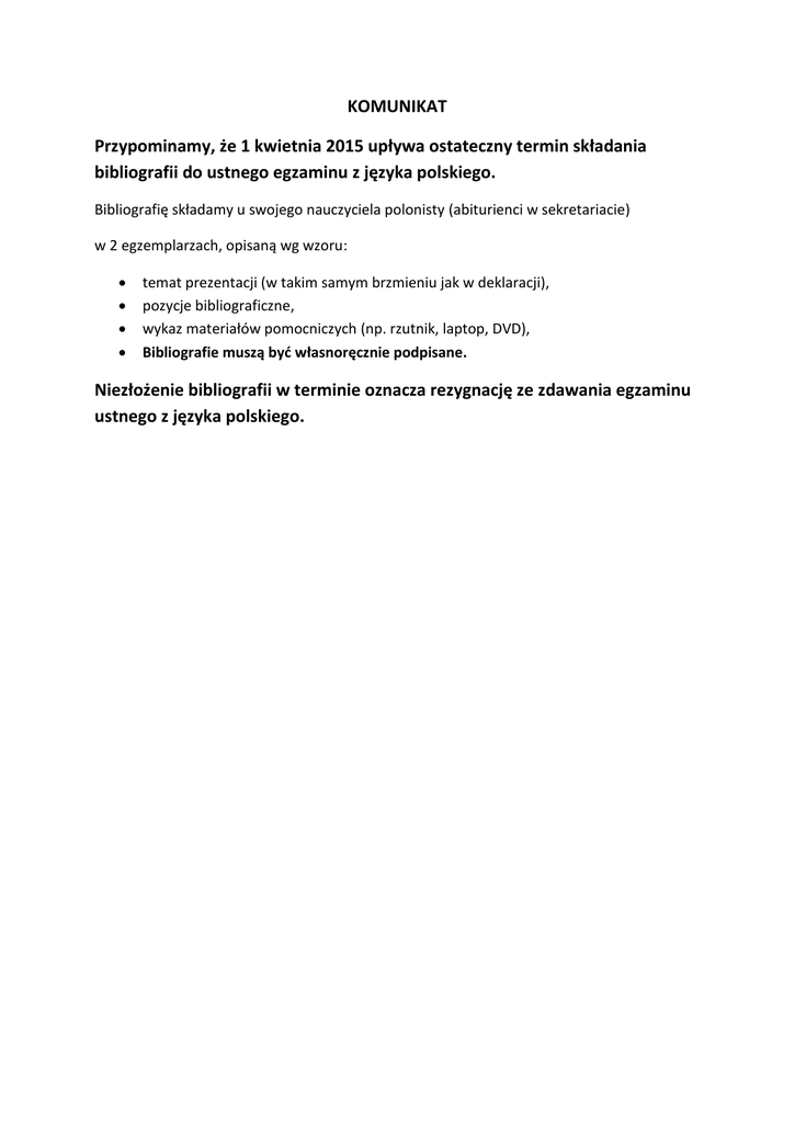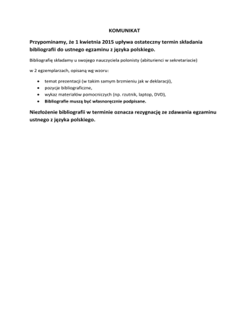 KOMUNIKAT Przypominamy, że 1 kwietnia 2015 upływa ostateczny termin składania bibliografii do ustnego egzaminu z języka polskiego. Bibliografię składamy u swojego nauczyciela polonisty (abiturienci w sekretariacie) w 2 egzemplarzach, opisaną wg wzoru: temat prezentacji (w takim samym brzmieniu jak w deklaracji), pozycje bibliograficzne, wykaz materiałów pomocniczych (np. rzutnik, laptop, DVD), Bibliografie muszą być własnoręcznie podpisane. Niezłożenie bibliografii w terminie oznacza rezygnację ze zdawania egzaminu ustnego z języka polskiego.