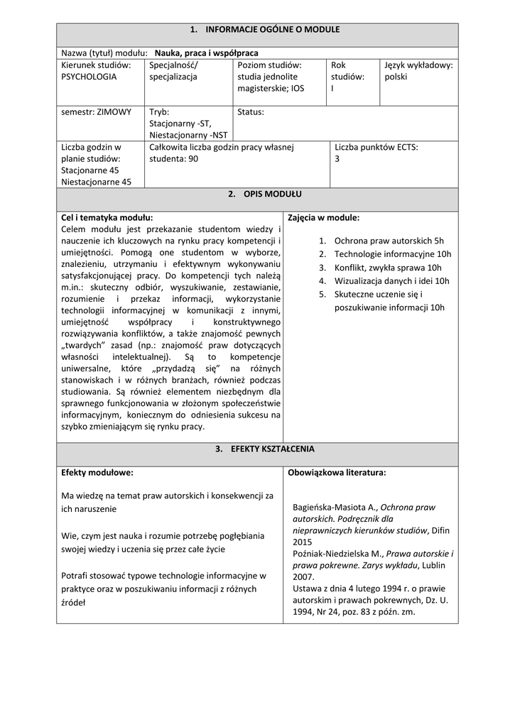 1. INFORMACJE OGÓLNE O MODULE Nazwa (tytuł) modułu: Nauka, praca i współpraca Kierunek studiów: Specjalność/ Poziom studiów: PSYCHOLOGIA specjalizacja studia jednolite magisterskie; IOS semestr: ZIMOWY Liczba godzin w planie studiów: Stacjonarne 45 Niestacjonarne 45 Tryb: Status: Stacjonarny -ST, Niestacjonarny -NST Całkowita liczba godzin pracy własnej studenta: 90 Rok studiów: I Język wykładowy: polski Liczba punktów ECTS: 3 2. OPIS MODUŁU Cel i tematyka modułu: Zajęcia w module: Celem modułu jest przekazanie studentom wiedzy i nauczenie ich kluczowych na rynku pracy kompetencji i 1. Ochrona praw autorskich 5h umiejętności. Pomogą one studentom w wyborze, 2. Technologie informacyjne 10h znalezieniu, utrzymaniu i efektywnym wykonywaniu 3. Konflikt, zwykła sprawa 10h satysfakcjonującej pracy. Do kompetencji tych należą 4. Wizualizacja danych i idei 10h m.in.: skuteczny odbiór, wyszukiwanie, zestawianie, 5. Skuteczne uczenie się i rozumienie i przekaz informacji, wykorzystanie poszukiwanie informacji 10h technologii informacyjnej w komunikacji z innymi, umiejętność współpracy i konstruktywnego rozwiązywania konfliktów, a także znajomość pewnych „twardych” zasad (np.: znajomość praw dotyczących własności intelektualnej). Są to kompetencje uniwersalne, które „przydadzą się” na różnych stanowiskach i w różnych branżach, również podczas studiowania. Są również elementem niezbędnym dla sprawnego funkcjonowania w złożonym społeczeństwie informacyjnym, koniecznym do odniesienia sukcesu na szybko zmieniającym się rynku pracy. 3. EFEKTY KSZTAŁCENIA Efekty modułowe: Ma wiedzę na temat praw autorskich i konsekwencji za ich naruszenie Wie, czym jest nauka i rozumie potrzebę pogłębiania swojej wiedzy i uczenia się przez całe życie Potrafi stosować typowe technologie informacyjne w praktyce oraz w poszukiwaniu informacji z różnych źródeł Obowiązkowa literatura: Bagieńska-Masiota A., Ochrona praw autorskich. Podręcznik dla nieprawniczych kierunków studiów, Difin 2015 Poźniak-Niedzielska M., Prawa autorskie i prawa pokrewne. Zarys wykładu, Lublin 2007. Ustawa z dnia 4 lutego 1994 r. o prawie autorskim i prawach pokrewnych, Dz. U. 1994, Nr 24, poz. 83 z późn. zm. Potrafi korzystać z Internetu jako narzędzia komunikacji i poszukiwania informacji Zna podstawowe metody wizualizacji i prezentacji danych oraz potrafi je zastosować do przygotowania posteru lub infografiki Potrafi określać priorytety podczas wykonywania zadań indywidualnych i zespołowych Fisher, R. Ury, W. Patton, B. (2000). Dochodząc do tak: negocjowanie bez poddawania się. Warszawa: Polskie Wydawnictwo Ekonomiczne. Do's and Don'ts of Poster Presentation, Steven M. Block, Biophysical Journal, 1996, 71: 3527-3529 (http://web.stanford.edu/group/blocklab /dos%20and%20donts%20of%20poster% 20presentation.pdf). Buzan, T. (2007). Pamięć na zawołanie. Metody i techniki pamięciowe. Warszawa: AHA. McBurney, D. (2002). Myśleć jak psycholog. Gdańsk: Gdańskie Wydawnictwo Psychologiczne.
