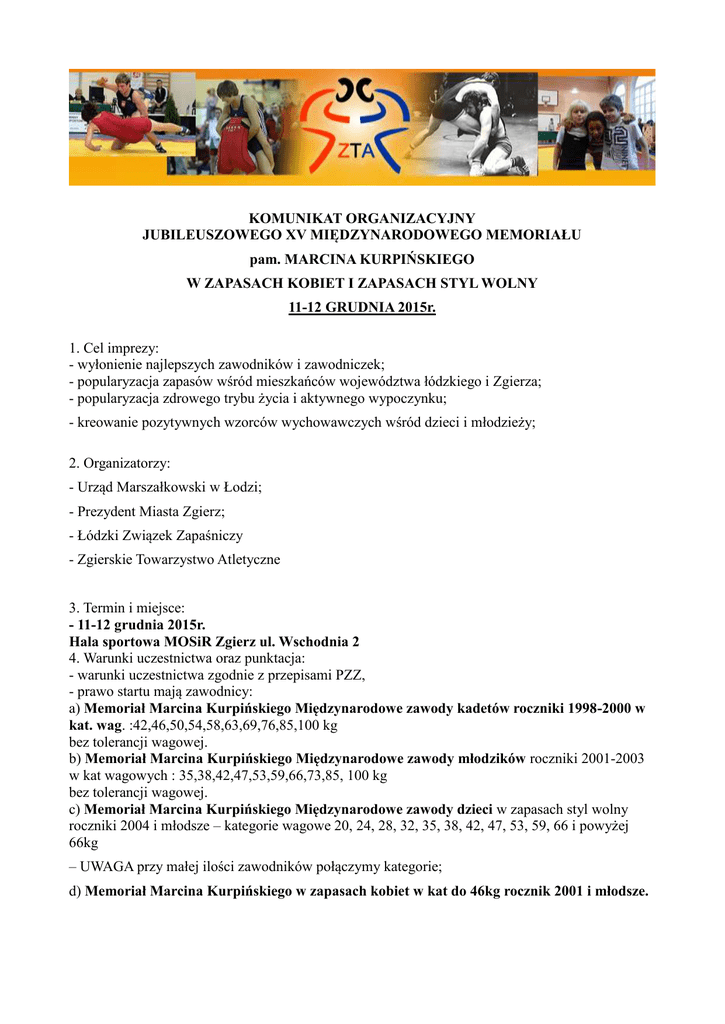 KOMUNIKAT ORGANIZACYJNY JUBILEUSZOWEGO XV MIĘDZYNARODOWEGO MEMORIAŁU pam. MARCINA KURPIŃSKIEGO W ZAPASACH KOBIET I ZAPASACH STYL WOLNY 11-12 GRUDNIA 2015r. 1. Cel imprezy: - wyłonienie najlepszych zawodników i zawodniczek; - popularyzacja zapasów wśród mieszkańców województwa łódzkiego i Zgierza; - popularyzacja zdrowego trybu życia i aktywnego wypoczynku; - kreowanie pozytywnych wzorców wychowawczych wśród dzieci i młodzieży; 2. Organizatorzy: - Urząd Marszałkowski w Łodzi; - Prezydent Miasta Zgierz; - Łódzki Związek Zapaśniczy - Zgierskie Towarzystwo Atletyczne 3. Termin i miejsce: - 11-12 grudnia 2015r. Hala sportowa MOSiR Zgierz ul. Wschodnia 2 4. Warunki uczestnictwa oraz punktacja: - warunki uczestnictwa zgodnie z przepisami PZZ, - prawo startu mają zawodnicy: a) Memoriał Marcina Kurpińskiego Międzynarodowe zawody kadetów roczniki 1998-2000 w kat. wag. :42,46,50,54,58,63,69,76,85,100 kg bez tolerancji wagowej. b) Memoriał Marcina Kurpińskiego Międzynarodowe zawody młodzików roczniki 2001-2003 w kat wagowych : 35,38,42,47,53,59,66,73,85, 100 kg bez tolerancji wagowej. c) Memoriał Marcina Kurpińskiego Międzynarodowe zawody dzieci w zapasach styl wolny roczniki 2004 i młodsze – kategorie wagowe 20, 24, 28, 32, 35, 38, 42, 47, 53, 59, 66 i powyżej 66kg – UWAGA przy małej ilości zawodników połączymy kategorie; d) Memoriał Marcina Kurpińskiego w zapasach kobiet w kat do 46kg rocznik 2001 i młodsze. NAGRODY w kategoriach wiekowych zawodnicy zajmujący miejsca 1-3 medale i dyplomy w klasyfikacji drużynowej (łącznej) za miejsca 1-3 puchary; ZGŁOSZENIA do dnia 07 grudnia 2015r. proszę kierować na adres [email protected] z podaniem nazwy klubu, nazwiska i imienia zawodnika, roku urodzenia oraz kategorii wagowej; Z uwagi na porządek organizacyjny i dyscyplinę finansową BARDZO PROSIMY O WCZEŚNIEJSZE ZGŁASZANIE ZAWODNIKÓW I ZAWODNICZEK! NOCLEGI Istnieje możliwość zarezerwowania noclegów: Nocleg w warunkach „hotelowych”(pokoje z łazienkami) ze śniadaniem – 50zł; Nocleg w warunkach „internatowych” łazienki na korytarzu, bez wyżywienia – 20zł; WPISOWE Dziewczyny, dzieci – 7zł; Kadeci i młodzicy – 8zł; Prosimy o poważne potraktowanie kwestii zgłoszeń; PROGRAM ZAWODÓW 11 grudnia /piątek/ 17:30 – waga i kontrola lekarska w sali zapaśniczej ZTA ul. Wschodnia 2 w Zgierzu; 18:00 – podział miejsc noclegowych; 12 grudnia /sobota/ w Duża Hala MOSiR w Zgierzu 8:00-08:30 – waga i kontrola lekarska 09:30-13:30 – walki eliminacyjne' 13:30-16:00 – przerwa obiadowa od 16:00 – otwarcie zawodów i walki finałowe