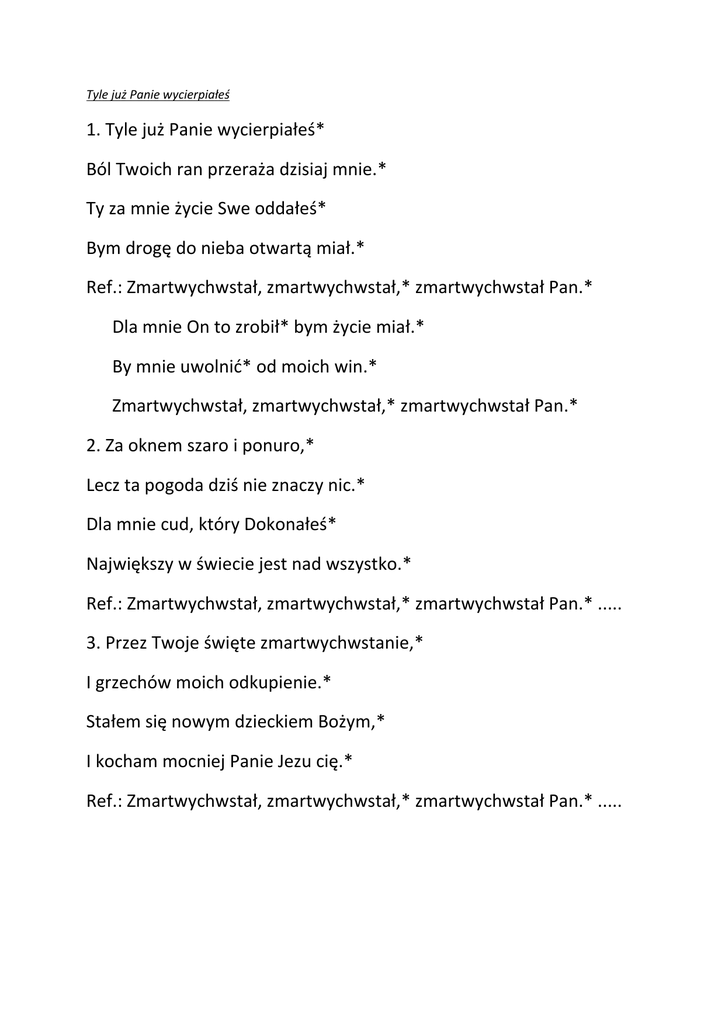 Tyle już Panie wycierpiałeś 1. Tyle już Panie wycierpiałeś* Ból Twoich ran przeraża dzisiaj mnie.* Ty za mnie życie Swe oddałeś* Bym drogę do nieba otwartą miał.* Ref.: Zmartwychwstał, zmartwychwstał,* zmartwychwstał Pan.* Dla mnie On to zrobił* bym życie miał.* By mnie uwolnić* od moich win.* Zmartwychwstał, zmartwychwstał,* zmartwychwstał Pan.* 2. Za oknem szaro i ponuro,* Lecz ta pogoda dziś nie znaczy nic.* Dla mnie cud, który Dokonałeś* Największy w świecie jest nad wszystko.* Ref.: Zmartwychwstał, zmartwychwstał,* zmartwychwstał Pan.* ..... 3. Przez Twoje święte zmartwychwstanie,* I grzechów moich odkupienie.* Stałem się nowym dzieckiem Bożym,* I kocham mocniej Panie Jezu cię.* Ref.: Zmartwychwstał, zmartwychwstał,* zmartwychwstał Pan.* .....