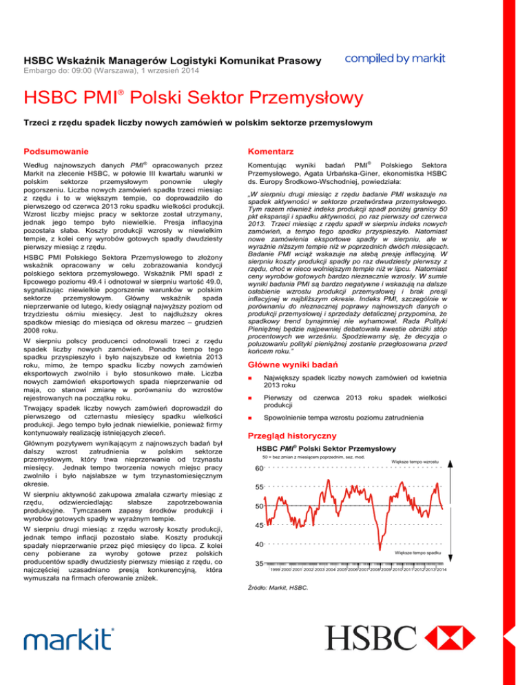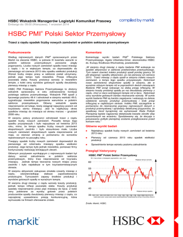 HSBC Wskaźnik Managerów Logistyki Komunikat Prasowy Embargo do: 09:00 (Warszawa), 1 wrzesień 2014 HSBC PMI Polski Sektor Przemysłowy Trzeci z rzędu spadek liczby nowych zamówień w polskim sektorze przemysłowym Podsumowanie Komentarz Według najnowszych danych PMI opracowanych przez Markit na zlecenie HSBC, w połowie III kwartału warunki w polskim sektorze przemysłowym ponownie uległy pogorszeniu. Liczba nowych zamówień spadła trzeci miesiąc z rzędu i to w większym tempie, co doprowadziło do pierwszego od czerwca 2013 roku spadku wielkości produkcji. Wzrost liczby miejsc pracy w sektorze został utrzymany, jednak jego tempo było niewielkie. Presja inflacyjna pozostała słaba. Koszty produkcji wzrosły w niewielkim tempie, z kolei ceny wyrobów gotowych spadły dwudziesty pierwszy miesiąc z rzędu. ® HSBC PMI Polskiego Sektora Przemysłowego to złożony wskaźnik opracowany w celu zobrazowania kondycji polskiego sektora przemysłowego. Wskaźnik PMI spadł z lipcowego poziomu 49.4 i odnotował w sierpniu wartość 49.0, sygnalizując niewielkie pogorszenie warunków w polskim sektorze przemysłowym. Główny wskaźnik spada nieprzerwanie od lutego, kiedy osiągnął najwyższy poziom od trzydziestu ośmiu miesięcy. Jest to najdłuższy okres spadków miesiąc do miesiąca od okresu marzec – grudzień 2008 roku. W sierpniu polscy producenci odnotowali trzeci z rzędu spadek liczby nowych zamówień. Ponadto tempo tego spadku przyspieszyło i było najszybsze od kwietnia 2013 roku, mimo, że tempo spadku liczby nowych zamówień eksportowych zwolniło i było stosunkowo małe. Liczba nowych zamówień eksportowych spada nieprzerwanie od maja, co stanowi zmianę w porównaniu do wzrostów rejestrowanych na początku roku. Trwający spadek liczby nowych zamówień doprowadził do pierwszego od czternastu miesięcy spadku wielkości produkcji. Jego tempo było jednak niewielkie, ponieważ firmy kontynuowały realizację istniejących zleceń. Głównym pozytywem wynikającym z najnowszych badań był dalszy wzrost zatrudnienia w polskim sektorze przemysłowym, który trwa nieprzerwanie od trzynastu miesięcy. Jednak tempo tworzenia nowych miejsc pracy zwolniło i było najsłabsze w tym trzynastomiesięcznym okresie. W sierpniu aktywność zakupowa zmalała czwarty miesiąc z rzędu, odzwierciedlając słabsze zapotrzebowania produkcyjne. Tymczasem zapasy środków produkcji i wyrobów gotowych spadły w wyraźnym tempie. W sierpniu drugi miesiąc z rzędu wzrosły koszty produkcji, jednak tempo inflacji pozostało słabe. Koszty produkcji spadały nieprzerwanie przez pięć miesięcy do lipca. Z kolei ceny pobierane za wyroby gotowe przez polskich producentów spadły dwudziesty pierwszy miesiąc z rzędu, co najczęściej uzasadniano presją konkurencyjną, która wymuszała na firmach oferowanie zniżek. Komentując wyniki badań PMI® Polskiego Sektora Przemysłowego, Agata Urbańska-Giner, ekonomistka HSBC ds. Europy Środkowo-Wschodniej, powiedziała: „W sierpniu drugi miesiąc z rzędu badanie PMI wskazuje na spadek aktywności w sektorze przetwórstwa przemysłowego. Tym razem również indeks produkcji spadł poniżej granicy 50 pkt ekspansji i spadku aktywności, po raz pierwszy od czerwca 2013. Trzeci miesiąc z rzędu spadł w sierpniu indeks nowych zamówień, a tempo tego spadku przyspieszyło. Natomiast nowe zamówienia eksportowe spadły w sierpniu, ale w wyraźnie niższym tempie niż w poprzednich dwóch miesiącach. Badanie PMI wciąż wskazuje na słabą presję inflacyjną. W sierpniu koszty produkcji spadły po raz dwudziesty pierwszy z rzędu, choć w nieco wolniejszym tempie niż w lipcu. Natomiast ceny wyrobów gotowych bardzo nieznacznie wzrosły. W sumie wyniki badania PMI są bardzo negatywne i wskazują na dalsze osłabienie wzrostu produkcji przemysłowej i brak presji inflacyjnej w najbliższym okresie. Indeks PMI, szczególnie w porównaniu do nieznacznej poprawy najnowszych danych o produkcji przemysłowej i sprzedaży detalicznej przypomina, że spadkowy trend bynajmniej nie wyhamował. Rada Polityki Pieniężnej będzie najpewniej debatowała kwestie obniżki stóp procentowych we wrześniu. Spodziewamy się, że decyzja o poluzowaniu polityki pieniężnej zostanie przegłosowana przed końcem roku.” Główne wyniki badań Największy spadek liczby nowych zamówień od kwietnia 2013 roku Pierwszy od czerwca 2013 roku spadek wielkości produkcji Spowolnienie tempa wzrostu poziomu zatrudnienia Przegląd historyczny HSBC PMI® Polski Sektor Przemysłowy 50 = bez zmian z miesiącem poprzednim, sez. mod. Większe tempo wzrostu 60 55 50 45 40 Większe tempo spadku 35 1999 2000 2001 2002 2003 2004 2005 2006 2007 2008 2009 2010 2011 2012 2013 2014 Źródło: Markit, HSBC. Po dalsze informacje prosimy o kontakt: HSBC Agata Urbańska-Giner, Economist Central & Eastern Europe Telefon +44-207-992-2774 Email: [email protected] Magdalena Ujda, Communication Manager HSBC Bank Polska SA Telefon: +48-22-354-0644 / +48 696 070 388 Email: [email protected] Markit Trevor Balchin, Senior Economist Telefon: +44-1491-461-065 Email: [email protected] Joanna Vickers, Corporate Communications Telefon +44-207-260-2234 Email: [email protected] Ewelina Nizioł, Poland Panel Manager Telefon: +44-1491-461-041 Email: [email protected] Uwagi na temat danych: Raport HSBC Polski Sektor Przemysłowy jest oparty na danych opracowanych na podstawie miesięcznych odpowiedzi na kwestionariusze przesyłane kadrze kierowniczej w ponad 200 firmach produkcyjnych. Grupa respondentów ustalana jest według położenia geograficznego i według międzynarodowej standardowej klasyfikacji branżowej – w oparciu o udział branży w PKB. Odpowiedzi uzyskane podczas badania odzwierciedlają ewentualne zmiany w bieżącym miesiącu w porównaniu z miesiącem poprzednim, opierając się na danych zebranych w połowie miesiąca. Dla każdego wskaźnika raport podaje procent respond