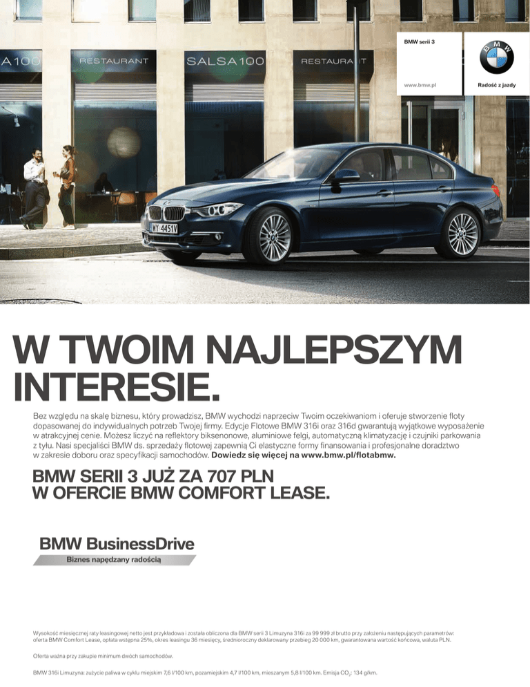 BMW serii 3 www.bmw.pl W TWOIM NAJLEPSZYM INTERESIE. Radość z jazdy Bez względu na skalę biznesu, który prowadzisz, BMW wychodzi naprzeciw Twoim oczekiwaniom i oferuje stworzenie floty dopasowanej do indywidualnych potrzeb Twojej firmy. Edycje Flotowe BMW 316i oraz 316d gwarantują wyjątkowe wyposażenie w atrakcyjnej cenie. Możesz liczyć na reflektory biksenonowe, aluminiowe felgi, automatyczną klimatyzację i czujniki parkowania z tyłu. Nasi specjaliści BMW ds. sprzedaży flotowej zapewnią Ci elastyczne formy finansowania i profesjonalne doradztwo w zakresie doboru oraz specyfikacji samochodów. Dowiedz się więcej na www.bmw.pl/flotabmw. BMW SERII 3 JUŻ ZA 707 PLN W OFERCIE BMW COMFORT LEASE. BMW BusinessDrive Biznes napędzany radością Wysokość miesięcznej raty leasingowej netto jest przykładowa i została obliczona dla BMW serii 3 Limuzyna 316i za 99 999 zł brutto przy założeniu następujących parametrów: oferta BMW Comfort Lease, opłata wstępna 25%, okres leasingu 36 miesięcy, średnioroczny deklarowany przebieg 20 000 km, gwarantowana wartość końcowa, waluta PLN. Oferta ważna przy zakupie minimum dwóch samochodów. BMW 316i Limuzyna: zużycie paliwa w cyklu miejskim 7,6 l/100 km, pozamiejskim 4,7 l/100 km, mieszanym 5,8 l/100 km. Emisja CO2: 134 g/km.