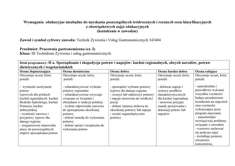 Wymagania edukacyjne niezbędne do uzyskania poszczególnych śródrocznych i rocznych ocen klasyfikacyjnych z obowiązkowych zajęć edukacyjnych (kształcenie w zawodzie) Zawód i symbol cyfrowy zawodu: Technik Żywienia i Usług Gastronomicznych 343404 Przedmiot: Pracownia gastronomiczna (cz. I) Klasa: III Technikum Żywienia i usług gastronomicznych Dział programowy: II a. Sporządzanie i ekspedycja potraw i napojów: kuchni regionalnych, obcych narodów, potraw dietetycznych i wegetariańskich Ocena dopuszczająca Otrzymuje uczeń, który potrafi: Ocena dostateczna Otrzymuje uczeń, który potrafi: Ocena dobra Otrzymuje uczeń, który potrafi: Ocena bardzo dobra Otrzymuje uczeń, który potrafi: Ocena celująca Otrzymuje uczeń, który potrafi: - wymienić asortyment potraw typowych dla polskich kuchni regionalnych: kuchni Beskidu Sądeckiego, kuchni Pomorza, kuchni dobrzyńskiej - wymienić surowce i przyprawy typowe dla danego regionu - zorganizować stanowiska pracy do poszczególnych etapów sporządzania potraw - scharakteryzować wybrane potrawy regionalne - scharakteryzować zwyczaje związane ze świętami i obrzędami w tradycji polskiej - wybrać odpowiedni surowiec do sporządzenia określonej potrawy - dobrać metodę do wykonania potrawy - dobrać sprzęt i urządzenia do wykonania potraw - sporządzić wybrane potrawy typowe dla danego regionu - zważyć lub odmierzyć potrawy i napoje stosownie do wielkości porcji - dobrać zastawę stołową do określonej potrawy lub napoju - ocenić organoleptycznie potrawy - dobierać napoje i zestawy posiłków charakterystycznych dla kuchni regionalnej. - stosować przyjęte zasady porcjowania i dekoracji potraw lub napojów - samodzielnie i prawidłowo wykonać wszystkie czynności będące przedmiotem kształcenia na zajęciach oraz czynności wykraczające poza program nauczania - samodzielnie rozwiązywać problemy związane z zawodem - wzorowo zachować się podczas zajęć - kształtuje postawę otwartości, koleżeństwa, współpracy w grupie - systematycznie i prawidłowo prowadzi dokumentację szkolenia praktycznego - wykazał 100 % frekwencję na zajęciach praktycznych II b. Sporządzanie i ekspedycja potraw i napojów: kuchni obcych narodów - wymienić asortyment potraw typowych dla kuchni innych narodów: kuchni słowackiej, białoruskiej, rosyjskiej, węgierskiej, bułgarskiej, greckiej, tureckiej, żydowskiej, tureckiej, niemieckiej, meksykańskiej, amerykańskiej, chińskiej - wymienić surowce i przyprawy typowe dla danego regionu - zorganizować stanowiska pracy do poszczególnych etapów sporządzania potraw scharakteryzować wybrane potrawy innych narodów świata - scharakteryzować zwyczaje związane ze świętami i obrzędami w tradycji innych narodów - wybrać odpowiedni surowiec do sporządzenia określonej potrawy - dobrać metodę do wykonania potrawy - dobrać sprzęt i urządzenia do wykonania potraw - sporządzić wybrane potrawy typowe dla kuchni innych narodów - zważyć lub odmierzyć potrawy i napoje stosownie do wielkości porcji - dobrać zastawę stołową do określonej potrawy lub napoju - ocenić organoleptycznie potrawy - stosować przyjęte zasady porcjowania i dekoracji potraw lub napojów innych narodów świata -- przeprowadzać kalkulację wybranych potraw - bierze udział w olimpiadach i konkursach gastronomicznych