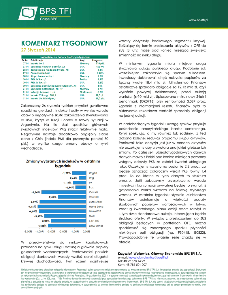 KOMENTARZ TYGODNIOWY 27 Styczeń 2014 Zakończony 26 stycznia tydzień przyniósł gwałtowne spadki na giełdach. Indeksy traciły w wyniku wzrostu obaw o negatywne skutki zakończenia stymulowania w USA, kryzys w Turcji i obaw o rozwój sytuacji w Argentynie. Na tle skali spadków głównych światowych indeksów Wig stracił relatywnie mało. Negatywne nastroje dodatkowo pogłębiły słabe dane z Chin (indeks PMI dla przemysłu poniżej 50 pkt.) w wyniku czego wzrosły obawy o rynki wschodzące. W przeciwieństwie do rynków kapitałowych przecena na rynku długu dotknęła głównie papiery gospodarek wschodzących. Rentowności polskich obligacji skarbowych wzrosły wzdłuż całej długości krzywej dochodowości. Tym razem najsilniejsze wzrosty dotyczyły środkowego segmentu krzywej. Zbliżający się termin przekazania aktywów z OFE do ZUS (3 luty) może pod koniec miesiąca zwiększyć zmienność na rynku długu. W minionym tygodniu miała miejsce druga styczniowa aukcja polskiego długu. Podobnie jak wcześniejsza zakończyła się sporym sukcesem. Inwestorzy deklarowali chęć nabycia papierów za łączną kwotę 18,4 mld zł. Ministerstwo Finansów ostatecznie sprzedało obligacje za 12,13 mld zł, czyli wyraźnie powyżej deklarowanej przed aukcją wartości (6-10 mld zł). Uplasowano m.in. nowy 2-letni benchmark (OK0716) przy rentowności 3,087 proc. Zgodnie z informacjami resortu finansów była to historycznie rekordowa wartość sprzedaży obligacji na jednej aukcji. W nadchodzącym tygodniu uwagę rynków przykuje posiedzenie amerykańskiego banku centralnego. Rynki spekulują, a my również tak sądzimy, iż Fed dokona kolejnej redukcji programu skupu aktywów. Ponieważ taka decyzja jest już w cenach aktywów nie oczekujemy aby wywołała ona jakieś głębsze ich zmiany. Po całej serii ubiegłotygodniowych danych danych makro z Polski pod koniec miesiąca poznamy wstępny odczyty PKB za ostatni kwartał ubiegłego roku. Oczekujemy wzrostu na poziomie 2,2 proc., co będzie oznaczać całoroczny wzrost PKB równy 1,4 proc. To co istotne w tych danych to struktura wzrostu. Jeśli zobaczymy przyspieszenie wzrostu inwestycji i konsumpcji prywatnej będzie to sygnał, iż gospodarka Polska wkracza na ścieżkę szybszego wzrostu. W ostatnim tygodniu stycznia Ministerstwo Finansów poinformuje o wielkości podaży skarbowych papierów wartościowych w lutym. Według kwartalnego planu emisji resort założył w lutym dwie standardowe aukcje. Interesująca będzie struktura oferty. W związku z przekazaniem do ZUS obligacji będących w portfelach OFE, można spodziewać się znaczącego spadku płynności niektórych serii obligacji (np. PS0418, IZ0823). Prawdopodobnie te właśnie serie znajdą się w ofercie. Krzysztof Wołowicz, Główny Ekonomista BPS TFI S.A. e-mail: [email protected] Tel: 48 22 578 14 29 Kom: 48 785 501 007 Niniejszy dokument ma charakter wyłącznie informacyjny. Prognozy i opinie zawarte w niniejszym opracowaniu są wyrazem oceny BPS TFI S.A. i mogą ulec zmianie bez zapowiedzi. Dokument ten nie powinien być rozumiany jako materiał o charakterze doradczym lub jako podstawa do podejmowania decyzji inwestycyjnych lub rekomendacja inwestycyjna, w szczególności nie stanowi on rekomendacji w rozumieniu Rozporządzenia Ministra Finansów z 19 października 2005 r. w sprawie informacji stanowiących rekomendacje dotyczące instrumentów finansowych, ich emitentów lub wystawców (Dz. U. Nr 206, poz. 1715). Pomimo dołożenia należytej staranności przy sporządzaniu niniejszego dokumentu BPS TFI S.A. nie może zapewnić, że prezentowane opinie okażą się trafne, a sytuacja na rynku nie ulegnie zmianie, w szczególności w stosunku do określonych instrumentów finansowych. BPS TFI S.A. nie ponosi jakiejkolwiek odpowiedzialności za działania lub zaniechania podjęte na podstawie niniejszego dokumentu, w szczególności za decyzje inwestycyjne podjęte na podstawie niniejszego komentarza ani za szkody poniesione w wyniku tych decyzji inwestycyjnych.