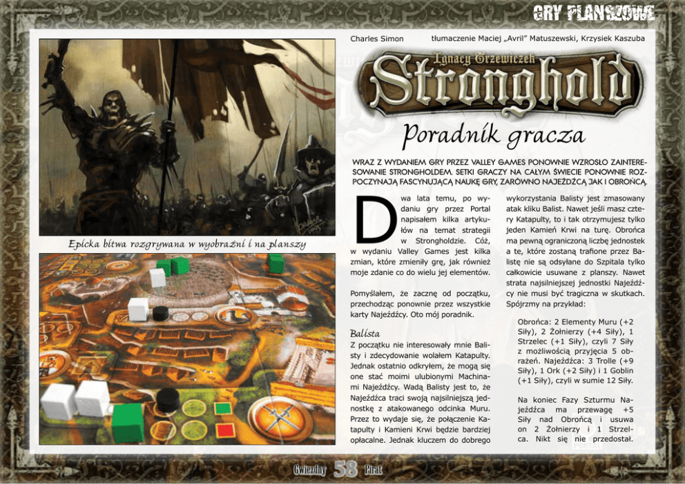 Gry Planszowe Charles Simon tłumaczenie Maciej „Avril” Matuszewski, Krzysiek Kaszuba poradnik gracza Poradnik gracza Wraz z wydaniem gry przez Valley Games ponownie wzrosło zainteresowanie Strongholdem. Setki graczy na całym świecie ponownie rozpoczynają fascynującą naukę gry, zarówno Najeźdźcą jak i Obrońcą. Epicka bitwa rozgrywana w wyobraźni i na planszy D wa lata temu, po wydaniu gry przez Portal napisałem kilka artykułów na temat strategii w Strongholdzie. Cóż, w wydaniu Valley Games jest kilka zmian, które zmieniły grę, jak również moje zdanie co do wielu jej elementów. Pomyślałem, że zacznę od początku, przechodząc ponownie przez wszystkie karty Najeźdźcy. Oto mój poradnik. Balista Z początku nie interesowały mnie Balisty i zdecydowanie wolałem Katapulty. Jednak ostatnio odkryłem, że mogą się one stać moimi ulubionymi Machinami Najeźdźcy. Wadą Balisty jest to, że Najeźdźca traci swoją najsilniejszą jednostkę z atakowanego odcinka Muru. Przez to wydaje się, że połączenie Katapulty i Kamieni Krwi będzie bardziej opłacalne. Jednak kluczem do dobrego Gwiezdny 58 Pirat wykorzystania Balisty jest zmasowany atak kliku Balist. Nawet jeśli masz cztery Katapulty, to i tak otrzymujesz tylko jeden Kamień Krwi na turę. Obrońca ma pewną ograniczoną liczbę jednostek a te, które zostaną trafione przez Balistę nie są odsyłane do Szpitala tylko całkowicie usuwane z planszy. Nawet strata najsilniejszej jednostki Najeźdźcy nie musi być tragiczna w skutkach. Spójrzmy na przykład: Obrońca: 2 Elementy Muru (+2 Siły), 2 Żołnierzy (+4 Siły), 1 Strzelec (+1 Siły), czyli 7 Siły z możliwością przyjęcia 5 obrażeń. Najeźdźca: 3 Trolle (+9 Siły), 1 Ork (+2 Siły) i 1 Goblin (+1 Siły), czyli w sumie 12 Siły. Na koniec Fazy Szturmu Najeźdźca ma przewagę +5 Siły nad Obrońcą i usuwa on 2 Żołnierzy i 1 Strzelca. Nikt się nie przedostał. Gry Planszowe ca i tak będzie tracił jednostki w wyniku ataku Balisty, lub będzie musiał je wycofywać. Umieszczenie Wichru na odpowiednich odcinkach Muru zwiększy koszty jego przegrupowań. Jednakże, jeśli Balista z sukcesem zaatakuje Mur, Obrońca straci Żołnierza (-2 Siły, czyli zostało 5 Siły, a może przyjąć tylko 3 obrażenia), a Najeźdźca straci Trolla (-3 Siły, czyli zostało 9). Po rozpatrzeniu Szturmu, Najeźdźca zadaje +4 obrażenia, Obrońca może przyjąć tylko 3, więc powstaje wyłom. Ogólna zasada dotycząca Machin strzelających (Balista, Katapulta, Trebusz) jest taka, że należy je szybko wybudować. Pozbycie się z talii wszystkich kart Pudła jest kluczem do sukcesu na późniejszych etapach gry. Balisty mają jednak pewną przewagę nad Katapultami i Trebuszami jeśli trafią wcześnie. Co prawda nie pozbywasz się kart Pudła, ale wciąż usuwasz jednostki Obrońcy z plan- szy. Zawsze coś, nawet jeśli nie oczyszczasz sobie talii. Współdziałanie: Za wiele tutaj nie zdziałamy. Precyzyjny Ostrzał może pomóc, ale kosztem 2 Klepsydr. Tak naprawdę żaden Rytuał czy cokolwiek innego nie pomoże tej Machinie. To siła sama w sobie czyni ją użyteczną niezależnie od wyciąganych kart. Według mnie najsilniejszą kartą w fazie drugiej jest Osłona/Balista/ Katapulta. W pierwszej turze Najeźdźca otrzymuje 5 Surowców, plus 5 na początku fazy pierwszej. Musi jedynie poświęcić Orka, aby otrzymać +2 Surowce i rozpoczyna fazę drugą z 12 surowcami. Pozwala to na jednoczesną budowę Balisty i Katapulty już w pierwszej turze. Jeśli masz dostęp do Rytuału Kamieni Krwi, to Balista i kombinacja Katapulta + Kamienie Krwi może być dla Obrońcy naprawdę straszna. Jedyną opcją jaka nam zostaje jest połączenie Balisty z Wichrem. Obroń- Gwiezdny Podsumowanie: Moja ulubiona Machina. Dopóki nie mam lepszej kombinacji kart na ręku, zazwyczaj wybiorę Balistę na samym początku. Dwie sąsiadujące ze sobą Balisty to dla mnie standardowa strategia. Stawia to Obrońcę w ciężkiej sytuacji: różne fragmenty Muru są narażone na ewentualne ataki. Jeśli Mury wzmocni się jednostkami, istnieje duże ryzyko ich straty. Jeśli wycofać te jednostki, powstaje ryzyko droższego ich przegrupowania (pod wpływem Wichru). Jedynym problemem jest zależność od Detonacji Orków w celu uzyskania bonusowych punktów za zniszczenie Murów. Katapulta Kiedyś uwielbiałem Katapulty, ale teraz czuję do nich jedynie sentyment. Na początku są niezbyt dokładne, ale z czasem się rozwijają. Wciąż uważam, że sąsiadujące Katapulty są przydatne, gdyż mogą namierzać te same odcinki Murów. To daje szansę na dwa trafienia w jeden odcinek. Osobiście uważam, że są niewarte zachodu dopóki nie stoją obok siebie. Współdziałanie: Rytuał Kamieni Krwi. Gdyby nie on, to prawdopodobnie w ogóle bym nie budował Katapult. Na szczęście Kamienie Krwi są na trzech z pięciu kart Rytu- 59 Pirat ałów, więc jest spora szansa na ich dobranie. No i nie zapominajmy o karcie Osłona/Balista/Katapulta. Uważam, że Precyzyjny Ostrzał lepiej pasuje do Katapulty (dla dodatkowych punktów za niszczenie Murów) niż do Balisty. Dodatkowa Chwała za Klepsydry jest opłacalna. Precyzyjny Ostrzał użyty na Katapultach z Kamieniami Krwi jest bardzo skuteczny. Artylerzysta może być przydatny, jednak staram się go unikać i liczę na samoczynne wyplewienie kart Pudeł z talii. Jeśli jednak Obrońca dorzuca sporo tych kart do mojej talii, to wolę doładować się kilkoma Trafieniami pod koniec gry. Podsumowanie Niezłe, ale nie korzystałbym z nich gdyby nie Kamienie Krwi. Taktyka z sąsiadującymi Katapultami jest nadal skuteczna, jeśli zależy nam na dodatkowych punktach. Ołtarz Nigdy nie byłem fanem Ołtarza. Ma dość standardowe zastosowanie, ale jest na pewno lepszy od Chorągwi. Znaleźć można go tylko na kartach z Balistą i Taranem. Jeśli planujesz budowę Taranu, zignoruj Ołtarz. Jeśli myślisz o Baliście, to może być przy