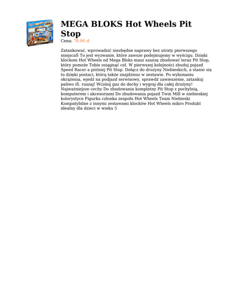 MEGA BLOKS Hot Wheels Pit Stop Cena: 78.06 zł Zatankować, wprowadzić niezbędne naprawy bez utraty pierwszego miejscaŚ To jest wyzwanie, które zawsze podejmujemy w wyścigu. Dzięki klockom Hot Wheels od Mega Bloks masz szansę zbudować teraz Pit Stop, który pomoże Tobie osiągnąć cel. W pierwszej kolejności zbuduj pojazd Speed Racer a później Pit Stop. Dołącz do drużyny Niebieskich, a stanie się to dzięki postaci, którą także znajdziesz w zestawie. Po wykonaniu okrążenia, wjedź na podjazd serwisowy, sprawdź zawieszenie, zatankuj paliwo iŚ. ruszaj! Wciśnij gaz do dechy i wygraj dla całej drużyny! Najważniejsze cechy Do zbudowania kompletny Pit Stop z pochylnią, komputerem i akcesoriami Do zbudowania pojazd Twin Mill w niebieskiej kolorystyce Figurka członka zespołu Hot Wheels Team Niebieski Kompatybilne z innymi zestawami klocków Hot Wheels mikro Produkt idealny dla dzieci w wieku 5