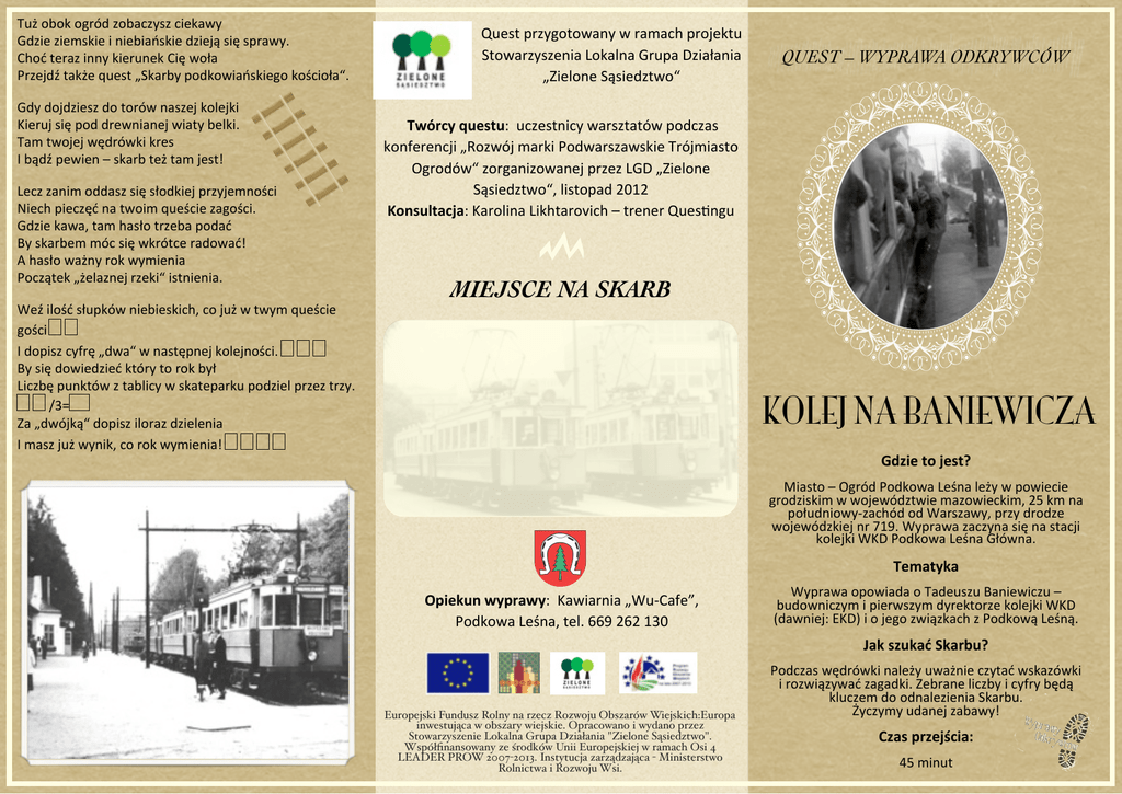 Tuż obok ogród zobaczysz ciekawy Gdzie ziemskie i niebiańskie dzieją się sprawy. Choć teraz inny kierunek Cię woła Przejdź także quest „Skarby podkowiańskiego kościoła“. Gdy dojdziesz do torów naszej kolejki Kieruj się pod drewnianej wiaty belki. Tam twojej wędrówki kres I bądź pewien – skarb też tam jest! Lecz zanim oddasz się słodkiej przyjemności Niech pieczęć na twoim queście zagości. Gdzie kawa, tam hasło trzeba podać By skarbem móc się wkrótce radować! A hasło ważny rok wymienia Początek „żelaznej rzeki“ istnienia. Weź ilość słupków niebieskich, co już w twym queście gości I dopisz cyfrę „dwa“ w następnej kolejności. By się dowiedzieć który to rok był Liczbę punktów z tablicy w skateparku podziel przez trzy. /3= Za „dwójką“ dopisz iloraz dzielenia I masz już wynik, co rok wymienia! Quest przygotowany w ramach projektu Stowarzyszenia Lokalna Grupa Działania „Zielone Sąsiedztwo“ QUEST – WYPRAWA ODKRYWCÓW Twórcy questu: uczestnicy warsztatów podczas konferencji „Rozwój marki Podwarszawskie Trójmiasto Ogrodów“ zorganizowanej przez LGD „Zielone Sąsiedztwo“, listopad 2012 Konsultacja: Karolina Likhtarovich – trener Quesfngu MIEJSCE NA SKARB KOLEJ NA BANIEWICZA Gdzie to jest? Miasto – Ogród Podkowa Leśna leży w powiecie grodziskim w województwie mazowieckim, 25 km na południowy-‐zachód od Warszawy, przy drodze wojewódzkiej nr 719. Wyprawa zaczyna się na stacji kolejki WKD Podkowa Leśna Główna. Tematyka Opiekun wyprawy: Kawiarnia „Wu-‐Cafe”, Podkowa Leśna, tel. 669 262 130 Wyprawa opowiada o Tadeuszu Baniewiczu – budowniczym i pierwszym dyrektorze kolejki WKD (dawniej: EKD) i o jego związkach z Podkową Leśną. Jak szukać Skarbu? Europejski Fundusz Rolny na rzecz Rozwoju Obszarów Wiejskich:Europa inwestująca w obszary wiejskie. Opracowano i wydano przez Stowarzyszenie Lokalna Grupa Działania "Zielone Sąsiedztwo". Współfinansowany ze środków Unii Europejskiej w ramach Osi 4 LEADER PROW 2007-2013. Instytucja zarządzająca - Ministerstwo Rolnictwa i Rozwoju Wsi. Podczas wędrówki należy uważnie czytać wskazówki i rozwiązywać zagadki. Zebrane liczby i cyfry będą kluczem do odnalezienia Skarbu. Życzymy udanej zabawy! Czas przejścia: 45 minut START Zawitaj dziś gościu drogi W Miasta Ogrodu naszego progi. Stacja kolejki to serce jego I punkt centralny od czasu dawnego. Historia Podkowy się bowiem odlicza Od inżyniera Tadeusza Baniewicza. Gdy w latach 20. wieku ubiegłego Zrealizował swą wizję toru żelaznego. Kolejkę EKD „żelazną rzeką“ zwano Bo wzdłuż jej trasy się osiedlano. Podkowę Leśną przed wojną plakaty reklamowały Hasłem „Mieszkaj na wsi – pracuj w mieście“ zachęcały. Baniewicz w Podkowie Leśnej mieszkał I do stolicy, do pracy dojeżdżał. A teraz ruszaj gdzie biletowa kasa Bo ona kierunek twej wędrówki wyznacza. Skręć za nią w lewo, ruszaj wzdłuż płotu Policz niebieskie słupki bez kłopotu. Zapisz tę cyfrę, bo do hasła potrzebna A zagadka przed Tobą jeszcze niejedna. Przez bramę przejdź, tam budynek niepiękny – to się zdarza Ale w 49 r. otwarto tu Klub Kultury Kolejarza. Miejsce – choć stworzone dla pracowników Ekadki Bywali tu wszyscy podkowianie – i starsi, i dziatki. Tadeusz Baniewicz i jego córka Krystyna Chadzali do tutejszego teatru i kina. Zanim opuścisz dawnego MOK-‐u teren I udasz się tam gdzie ptasie trele Spójrz na tablicę, co przy skateparku stoi Bo tam kolejna zagadka się kroi. Zapisz ile punktów tablica wylicza I tym samym swawolę dzieci ogranicza. Wejdź teraz do parku, idż scieżką wąską prosto Aż za drzewami Pałacyku wieżyczki wyrosną. To miejsce, gdzie w latach 30. XX w. dużo się działo I wiele znakomitości tu się zjeżdżało. Stań do furtki tyłem, na końcu Wrzosowej ulicy Ujrzysz willę, co kilkadziesiąt lat sobie liczy. To gniazdo rodzinne kolejki budowniczego I późniejsza posiadłość profesora Michałowskiego. W roku 30. pod patronatem prezydenta Mościckiego Pałacyk był świadkiem III Zjazdu Światowego... Kolejnictwa i Tramwajnictwa. W tamtych czasach Elektryczna Kolej Dojazdowa To była myśl techniczna zupełnie nowa. Nigdy w historii Podkowy nie było tylu narodowości Ilu wówczas zgromadzonych w Pałacyku gości. Willi tej i Pałacyku Kasyna ściany Skrywają fakt chlubną kartą w historii zapisany. Gdyż w czasie Powstania Warszawskiego Był w tych miejscach oddział Szpitala Wolskiego. Rannych powstańców kolejką przywożono I pod troskliwą opieką leczono. Przechodzisz dróżką na lewo od Pałacyku Kasyna Którą odprowadzała ojca na stację córka Krystyna. I choć to wątek opowiadania innego Była żoną archeologa – Kazimierza Michałowskiego. Teraz przed Tobą droga wśród zieleni Po prawej masz staw, co się pięknie kolorami mieni. Gdy przejdziesz mostek nad rzeczką, zaraz skręć w lewo I w kierunku wzgórza podążaj niewielkiego. Na grzbiecie ścieżka, co niegdyś torem saneczkowym była I jako miejsce rekreacji podkowianom służyła. Lecz Ty patrz prosto, gdzie w dole dawnej furtki filary Podejdź do nich, bo stamtąd widok dla Ciebie okazały. Gdy napatrzyłeś się już wędrowcze drogi Na dalekiego domu Baniewicza progi. Kieruj się w lewo, wzdłuż ulicy Parkowej Do Matki Bożej figury biało-‐brązowej. Podejdź do niej, tu kamień węgielny miasta naszego W latach 20. ubiegłego wieku założonego. Tam rok, który twoje wątpliwości rozwieje Od kiedy Podkowy Leśnej liczone są dzieje. Idź teraz drogą Ci jeszcze nieznaną Lecz w tym miejscu wyjątkową, bo wybrukowaną. Dojdziesz do ulicy Lilpopa, jednego z ojców załozycieli Podkowy I do głównej ulicy miasta poprowadzi Cię bruk granitowy. Skręć w lewo, lecz zwróć uwage na aleję Co pamięta z pewnością bardzo dawne dzieje. Chcesz przeżyć przygodę wśród lipowych alej? Weź o nich quest, a teraz ruszaj dalej. Idziesz Jana 