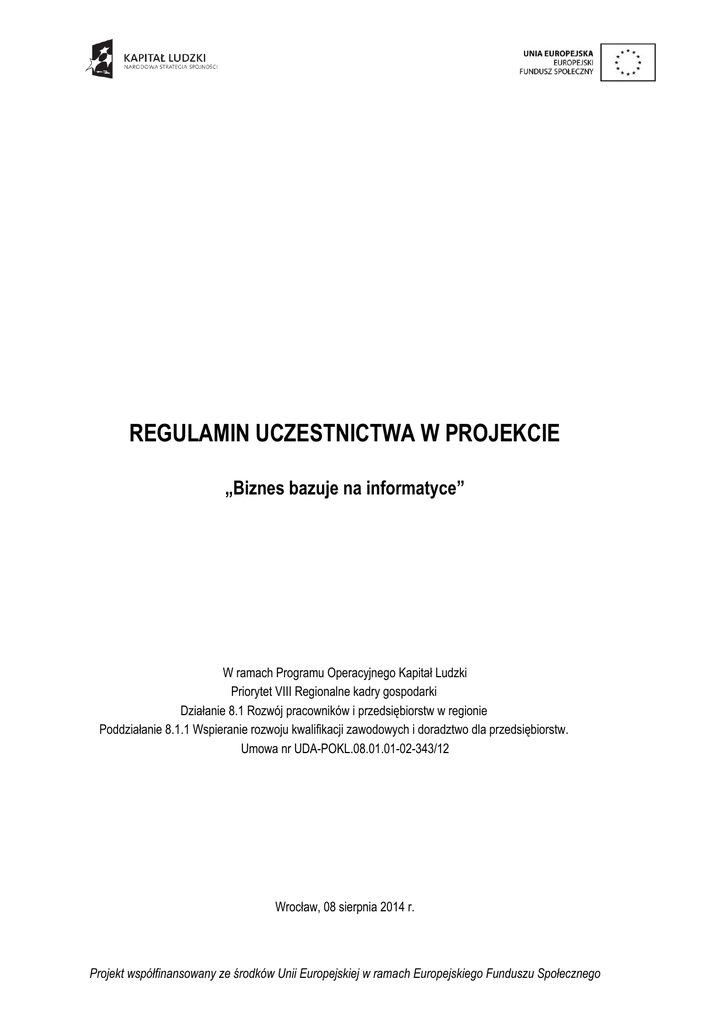 REGULAMIN UCZESTNICTWA W PROJEKCIE „Biznes bazuje na informatyce” W ramach Programu Operacyjnego Kapitał Ludzki Priorytet VIII Regionalne kadry gospodarki Działanie 8.1 Rozwój pracowników i przedsiębiorstw w regionie Poddziałanie 8.1.1 Wspieranie rozwoju kwalifikacji zawodowych i doradztwo dla przedsiębiorstw. Umowa nr UDA-POKL.08.01.01-02-343/12 Wrocław, 08 sierpnia 2014 r. Projekt współfinansowany ze środków Unii Europejskiej w ramach Europejskiego Funduszu Społecznego § 1 PRZEPISY OGÓLNE 1. Regulamin określa warunki rekrutacji i uczestnictwa Beneficjentów Ostatecznych w ramach projektu „Biznes bazuje na informatyce” realizowanego w ramach Programu Operacyjnego Kapitał Ludzki, Priorytet VIII Regionalne kadry gospodarki, Działanie 8.1 Rozwój pracowników i przedsiębiorstw w regionie, Poddziałanie 8.1.1 Wspieranie rozwoju kwalifikacji zawodowych i doradztwo dla przedsiębiorstw. 2. Projekt jest współfinansowany przez Unię Europejską w ramach Europejskiego Funduszu Społecznego. 3. Wszystkie decyzje podejmowane w oparciu o regulamin są zgodne z umową nr UDA-POKL.08.01.01-02-343/12 o dofinansowanie projektu „Biznes bazuje na informatyce” z dnia 29.10.2012 roku, zawartą pomiędzy Topas Sp. z o.o., a Dolnośląskim Wojewódzkim Urzędem Pracy. 4. Okres realizacji projektu: 02.01.2013 – 31.12.2014 roku. 5. Obszar realizacji projektu: województwo dolnośląskie. § 2 SŁOWNIK POJĘĆ Użyte w niniejszym Regulaminie pojęcia, oznaczają: 1. Beneficjent/Wnioskodawca – Topas Sp. z o.o.; 2. Instytucja Pośrednicząca – Dolnośląski Wojewódzki Urząd Pracy; 3. Beneficjent Ostateczny (BO)/Uczestnik Projektu (UP) – osoba zakwalifikowana zgodnie z zasadami określonymi w niniejszym regulaminie do udziału w Projekcie, bezpośrednio korzystająca z wdrażanych szkoleń; 4. Projekt – Projekt „Biznes bazuje na informatyce”; 5. PO KL – Program Operacyjny Kapitał Ludzki; 6. Biuro Projektu – ul. Bema 2, Bema Plaza wejście C, 50-265 Wrocław; 7. EFS – Europejski Fundusz Społeczny; § 3 CEL PROJEKTU 1. Rozwój potencjału 177 MMŚP z branży IT z woj. dolnośląskiego poprzez wzrost kompetencji 210 Administratorów/ek i Programistów/ek (co najmniej 20% K) w wyniku przeprowadzenia zaawanasowanych szkoleń IT z procedurą certyfikacyjną do 12.2014 2. Cele szczegółowe projektu to: a. Podniesienie o minimum 40% wiedzy i umiejętności z zakresu administrowania bazami danych przez 70 Administratorów/ki z województwa dolnośląskiego do 12.2014 b. Podniesienie o minimum 40% wiedzy i umiejętności z zakresu programowania baz danych przez 70 Programistów/ek z woj. dolnośląskiego do 12.2014 c. Podniesienie o minimum 40% wiedzy i umiejętności z zakresu programowania i administracji rozwiązań Business Intelligence przez 70 Programistów /ek i Administratorów/ek z woj. dolnośląskiego do 12.2014 § 4 GRUPA DOCELOWA 1. Wsparcie w projekcie skierowane jest do 177 mikro, małych i średnich przedsiębiorstw z branży IT mających jednostkę organizacyjną w województwie dolnośląskim, nie korzystających dotąd ze szkoleń objętych zasadami pomocy publicznej w ramach PO KL oraz ich 210 pracowników - administratorów/ek i programistów/ek zatrudnionych zgodnie z art. 2 ustawy z dnia 26.06.1974r. kodeksu pracy oraz na umowy cywilno-prawne oraz samozatrudnionych z obszaru województwa dolnośląskiego, posiadających co najwyżej średnie wykształcenie, oczekujących wsparcia dostosowanego do ich specyficznych potrzeb. Projekt współfinansowany ze środków Unii Europejskiej w ramach Europejskiego Funduszu Społecznego 2/8 2. Liczba osób do przeszkolenia: 210 (42 kobiet, 168 mężczyzn) - w tym samozatrudnieni: 129 w tym zatrudnieni w mikroprzedsiębiorstwach: 45 w tym zatrudnieni w małych przedsiębiorstwach: 20 w tym zatrudnieni w średnich przedsiębiorstwach: 16 3. Liczba przedsiębiorstw objętych wsparciem: 177 - Mikroprzedsiębiorstwa: 159 Małe przedsiębiorstwa: 13 Średnie przedsiębiorstwa: 5 § 5 ZGŁOSZENIE UCZESTNICTWA 1. Wstępne zgłoszenie uczestnictwa w szkoleniach oferowanych przez Projektodawcę odbywa się przez wypełnienie, podpisanie oraz przesłanie Karty zgłoszenia. Dokument stanowi zbiór podstawowych informacji dotyczących Przedsiębiorcy, szkoleń będących przedmiotem jego zainteresowania oraz jest jednocześnie wnioskiem o przyznanie pomocy de minimis zgodnie z Rozporządzeniem Ministra Rozwoju Regionalnego z dnia 15 grudnia 2010 r. w sprawie udzielania pomocy publicznej w ramach Programu Operacyjnego Kapitał Ludzki. 2. Karta Zgłoszenia powinna być podpisana przez osobę uprawnioną do reprezentowania przedsiębiorstwa. 3. Karta Zgłoszenia powinna być przesłana pocztą elektroniczną na adres [email protected]. W przypadku braku takiej możliwości dokumenty powinny zostać przesłane faksem na numer 71 719 88 12 lub dostarczone osobiście do Biura Projektu ul. Bema 2, Bema Plaza wejście C, 50-265 Wrocław. 4. Przesłana Karta Zgłoszenia nie gwarantuje uczestnictwa w wybranym szkoleniu. 5. W przypadku przesłania poprawnie wypełnionej Karty Zgłoszenia i spełnieniu wymogów udziału w szkoleniach dokonywana jest analiza potrzeb szkoleniowych. 6. Na podstawie nadesłanych Kart Zgłoszenia stanowiących deklarację uczestnictwa Przedsiębiorcy w szkoleniu, Projektodawca dokona wyboru zgłoszeń kierując się założeniami i celami projektu. 7. Projektodawca zastrzega sobie prawo zaproponowania innych warunków szkolenia, bądź odmowy przeprowadzenia szkolenia wskazanego w Karcie Zgłoszenia. 8. Informacja o kwalifikacji oraz warunkach przeprowadzania szkolenia zostanie przekazana Przedsiębiorcy pocztą elektroniczną na adres wskazany na Karcie Zgłoszenia lub, w przypadku braku powyższego, telefonicznie pod numer wskazany tamże. § 6 REKRUTACJA 1. Rekrutacja prowadzona będzie w całym regionie w trybie ciągłym od 02.01.2013 do 30.11.2014 przy wsparciu działań informacyjno-promocyjnych.