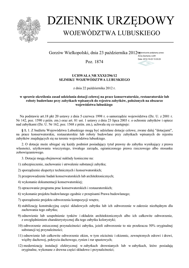 DZIENNIK URZĘDOWY WOJEWÓDZTWA LUBUSKIEGO podpisany przez: Gorzów Wielkopolski, dnia 23 października 2012Elektronicznie r. Anna Zacharia; LUW Poz. 1874 Data: 2012-10-23 13:33:23 UCHWAŁA NR XXXI/296/12 SEJMIKU WOJEWÓDZTWA LUBUSKIEGO z dnia 22 października 2012 r. w sprawie określenia zasad udzielania dotacji celowej na prace konserwatorskie, restauratorskie lub roboty budowlane przy zabytkach wpisanych do rejestru zabytków, położonych na obszarze województwa lubuskiego Na podstawie art.18 pkt 20 ustawy z dnia 5 czerwca 1998 r. o samorządzie województwa (Dz. U. z 2001 r. Nr 142, poz. 1590 z późn. zm.) oraz art. 81 ust. 1 ustawy z dnia 23 lipca 2003 r. o ochronie zabytków i opiece nad zabytkami (Dz. U. Nr 162, poz. 1568 z późn. zm.), uchwala się co następuje: § 1. 1. Z budżetu Województwa Lubuskiego mogą być udzielane dotacje celowe, zwane dalej "dotacjami", na prace konserwatorskie, restauratorskie lub roboty budowlane przy zabytkach wpisanych do rejestru zabytków znajdujących się na terenie województwa lubuskiego. 2. O dotacje może ubiegać się każdy podmiot posiadający tytuł prawny do zabytku wynikający z prawa własności, użytkowania wieczystego, trwałego zarządu, ograniczonego prawa rzeczowego albo stosunku zobowiązaniowego. 3. Dotacje mogą obejmować nakłady konieczne na: 1) zabezpieczenie, zachowanie i utrwalenie substancji zabytku; 2) sporządzenie ekspertyz technicznych i konserwatorskich; 3) przeprowadzenie badań konserwatorskich lub architektonicznych; 4) wykonanie dokumentacji konserwatorskiej; 5) opracowanie programu prac konserwatorskich i restauratorskich; 6) wykonanie projektu budowlanego zgodnie z przepisami Prawa budowlanego; 7) sporządzenie projektu odtworzenia kompozycji wnętrz, 8) stabilizację konstrukcyjną części składowych zabytku lub ich odtworzenie w zakresie niezbędnym dla zachowania tego zabytku; 9) odnowienie lub uzupełnienie tynków i okładzin architektonicznych albo ich całkowite odtworzenie, z uwzględnieniem charakterystycznej dla tego zabytku kolorystyki; 10) odtworzenie zniszczonej przynależności zabytku, jeżeli odtworzenie to nie przekracza 50% oryginalnej substancji tej przynależności; 11) odnowienie lub całkowite odtworzenie okien, w tym ościeżnic i okiennic, zewnętrznych odrzwi i drzwi, więźby dachowej, pokrycia dachowego, rynien i rur spustowych; 12) modernizację instalacji elektrycznej w zabytkach drewnianych lub w zabytkach, które posiadają oryginalne, wykonane z drewna części składowe i przynależności; Dziennik Urzędowy Województwa Lubuskiego –2– Poz. 1874 13) wykonanie izolacji przeciwwilgociowej; 14) uzupełnienie narysów ziemnych dzieł architektury obronnej oraz zabytków archeologicznych nieruchomych o własnych formach krajobrazowych; 15) działania zmierzające do wyeksponowania istniejących, oryginalnych elementów zabytkowego układu parku lub ogrodu; 16) zakup materiałów konserwatorskich i budowlanych, niezbędnych do wykonania prac i robót przy zabytku wpisanym do rejestru, o których mowa w pkt 1 oraz 8 - 15; 17) zakup i montaż instalacji przeciwwłamaniowej oraz przeciwpożarowej i odgromowej. 4. Dotacja może być udzielana na dofinansowanie nakładów koniecznych na wykonanie prac konserwatorskich, restauratorskich lub robót budowlanych przy zabytkach, które wnioskodawca zamierza wykonać w roku złożenia wniosku. 5. Na zasadach określonych w niniejszej uchwale wnioskodawca może wystąpić z kilkoma wnioskami o dotacje na prace konserwatorskie, restauratorskie lub roboty budowlane przy więcej niż jednym zabytku. § 2. 1. Dotacja może być udzielona w wysokości do 50% nakładów koniecznych do wykonania prac konserwatorskich, restauratorskich lub robót budowlanych przy zabytku wpisanym do rejestru zabytków, o którym mowa w §1 ust. 1. 2. Jeżeli zabytek posiada wyjątkową wartość historyczną, artystyczną lub naukową lub stan zachowania zabytku wymaga przeprowadzenia złożonych pod względem technologicznym prac konserwatorskich, restauratorskich lub robót budowlanych, dotacja może być udzielona w wysokości do 100% nakładów koniecznych na wykonanie tych prac lub robót. 3. Łączna kwota dotacji na zadanie będące przedmiotem wniosku, udzielonych ze srodków publicznych przez podmioty do tego uprawnione, nie może przekroczyć wysokości 100% nakładów koniecznych na jego wykonanie. § 3. 1. Udzielenie dotacji może nastąpić po złożeniu przez uprawniony podmiot wniosku o przyznanie dotacji, który powinien zawierać w szczególności: 1) imię i nazwisko, miejsce zamieszkania i adres wnioskodawcy lub nazwę, siedzibę i adres wnioskodawcy będącego jednostką organizacyjną; 2) wskazanie zabytku, przy którym mają być prowadzone prace lub roboty z uwzględnieniem miejsca jego położenia; 3) wskazanie rodzaju prac lub robót, na które ma zostać udzielona dotacja; 4) wnioskowaną kwotę dotacji z budżetu Województwa Lubuskiego; 5) informację o wysokości zaangażowania środków własnych; 6) informację o całkowitym koszcie zadania; 7) planowany termin rozpoczęcia oraz zakończenia prac lub robót, na które ma zostać udzielona dotacja; 8) harmonogram oraz kosztorys przewidywanych prac lub robót ze wskazaniem źródeł ich finansowania; 9) informację o wnioskach o udzielenie dotacji na prace lub roboty objęte wnioskiem skierowanych do innych organów; 10) wykaz prac lub robót wykonanych przy danym zabytku w okresie trzech lat poprzedzających dzień złożenia wniosku z podaniem łącznej wysokości nakładów, w tym wysokości i źródeł dofinansowania otrzymanego ze środków publicznych; 2. Wzór wniosku o udzielenie dotacji celowej określa załącznik nr 1 do niniejszej uchwały. 3. Do wniosku należy dołączyć następujące dokumenty: 1) kopię decyzji o wpisie zabytku, przy którym mają być prowadzone prace lub roboty do rejestru zabytków; Dziennik Urzędowy Województwa Lubuskiego –3– Poz. 
