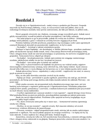 Baśń o Bogach Wojny – Chaska'nawi http://projektwegielek.blox.pl/html Kizzy&Keinstein Rozdział 1 Zaczęło się to w Ogniokoniowicach - małej wiosce u podnóża gór Deszeret. Gospoda nazywała się Pod Kwitnącą Jabłonią, z racji, że rzeczywiście rosła tam jabłoń, choć co do rzekomego kwitnięcia możnaby mieć pewne zastrzerzenia, ale fakt jest faktem, że jabłoń rosła... Drzwi gospody otworzyły się z hukiem, zwracając uwagę wszystkich gości. Jednak nawet gdyby nowoprzybyły wszedł na palach od kuchni niewątpliwie i tak byłby sensacją. - Nie mam pojęcia co go tu przywiodło, jednak nie wróżę mu za dobrze - mruknął gospodarz podając miód jednemu z gości i wskazał na czwórkę łowców sięgających po broń. Pomimo ludzkiej sylwetki przybysza, pojedynczy róg rozcinający czoło i para ogromnych czarnych błoniatych skrzydeł nie pozostawiały wątpliwości, że był to smok. - Nu-kadjia*! - krzyknął w jakimś orientalnym języku. Siedząca w kącie kapłanka - nie dociekajmy w służbie jakiemu bogu - przedtem znudzona i jakby od niechcenia sącząca słodki trunek, teraz z fascynacją obserwowała przerażającą istotę. Choć z drugiej strony smok nie tyle był przerażający co przerażony, bo nerwowo rozglądał się po gospodzie. Tymczasem łowcy zdążyli go okrążyć. - Nu-kadjia! - krzyknął ponownie. Jednak najwyraźniej nie osiągając zamierzonego rezultatu, jakikolwiem miałby on nie być, krzyknął raz jeszcze. - Nu-kadjia! - tym razem głos wyraźnie mu zadrżał. Mag, który w przeciwieństwie do kapłanki nie pierwszy raz widział smoka, najpierw nieszczególnie zainteresowany sytuacją, teraz odwrócił się, żeby lepiej widzieć. Język smoczy słyszał tylko kilka razy w życiu dlatego nie był pewien czy w tym właśnie języku mówi smok. Jednak płowowłosy łowca - najmłodszy z całej czwórki - wątpliwości nie miał, że smoczy język na pewno to nie jest. Inny, na oko jakiś dowódca ostrożnie zwrócił się do smoka: - Sądząc po stroju - powiedział w języku ogólnym. jasnowłosy nie znał go, ani dwóch pozostałych, ale biorąc pod uwagę okolicę cała trójka musiała należeć do oddziału Werwary - nie jesteś stąd. Ubiór smoka owszem, nie przypominał stylu charakterystycznego jego rasie, ani tym bardziej stylu któregoś z regionów graniczących z Ogniokoniowicami. Orientalne połączenie ciepłych barw piasku, pomarańczy i czerwieni, z multum kolorowych sodańskich piór przywodził na myśl obszary raczej nadmorskie. - Czyżbyś zapomniał już o pozycji smoków w tym regionie? - zapytał drwiąco trzeci łowca. Miał paskudną bliznę na prawym policzku, prawdopodobnie pamiątka po jakimś polowaniu. Smok nie raczył odpowiedzieć. Przelotnie tylko spojrzał na łowcę rozglądając się po gospodzie jakby kogoś szukał. - No, skoro zwierzyna sama pcha się w nasze ręce.. - kontynuował urażony ignorancją smoka ten z blizną. - Myślisz, że on nas rozumie? - zapytał czwarty. Był znacznie młodszy od swoich towarzyszy, wiekiem zbliżonym do jasnowłosego. - Owszem, rozmiem - odparł niespodziewanie smok, mówiąc jak na smoka zadziwiająco poprawnie w ogólnym. Nie raczył jednak spojrzeć na swojego rozmówcę - i to lepiej niż by się wam zdawało. A teraz zejdźcie mi z drogi jeśli łaska. Szukam kogoś. Jasnowłosy, zresztą nie tylko on, był zaszokowany bezczelnością, a zarazem odwagą smoka. Choć z drugiej strony zakrawało to na głupotę. Stanięcie przeciwko czterem łowcom smoków i to * Nu-kadjia – czyt. [nukadżja] Baśń o Bogach Wojny – Chaska'nawi http://projektwegielek.blox.pl/html Kizzy&Keinstein jeszcze na ich terenie w pojedynkę do najmądrzejszych posunięć z pewnością nie należało. Chyba, że smok byłby w rzeczywiscości upiorem. Lub... miał w tym jakiś dziwny ukryty cel. - Nie wiem, skąd przychodzisz, ani dokąd zmierzasz - zaczął spokojnie ten, który wyglądał na dowódcę - ale wkroczyłeś na teren polowań, innymi słowy obawiam się, że twoja podróż tutaj dobiegnie końca. - Z tym, to się akurat nie zgodzę - odpalił smok równie opanowanie. Jednak drżenie rąk zdradziło jego niepokój. - sugeruję zostawić mnie w spokoju - kontunuował - nie mam teraz czasu na bójkę. - Czy ty się słyszysz?! - zapytał jasnowłosy zastanawiając się czy smok zdaje sobie sprawę z zaistniałej sytuacji. Pozostali spojrzeli na dotad milczącego łowcę z obcego oddziału. - Ach! Blanka! - smok zainteresował się w końcu rozmówcą - Jakoś z początku cię nie poznałem! - syknął przez zęby a w jego oczach błysnęło coś niepokojącego. - no, w końcu po tylu latach... - urwał - mam więc zacząc od ciebie jak rozumiem? - dodał półgłosem pełnym jadu i nienawiści, podpierając się pod bok. - Kim ty do cholery jesteś?! - zirytował się jasnowłosy nazwany Blanką. Najwyraźniej podane przez smoka imię musiało być prawdziwe. Blanka - czysty, biały. Ktoś bez przeszłości. Bez ciężaru wspomnień, zaczynający życie od początku. A może to tylko nawiązanie do prawie białych włosów? Tak czy owak było to wielce interesujące imię. - No, wysil trochę tą swoją krótką pamięć! - obserwowanie stopniowo pojawiającej się wściekłości na twarzy łowcy, smokowi najwyraźniej sprawiało ogromną satysfakcję. - No co? Wciąż ci nic nie świta? Ale co ja się dziwię, w końcu rzeź to dla łowców chleb powszedni, trudno spamiętać... może się mylę? - Wystarczy! - przerwał ten co wyglądał na dowódcę i sięgnął po broń. Łowca z blizną również dobył korda i pierwszy zamachnął się na smoka. Ten jednak zdążył zasłonić się skrzydłem i kord trafił w nieunerwioną twardą skórę zatrzymując się na kości nośniej. Łowca cofnął broń, a rozcięta skóra natychmiast się zrosła. Ciężko było dociec, czy to jakaś pieczęć uzdrawiająca, czy może któryś z gości rzucił zaklęcie lecznicz