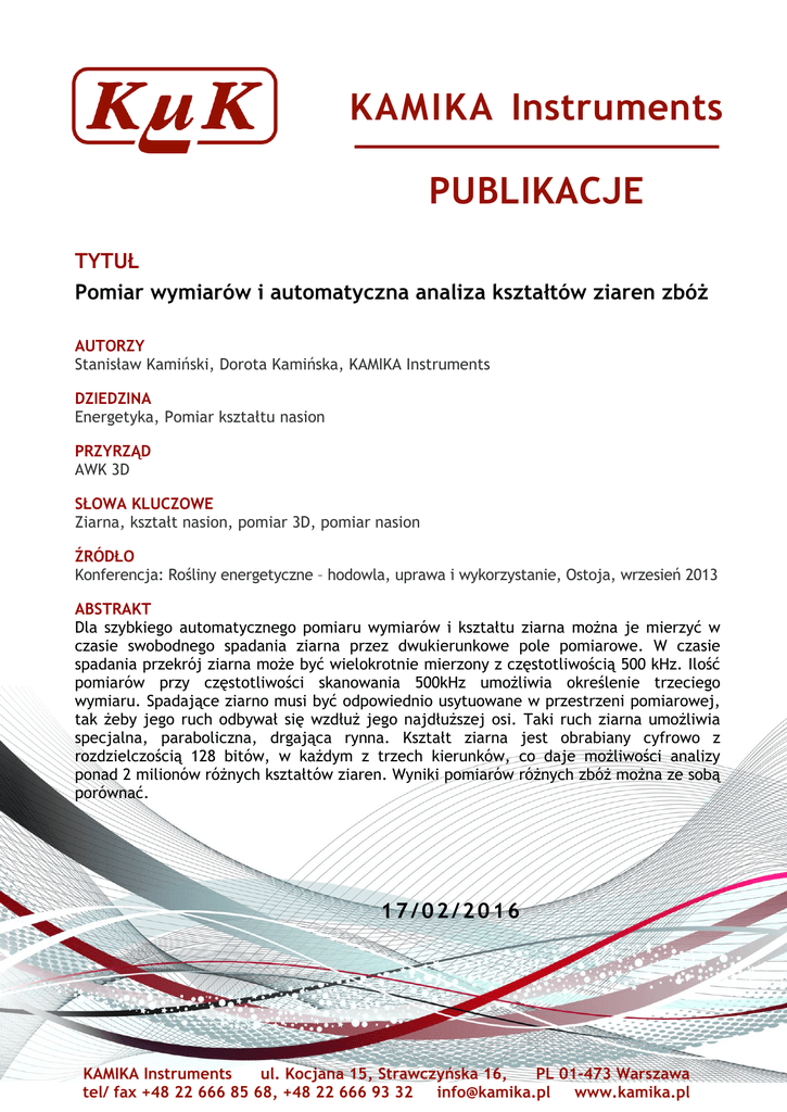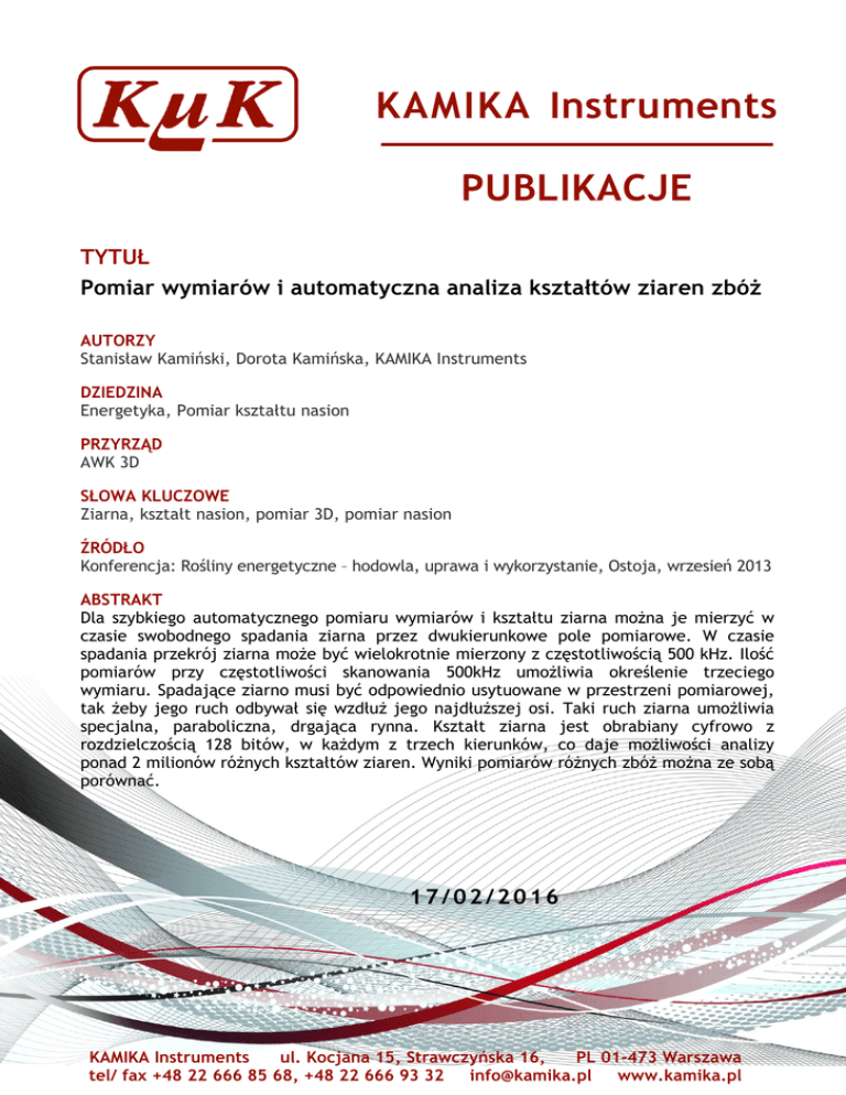 KAMIKA Instruments PUBLIKACJE TYTUŁ Pomiar wymiarów i automatyczna analiza kształtów ziaren zbóż AUTORZY Stanisław Kamiński, Dorota Kamińska, KAMIKA Instruments DZIEDZINA Energetyka, Pomiar kształtu nasion PRZYRZĄD AWK 3D SŁOWA KLUCZOWE Ziarna, kształt nasion, pomiar 3D, pomiar nasion ŹRÓDŁO Konferencja: Rośliny energetyczne – hodowla, uprawa i wykorzystanie, Ostoja, wrzesień 2013 ABSTRAKT Dla szybkiego automatycznego pomiaru wymiarów i kształtu ziarna można je mierzyć w czasie swobodnego spadania ziarna przez dwukierunkowe pole pomiarowe. W czasie spadania przekrój ziarna może być wielokrotnie mierzony z częstotliwością 500 kHz. Ilość pomiarów przy częstotliwości skanowania 500kHz umożliwia określenie trzeciego wymiaru. Spadające ziarno musi być odpowiednio usytuowane w przestrzeni pomiarowej, tak żeby jego ruch odbywał się wzdłuż jego najdłuższej osi. Taki ruch ziarna umożliwia specjalna, paraboliczna, drgająca rynna. Kształt ziarna jest obrabiany cyfrowo z rozdzielczością 128 bitów, w każdym z trzech kierunków, co daje możliwości analizy ponad 2 milionów różnych kształtów ziaren. Wyniki pomiarów różnych zbóż można ze sobą porównać. 17/02/2016 KAMIKA Instruments ul. Kocjana 15, Strawczyńska 16, PL 01-473 Warszawa tel/ fax +48 22 666 85 68, +48 22 666 93 32 [email protected] www.kamika.pl POMIAR WYMIARÓW I AUTOMATYCZNA KSZTAŁTÓW ZIAREN ZBÓŻ ANALIZA Dotychczas używane "Kopciuszki" jako liczniki ziaren dobrze spełniały swoją rolę, ale żeby się czegoś więcej dowiedzieć o kształcie ziaren, to należałoby je wsypać do jakiegoś naczynia, zalać żywicą i wykonać przekrój dla pomiaru kształtu ziaren. Innym sposobem jest fotografia rozsypanych ziaren, z której można odczytać tylko dwa wymiary. Są to bardzo żmudne i wolne sposoby oceny ziaren. Są jeszcze inne optyczne i komputerowe metody wykorzystujące polowy skaner 3D, gdzie w skomplikowany sposób trzeba przetwarzać "chmurę punktów pomiarowych" na kształt ziarna. Obecnie opracowano przyrząd AWK 3D, przedstawiony na Rys. 1, który spełnia wymagania co do wszechstronności, precyzji i szybkości pomiaru ziaren zbóż. Dla opracowania przyrządu wykorzystano optyczno - elektroniczną metodę pomiaru oraz sposób usytuowania ziarna poruszającego się przez przestrzeń pomiarową układu optycznego. Rys. 1 Analizator AWK 3D W tym celu należało ruch ziaren wydobywających się z lejkowatego pojemnika uporządkować w specjalnie drgającej rynnie, tak żeby ziarna spadały w przestrzeń pomiarową pojedynczo i pionowo wzdłuż swojej najdłuższej osi, jak to jest przedstawione na Rys. 2. K A M I K A Instruments Jakość potwierdzona certyfikatem ISO 9001 Pomiar granulacji surowców w mineralurgii przy użyciu nowoczesnych elektronicznych urządzeń pomiarowych Strona: 2 Rys. 2 Rynna analizatora AWK 3D Szybkość poruszania sie ziaren wzdłuż rynny jest stymulowana intensywnością drgań rynny. Prędkość początkowa ziaren na wysokości h jest do zaniedbania, natomiast odkąd ziarno traci kontakt z rynną następuje spadania swobodne i ziarno do płaszczyzny pomiarowej uzyskuje pozycję pionową. Jednoznacznie określona prędkość ziarna w płaszczyźnie pomiaru V=(2gh)-1/2 pozwala określić długość ziarna przez ilość skanowań z częstotliwością 500 kHz (500 000 razy na sek.) Poprzeczny przekrój ziarna mierzy się wielokrotnie w czasie pionowego spadania przy pomocy układu pomiarowego przedstawionego na Rys. 3 Rys. 3 Układ do pomiaru poprzecznych przekrojów ziarna K A M I K A Instruments Jakość potwierdzona certyfikatem ISO 9001 Pomiar granulacji surowców w mineralurgii przy użyciu nowoczesnych elektronicznych urządzeń pomiarowych Strona: 3 W analizatorze AWK 3D stworzona jest płaszczyzna optyczna (przestrzeń pomiarowa), wspólna dla dwóch jednakowych przetworników optycznych usytuowanych do siebie prostopadle (Rys. 3). Przy pomocy takich przetworników można uzyskać ciąg wyników opisujących profile powierzchni poruszającego się ziarna z dwóch kierunków i jednakową długość tych profili w trzecim kierunku. Przetwornik optyczny (Rys. 3) składa się z promiennika [1] oświetlającego układ optyczny [2], który formuje równoległą wiązkę promieniowania [3] o grubości kilkuset m. Układ optyczny [4] skupia promieniowanie wiązki [3] na fotoelemencie [5]. Przestrzeń pomiarowa zawarta jest pomiędzy układem optycznym [2] i [4]. Jeżeli przez przestrzeń pomiarową spadnie ziarno, to spowoduje ono rozproszenie promieniowania i zmianę natężenia prądu płynącego przez fotoelement. Zmiana natężenia będzie proporcjonalna do wymiaru spadającego elementu. Trzy wymiary każdego ziarna są zapisywane w matrycy, np. 126 3, co równe jest ponad dwóm milionom różnych kombinacji wymiarów. Ponadto profil każdego ziarna jest analizowany w czasie rzeczywistym, co daje precyzyjną informację o objętości i kształcie ziarna. Powierzchnia pomiarowa analizatora AWK 3D może być dowolnie duża. Ze względów praktycznych ograniczono ją do wymiarów 40x40 mm, w której można zmierzyć ziarna o maksymalnej wielkości około 30 mm. Do syntetycznej analizy kształtu ziaren można wykorzystać klasyfikację Zingga, która umożliwia podzielenie ziaren na kuliste - kubiczne, spłaszczone - dyskowate, wydłużone - walcowate i o ostrych wydłużonych kształtach, tzw. Klingach. Można zmiennie i bardziej precyzyjne określać kształt ziaren czy małych owoców, jako elipsoidalne, dyskoidalne. idealna kula DYSKI KLINGI KULE WALCE Rys. 4 Diagram pokazujący klasyfikację Zingga Na Rys. 4 przedstawiono klasyfikację według ZIngga, przy czym granicę kształtów do klasyfikacji można ustalać dosyć swobodnie, tutaj zostały określone na 0,67 wymiaru minimalnego do średniego i wymiaru średniego do maksymalnego czyli długości ziarna. Zdefiniowane w tych proporcjach kształty zajmują oddzielne pola na R