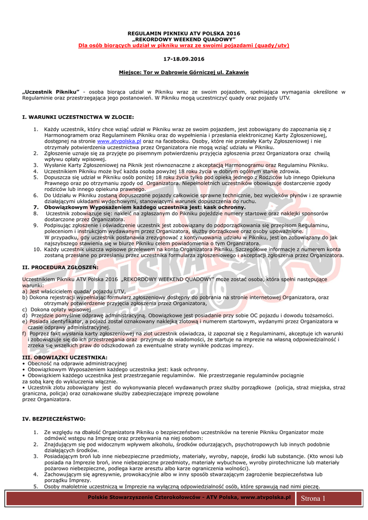 REGULAMIN PIKNIKU ATV POLSKA 2016 „REKORDOWY WEEKEND QUADOWY” Dla osób biorących udział w pikniku wraz ze swoimi pojazdami (quady/utv) 17-18.09.2016 Miejsce: Tor w Dąbrowie Górniczej ul. Zakawie „Uczestnik Pikniku” - osoba biorąca udział w Pikniku wraz ze swoim pojazdem, spełniająca wymagania określone w Regulaminie oraz przestrzegająca jego postanowień. W Pikniku mogą uczestniczyć quady oraz pojazdy UTV. I. WARUNKI UCZESTNICTWA W ZLOCIE: 1. Każdy uczestnik, który chce wziąć udział w Pikniku wraz ze swoim pojazdem, jest zobowiązany do zapoznania się z Harmonogramem oraz Regulaminem Pikniku oraz do wypełnienia i przesłania elektronicznej Karty Zgłoszeniowej, dostępnej na stronie www.atvpolska.pl oraz na facebooku. Osoby, które nie przesłały Karty Zgłoszeniowej i nie otrzymały potwierdzenia uczestnictwa przez Organizatora nie mogą wziąć udziału w Pikniku. 2. Zgłoszenie uznaje się za przyjęte po pisemnym potwierdzeniu przyjęcia zgłoszenia przez Organizatora oraz chwilą wpływu opłaty wpisowej. 3. Wysłanie Karty Zgłoszeniowej na Piknik jest równoznaczne z akceptacją Harmonogramu oraz Regulaminu Pikniku. 4. Uczestnikiem Pikniku może być każda osoba powyżej 18 roku życia w dobrym ogólnym stanie zdrowia. 5. Dopuszcza się udział w Pikniku osób poniżej 18 roku życia tylko pod opieką jednego z Rodziców lub innego Opiekuna Prawnego oraz po otrzymaniu zgody od Organizatora. Niepełnoletnich uczestników obowiązuje dostarczenie zgody rodziców lub innego opiekuna prawnego. 6. Do Udziału w Pikniku zostaną dopuszczone pojazdy całkowicie sprawne technicznie, bez wycieków płynów i ze sprawnie działającymi układami wydechowymi, stanowiącymi warunek dopuszczenia do ruchu. 7. Obowiązkowym Wyposażeniem każdego uczestnika jest: kask ochronny. 8. Uczestnik zobowiązuje się: nakleić na zgłaszanym do Pikniku pojeździe numery startowe oraz naklejki sponsorów dostarczone przez Organizatora. 9. Podpisując zgłoszenie i oświadczenie uczestnik jest zobowiązany do podporządkowania się przepisom Regulaminu, poleceniom i instrukcjom wydawanym przez Organizatora, służby porządkowe oraz osoby upoważnione. W przypadku, gdy uczestnik postanawia zrezygnować z kontynuowania udziału w Pikniku, jest on zobowiązany do jak najszybszego stawienia się w biurze Pikniku celem powiadomienia o tym Organizatora. 10. Każdy uczestnik uiszcza wpisowe przelewem na konto Organizatora Pikniku. Szczegółowe informacje z numerem konta zostaną przesłane po przesłaniu przez uczestnika formularza zgłoszeniowego i akceptacji zgłoszenia przez Organizatora. II. PROCEDURA ZGŁOSZEŃ: Uczestnikiem Pikniku ATV Polska 2016 „REKORDOWY WEEKEND QUADOWY” może zostać osoba, która spełni następujące warunki: a) Jest właścicielem quada/ pojazdu UTV, b) Dokona rejestracji wypełniając formularz zgłoszeniowy dostępny do pobrania na stronie internetowej Organizatora, oraz otrzymały potwierdzenie przyjęcia zgłoszenia przez Organizatora, c) Dokona opłaty wpisowej d) Przejdzie pomyślnie odprawę administracyjną. Obowiązkowe jest posiadanie przy sobie OC pojazdu i dowodu tożsamości. e) Posiada identyfikator, a pojazd został oznakowany naklejką zlotową i numerem startowym, wydanymi przez Organizatora w czasie odprawy administracyjnej. f) Poprzez fakt wysłania karty zgłoszeniowej na zlot uczestnik oświadcza, iż zapoznał się z Regulaminami, akceptuje ich warunki i zobowiązuje się do ich przestrzegania oraz przyjmuje do wiadomości, że startuje na imprezie na własną odpowiedzialność i zrzeka się wszelkich praw do odszkodowań za ewentualne straty wynikłe podczas imprezy. III. OBOWIĄZKI UCZESTNIKA: • Obecność na odprawie administracyjnej • Obowiązkowym Wyposażeniem każdego uczestnika jest: kask ochronny. • Obowiązkiem każdego uczestnika jest przestrzeganie regulaminów. Nie przestrzeganie regulaminów pociągnie za sobą karę do wykluczenia włącznie. • Uczestnik zlotu zobowiązany jest do wykonywania pleceń wydawanych przez służby porządkowe (policja, straż miejska, straż graniczna, policja) oraz oznakowane służby zabezpieczające imprezę powołane przez Organizatora. IV. BEZPIECZEŃSTWO: 1. 2. 3. 4. 5. www Ze względu na dbałość Organizatora Pikniku o bezpieczeństwo uczestników na terenie Pikniku Organizator może odmówić wstępu na Imprezę oraz przebywania na niej osobom: Znajdującym się pod widocznym wpływem alkoholu, środków odurzających, psychotropowych lub innych podobnie działających środków. Posiadającym broń lub inne niebezpieczne przedmioty, materiały, wyroby, napoje, środki lub substancje. (Kto wnosi lub posiada na Imprezie broń, inne niebezpieczne przedmioty, materiały wybuchowe, wyroby pirotechniczne lub materiały pożarowo niebezpieczne, podlega karze aresztu albo karze ograniczenia wolności). Zachowującym się agresywnie, prowokacyjnie albo w inny sposób stwarzającym zagrożenie bezpieczeństwa lub porządku Imprezy. Osoby małoletnie uczestniczą w Imprezie na wyłączną odpowiedzialność osób, które sprawują nad nimi pieczę. Polskie Stowarzyszenie Czterokołowców - ATV Polska, www.atvpolska.pl Strona 1 6. 7. 8. a) b) c) d) e) f) V. Uczestnicy Imprezy oraz wszystkie inne osoby, które znajdują się na Terenie Imprezy zobowiązane są stosować się do poleceń Służb Porządkowych. Osoby, które nie będą się stosować do poleceń Organizatora lub służb porządkowych będą wydalane z terenu Pikniku. Odmowa zastosowania się do tych poleceń może wynikać wyłącznie z uwagi na ich sprzeczność z powszechnie obowiązującymi przepisami prawa. Służby Porządkowe, są uprawnione zgodnie z przepisami Ustawy do: Sprawdzania uprawnień do przebywania na terenie Pikniku; Legitymowania osób w celu ustalenia ich tożsamości, Przeglądania zawartości bagaży, odzieży osób, w przypadku podejrzenia, że osoby te wnoszą lub posiadają niebezpiecz