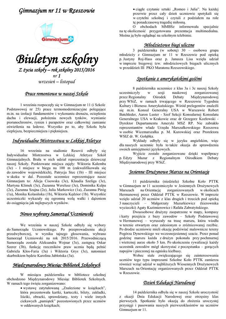 Gimnazjum nr 11 w Rzeszowie ciągłe czytanie sztuki „Romeo i Julia”. Na każdej przerwie przez cały dzień uczniowie spotykali się w czytelni szkolnej i czytali z podziałem na role tę ponadczasową tragedię miłosną. O obchodach MMBSz informowała specjalnie na tę okoliczność przygotowana prezentacja multimedialna. Można ją było oglądnąć na szkolnym telebimie. Młodzieżowe biegi uliczne Biuletyn szkolny Z życia szkoły – rok szkolny 2015/2016 nr 1 wrzesień – listopad Prace remontowe w naszej Szkole 1 września rozpoczęły się w Gimnazjum nr 11 (i Szkole Podstawowej nr 25) prace termomodernizacyjne polegające m.in. na izolacji fundamentów i wykonaniu drenażu, ociepleniu dachu i elewacji, położeniu nowych tynków, wymianie piorunochronów, rynien i parapetów oraz całkowitej zamianie oświetlenia na ledowe. Wszystko po to, aby Szkoła była cieplejsza, bezpieczniejsza i piękniejsza. Indywidualne Mistrzostwa w Lekkiej Atletyce 16 września na stadionie Resovii odbyły się Indywidualne Mistrzostwa w Lekkiej Atletyce Szkół Gimnazjalnych. Brała w nich udział reprezentacja dziewcząt naszej Szkoły. Punktowane miejsca zajęły: Wiktoria Kalemba (3e) - I miejsce w biegu na 100 m (zakwalifikowała się do zawodów wojewódzkich), Patrycja Stec (1b) - III miejsce w skoku w dal. Pozostałe uczennice reprezentujące nasze Gimnazjum to: Alicja Cisowska (3e), Klaudia Szeliga (3e), Martyna Klimek (3e), Zuzanna Werelusz (3e), Dominika Kulpa (2e), Zuzanna Szajna (2e), Julia Markowicz (1a), Zuzanna Piróg (1a), Monika Kolasińska (1b), Wiktoria Kędzior (1b). Wszystkie uczestniczki wykazały się ogromną wolą walki i dążeniem do osiągnięcia jak najlepszych wyników. Nowo wybrany Samorząd Uczniowski We września w naszej Szkole odbyły się wybory do Samorządu Uczniowskiego. Po przeprowadzeniu akcji przedwyborczej, w wyniku tajnego głosowania, wybrano Samorząd Uczniowski na rok 2015/2016. Przewodniczącą Samorządu została Aleksandra Wojnar (3e), zastępcą Oskar Szerer (3b), funkcję rzeczników praw ucznia będą pełnić Gabriela Kłos-Faria (3a) i Wiktoria Grys (3e), natomiast skarbnikiem będzie Karolina Jabłońska (3a). Międzynarodowy Miesiąc Bibliotek Szkolnych W miesiącu październiku w bibliotece szkolnej obchodzono Międzynarodowy Miesiąc Bibliotek Szkolnych. W ramach tego święta zorganizowano: wystawę zatytułowaną „Znalezione w książkach”, która prezentowała kartki, karteczki, bilety, zakładki, liściki, obrazki, sprawdziany, testy i wiele innych ciekawych „pamiątek” pozostawionych przez uczniów w oddawanych książkach; 3 października (w sobotę) 30 – osobowa grupa młodzieży z Gimnazjum nr 11 w Rzeszowie pod opieką p. Justyny Roj-Hass oraz p. Janusza Lisa wzięła udział w imprezie biegowej tzw. młodzieżowych biegach ulicznych w przeddzień III PKO Maratonu Rzeszowskiego. Spotkanie z amerykańskimi gośćmi 8 października uczennice z klas 3a i 3c naszej Szkoły uczestniczyły w sesji naukowej zorganizowanej przez Regionalny Ośrodek Debaty Międzynarodowej przy WSiZ, w ramach trwającego w Rzeszowie Tygodnia Kultury i Biznesu Amerykańskiego. Wśród prelegentów znaleźli się m.in. Konsul Generalny USA w Warszawie Robert Batchleder, Aaron Luster - Szef Sekcji Konsularnej Konsulatu Generalnego USA w Krakowie oraz dr Grzegorz Kozłowski Dyrektor Departamentu Ameryki MSZ RP. Nie zabrakło reprezentantów władz Urzędu Marszałkowskiego Rzeszowa w osobie Wicemarszałka p. M. Kurowskiej oraz Prorektora WSIZ dr. W. Gołąbka. Wykłady odbyły się w języku angielskim, więc dla naszych uczennic była to także okazja do sprawdzenia swoich umiejętności językowych. Wyjście zostało zorganizowane dzięki współpracy p. Edyty Mazur z Regionalnym Ośrodkiem Debaty Międzynarodowej przy WSiZ. Jesienne Drużynowe Marsze na Orientację 11 października (niedziela) Szkolne Koło PTTK w Gimnazjum nr 11 uczestniczyło w Jesiennych Drużynowych Marszach na Orientację zorganizowanych w okolicach Hermanowej przez Oddział PTTK w Rzeszowie. W imprezie wzięło udział 20 uczniów z klas drugich i trzecich pod opieką 3 nauczycieli – Małgorzaty Mazurkiewicz (kierownika wycieczki) Agaty Kazimierowicz i Rafała Zabratyńskiego. Dwuosobowe drużyny zaopatrzone w mapy, kompasy i karty przejścia z bazy zawodów – Szkoły Podstawowej w Hermanowej – wyruszały na trasę marszu, która wiodła w terenie otwartym oraz zalesionym o zróżnicowanej rzeźbie. Po drodze uczniowie mieli okazję podziwiać malownicze tereny Pogórza Dynowskiego we wczesnojesiennej szacie. Przez ponad godzinę marszu każda z drużyn pokonała przy pochmurnej i wietrznej aurze około 5 km. Po ukończeniu rywalizacji każdy uczestnik zawodów mógł skorzystać z poczęstunku – gorących napojów i pieczonej na ognisku kiełbasy. Wobec stale zwiększającego się zainteresowania uczniów tego typu imprezami Szkolne Koło PTTK zamierza również wziąć udział w najbliższych Wiosennych Drużynowych Marszach na Orientację organizowanych przez Oddział PTTK w Rzeszowie. Dzień Edukacji Narodowej 14 października odbyła się w naszej Szkole uroczystość z okazji Dnia Edukacji Narodowej oraz otrzęsiny klas pierwszych. Spotkanie było okazją do złożenia uroczystej przysięgi i pasowania naszych pierwszoklasistów na uczniów Gimnazjum nr 11. Serdecznie dziękujemy wszystkim za przybycie i stworzenie wyjątkowej atmosfery. obecnym Uczniowskie prawybory parlamentarne 21 października w naszej Szkole zostały przeprowadzone uczniowskie prawybory parlamentarne. Wzięło w nich udział 316 uczniów na 371 uprawnionych do głosowania (frekwencja wyniosła 85 %). Wyniki prawyborów przedstawiały się następująco: 1. Komitet Wyborczy KORWIN – 63 głosy 2. KW Prawo i Sprawiedliwość – 59 głosów 3. KW Kukiz’15 – 47 głosów 4. KW Platforma Obywatelska – 26 głosów 5. KW Grzegorza Brauna „Szczęść Boże” – 22 głosy 6. KW Nowo