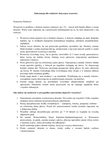 Informacja dla rodziców dotycząca wszawicy Szanowny Rodzicu! Wszawica to problem, z którym możesz zmierzyć się i Ty – nawet jeśli bardzo dbasz o swoje dziecko. Warto więc zapoznać się z poniższymi informacjami po to, by móc skutecznie z nią walczyć: 1. Wszawica może pojawić się w każdym miejscu, w którym znajdują się duże skupiska ludzkie, np. w środkach transportu komunikacji miejskiej, szkołach, przedszkolach, szpitalach. 2. Należy uczyć dziecko, by nie pożyczało grzebieni, ręczników itp. Niestety czasem bliski kontakt z osobą zarażoną lub np. użytkowanie z nią tych samych szafek w szatni może spowodować wszawicę u dziecka. 3. Wszawicę wywołują wszy. Są to groźne, niewielkie (2–3 mm) owady pasożytnicze, które żywią się ludzką krwią. Istnieją wszy głowowe (najczęściej spotykane), odzieżowe i łonowe. 4. Wesz głowowa żyje na owłosionej części głowy. Najczęściej u nasady włosów składa swoje jajeczka (gnidy), z których po tygodniu wylegają się larwy. Te dojrzewają kolejne siedem dni. Wówczas zaczynają przegryzać skórę głowy, by móc odżywiać się krwią. W zamian wstrzykują ślinę wywołującą silny świąd, a w miejscu ukłucia powstaje mała swędząca grudka. 5. Gnidy mają około 1 mm średnicy i są szarobiałe. Przyklejają się u nasady włosów, szczególnie często ukrywają się za małżowinami usznymi i na potylicy. 6. Groźne mogą okazać się powikłania wywołane zdrapywaniem strupków po ugryzieniu. Zakażenie wtórne może przyczynić się do ropnego zapalenia skóry i węzłów chłonnych. Jak należy się zachować w przypadku zauważenia objawów wszawicy? 1. Natychmiast zawiadom wychowawcę dziecka. Nie wolno się wstydzić! Tylko wspólne działanie może uchronić przed powtórnym zakażeniem. 2. Stosuj specjalistyczne środki owadobójcze – szampony, lotiony, preparaty roślinne – na owłosioną skórę głowy. Przed ich zastosowaniem trzeba uważnie zapoznać się z dołączoną ulotką. 3. Wszelkie zabiegi dezynfekcyjne powtórz po 7–10 dniach ze względu na wysoką odporność gnid. 4. Na stronie Wojewódzkiej Stacji Sanitarno-Epidemiologicznej w Warszawie przeczytamy, że gnidy „można usunąć z głowy, płucząc uprzednio umyte włosy octem o stężeniu 6 proc., który powoduje ich odklejenie”. 5. Jeżeli zachoruje jeden członek rodziny, leczą się wszyscy domownicy. 6. Warto zostawić dziecko w domu, wtedy walka z wszami będzie szybsza i skuteczniejsza.