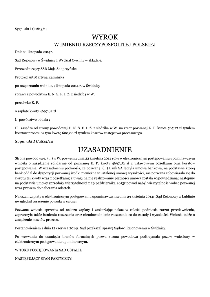Sygn. akt I C 1813/14 WYROK W IMIENIU RZECZYPOSPOLITEJ POLSKIEJ Dnia 21 listopada 2014r. Sąd Rejonowy w Świdnicy I Wydział Cywilny w składzie: Przewodniczący SSR Maja Snopczyńska Protokolant Martyna Kamińska po rozpoznaniu w dniu 21 listopada 2014 r. w Świdnicy sprawy z powództwa E. N. S. F. I. Z. z siedzibą w W. przeciwko K. P. o zapłatę kwoty 4697,82 zł I. powództwo oddala ; II. zasądza od strony powodowej E. N. S. F. I. Z. z siedzibą w W. na rzecz pozwanej K. P. kwotę 707,27 zł tytułem kosztów procesu w tym kwotę 600,00 zł tytułem kosztów zastępstwa procesowego. Sygn. akt I C 1813/14 UZASADNIENIE Strona powodowa e. (...) w W. pozwem z dnia 22 kwietnia 2014 roku w elektronicznym postępowaniu upominawczym wniosła o zasądzenie solidarnie od pozwanej K. P. kwoty 4697,82 zł z ustawowymi odsetkami oraz kosztów postępowania. W uzasadnieniu podniosła, że pozwaną (...) Bank SA łączyła umowa bankowa, na podstawie której bank oddał do dyspozycji pozwanej środki pieniężne w ustalonej umową wysokości, zaś pozwana zobowiązała się do zwrotu tej kwoty wraz z odsetkami; z uwagi na nie realizowanie płatności umowa została wypowiedziana; następnie na podstawie umowy sprzedaży wierzytelności z 29 października 2013r powód nabył wierzytelność wobec pozwanej wraz prawem do naliczania odsetek. Nakazem zapłaty w elektronicznym postępowaniu upominawczym z dnia 29 kwietnia 2014r. Sąd Rejonowy w Lublinie uwzględnił roszczenie powoda w całości. Pozwana wniosła sprzeciw od nakazu zapłaty i zaskarżając nakaz w całości podniosła zarzut przedawnienia, zaprzeczyła także istnieniu roszczenia oraz nieudowodnienie roszczenia co do zasady i wysokości. Wniosła także o zasądzenie kosztów procesu. Postanowieniem z dnia 12 czerwca 2014r. Sąd przekazał sprawę Sądowi Rejonowemu w Świdnicy. Po wezwaniu do usunięcia braków formalnych pozwu strona powodowa podtrzymała pozew wniesiony w elektronicznym postępowaniu upominawczym. W TOKU POSTĘPOWANIA SĄD USTALIŁ NASTĘPUJĄCY STAN FAKTYCZNY: W dniu 17 lipca 2003r. pozwana zawarła z (...) Bankiem (...) SA w K. umowę kredytu na zakup artykułów przemysłowych i usług. Kredyt miał być spłacony do 17 VIII 2006r. DOWÓD: umowa z dnia 17 VII 2003r. k. 27 harmonogram spłaty k. 28 W związku z zaległością w spłacie rat Bank pismem z dnia 20 września 2004r wypowiedział umowę kredytu z 30 dniowym okresem wypowiedzenia. DOWÓD: pismo z dnia 20 IX 2004r. k.28v W dniu 22 kwietnia 2014r strona powodowa wystawiła wyciąg z ksiąg rachunkowych funduszu w treści którego wskazano, że w dniu 29 października 2013r nabyła od G. (...) Bank SA w W. wierzytelność wobec dłużnika K. P. wynikającą z zawartej umowy bankowej o nr (...) w kwocie 4.697,82 zł. DOWÓD: wyciąg z ksiąg rachunkowych Funduszu k. 25 W dniu 26 kwietnia 2013 roku strona powodowa zawarła z (...) Bank SA w W. umowę przelewu wierzytelności. DOWÓD: umowa z 26 IV 2013 k. 33-36 Załącznik k. 24 Pismem z dnia 8 listopada 2013 roku strona powodowa wezwała pozwaną do zapłaty zawiadamiając o przelewie wierzytelności. DOWÓD: wezwanie do zapłaty k. 26 W TAK USTALONYM STANIE FAKTYCZNYM SĄD ZWAŻYŁ: Powództwo podlegało oddaleniu jako przedawnione. Strona powodowa wniosła o zasądzenie od pozwanej kwoty 4.697,82 zł podnosząc, że kwota ta stanowi należność wynikającą z umowy bankowej zawartej przez pozwaną z bankiem, która to wierzytelność została nabyta przez stronę powodową. Zgodnie z treścią art. 69 prawa bankowego (29 VIII 1997r, Dz. U. 2002/72/655 z późn. zm.) przez umowę kredytu bank zobowiązuje się oddać do dyspozycji kredytobiorcy na czas oznaczony w umowie kwotę środków pieniężnych z przeznaczeniem na kreślony cel, a kredytobiorca zobowiązuje się do korzystania z niej na warunkach określonych w umowie, zwrotu kwoty wykorzystanego kredytu wraz z odsetkami w oznaczonych terminach spłaty oraz zapłaty prowizji od udzielonego kredytu. Pozwana w sprzeciwie podniosła min. zarzut przedawnienia. Tym samym na początku rozważań odnieść się należy do tego zarzutu. Zgodnie art. 117 §2 k.c. po upływie terminu przedawnienia ten, przeciwko komu przysługuje roszczenie, może uchylić się od jego zaspokojenia, chyba że zrzeka się zarzutu przedawnienia. Ponadto, w myśl art.118 k.c., jeżeli przepis szczególny nie stanowi inaczej, termin przedawnienia dla roszczeń o świadczenia związane z prowadzeniem działalności gospodarczej wynosi trzy lata. Zgodnie więc z powołanymi wyżej przepisami roszczenie strony powodowej – jako związane z prowadzoną przez stronę powodową działalnością gospodarczą - ulegają 3 letniemu terminowi przedawnienia. Taki sam okres przedawnienia występuje w przypadku roszczeń banku jako przedsiębiorcy prowadzącego działalność gospodarczą. Zgodnie z art. 120 k.c. bieg przedawnienia rozpoczyna się od dnia, w którym roszczenie stało się wymagalne. Z zebranego materiału dowodowego (pisma Banku) wynika, że pismem z 20 IX 2004r Bank wypowiedział umowę kredytu z 30 dniowym terminem wypowiedzenia. Wprawdzie strona powodowa nie wykazała czy pismo to zostało pozwanej doręczone i w jakiej dacie, jednak przyjmując okres niezbędny do awizacji przesyłki uznać należy, że okres wypowiedzenia upłynął 20 XI 2004r. Licząc od tej daty roszczenie strony powodowej przedawniło się 20 XI 2007r. Z uwagi na brak dowodu doręczenia przyjąć należy, że umowa mogła nie zostać skutecznie wypowiedziana. W takim przypadku roszczenie o zapłatę kwoty kredytu – zgodnie z harmonogramem spłat – stało się wymagalne 17 VII 2006r. Tym samym – nawet licząc od tej najpóźniejszej daty roszczenie strony powodowej przedawniło się najpóźniej 17 VII 2009r. (pozew wniesiono w dniu 22 IV 2014r. Zgodnie z treścią art. 123 kc bieg przedawnienia przerywa się przez każdą czynność przed sądem lub innym organem powołanym do rozpoznawania