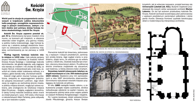 NIECA ICKIE KA AR TO WS WOD OPO DUS KA GR OD ZK A ŚWI ĘTO KOŚC IUSZ KI KOŁŁĄTAJA PLA A PLAC KATEDRALNY PRYMASA WYSZYŃSK KA HEM PLAC WOLNOŚCI SK W LE TGERA Ó NA A CZ WI ŃS GROT BR PLAC ŁOKIETKA DY UNIWERSYTECKA IEŚCIE AR KA ZEDM RN KÓW RYNEK WESOŁA Z PR A MIŁ YS TR DB A AŁK SZ CZ ER B OW SK IEG OPR. BIURO MKZ O RUS KA JS MO NA A OW SŁ Y EM ZA ZY CK A RAA A BEG O G POKOJ Ó U KOŚCIÓŁ św. KRZYŻA od strony ul. Radziszewskiego. RN Pierwotnie kościół był drewniany, jednonawoA M O ŚC wy, z węższym i niższym prezbiterium, zamknięIC KI EG O tym prostą ścianą. Jego wygląd znamy w przybliżeniu, dzięki temu, że ukazano go na widoku Lublina z 1618 roku. Dookoła kościoła był cmenGR AN tarz, otoczony drewnianym płotem. Po północnej IC ZN A stronie cmentarza znajdowało się ossuarium, ŚR OD czyli kostnica, w której zbierano kości zmarłych. KO W A Drewniany kościół mieszczanie lubelscy zaWS CH OD NIA stąpili murowanym w 1 ćw. XVII stulecia (przed 1623 rokiem). Osadzono przy nim sprowadzoRO WE RO nych w roku 1697 dominikanów obserwantów. AL WA .P IŁS UD Dominikanie wybudowali niewielki klasztor przySK IEG legający do kościoła od północy. O W roku 1800 nastąpiła kasata zakonu, a zaST RA ŻA CK budowania przejęło wojsko austriackie, wkrótce A GŁ rozbudowując założenie na szpital i koszary, wy-ĘBOKA OC korzystywane później także przez wojsko polskie HO TN IC ZA (w czasach Królestwa Kongresowego) i rosyjskie. Po I wojnie światowej, dzięki wstawiennictwu MU ZY CZ NA Józefa Piłsudskiego, gmachy Koszar ŚwiętoRZUT KOŚCIOŁA IEGO CHOPIN AKADEMIC OW DREWNIANY KOŚCIÓŁ św. KRZYŻA na widoku Lublina z 1618 roku. A CÓW LIPOW OBROŃ E IE PR O UT R WIA SKIEJ-CURI KOŚCIÓŁ św. KRZYŻA ZA AM BE PEO SKŁODOW LIC KR O KIEG EWS A OWSK YŃSKA NÓW ISZ RADZ KRAK KRAKOWSKIE PRZEDMIEŚCIE DOLNA PANNY MARII ŁOP ACIŃ SKIE GO CŁAW KAPUC ERA E RA RU PLAC RYBNY PLAC LITEWSKI ICKA WET I ARMII WP EL EWANG WIENIAWSKA Kościół Św. Krzyża zapewne powstał ok. poł. XV w. Zlokalizowany był poza miastem intra muros, na terenach pól miejskich, w obszarze własności sióstr brygidek, przy granicy miasta, w pobliżu traktu krakowskiego. Jego funkcje łączone są z ostatnia posługą skazańców traconych na ulokowanej w pobliżu szubienicy miejskiej, wzmiankowanej po raz pierwszy w 1408 roku. Według legendy fundacja kościoła miała miejsce w 1434 roku i była pokutą sprawcy (kupca Henryka z Gdańska) za kradzież relikwii Drzewa Krzyża Świętego z lubelskiego kościoła dominikanów. Jak głosiła legenda, woły ciągnące wóz stanęły za miastem i nie chciały iść dalej, co kupiec Henryk zinterpretował jako znak boży, zawrócił od miasta oddać zrabowaną relikwię, a w miejscu, gdzie stanęły woły, ufundował kościół. Kościół mógł pełnić również funkcję symboliczną, związaną ze wspomaganiem pobożności pasyjnej ówczesnych Lublinian. Jego lokalizacja na wzgórzu po zachodniej stronie miasta, w pobliżu miejsca straceń, mogłą być celowo wybrana, jako analogiczna do lokalizacji miejsca Męki Chrystusa – Golgoty, względem Jerozolimy. O takiej funkcji kościoła świadczą także znane ze źródeł pisanych z pocz. XVII wieku informacje o nabożeństwach Męki Pańskiej, jakie odbywały się w tym kościele w piątki. ALEJ JASNA CY LUB ŁA 3-GO MAJA OGRODOWA ZA GOS DŁU A SK SPOKOJNA EW SZ CICHA RADZIWIŁŁOWSKA Wielki post to okazja do przypomnienia zachowanych w krajobrazie Lublina dokumentów kultu pasyjnego, szczególnie rozpowszechnionego w późnym średniowieczu. Jednym z takich śladów jest pełniący dzisiaj funkcję kościoa akademickiego, kościół Św. Krzyża. krzyskich, jak je wówczas nazywano, przejął tworzący się PLAC ST Uniwersytet Lubelski (ob. KUL). Budynki wojskowe przyZAMKOWY AS ZI CA stosował dla nowych celów warszawski architekt Marian Lalewicz. On też był autorem przebudowy kościoła Św. A ALSK KOW Krzyża. Kościół zachował wcześniejszy plan jednonawowy z węższym prezbiterium zamkniętym półkoliście i dolne partie murów. Elewacja frontowa uzyskała barokizujący detal w modernistycznej interpretacji architekta. JNA KA DO FURMAŃSKA EL S Kościół Św. Krzyża SZUBIENICA IEGO LESZCZYŃSK LN CHMIELNA SKIE